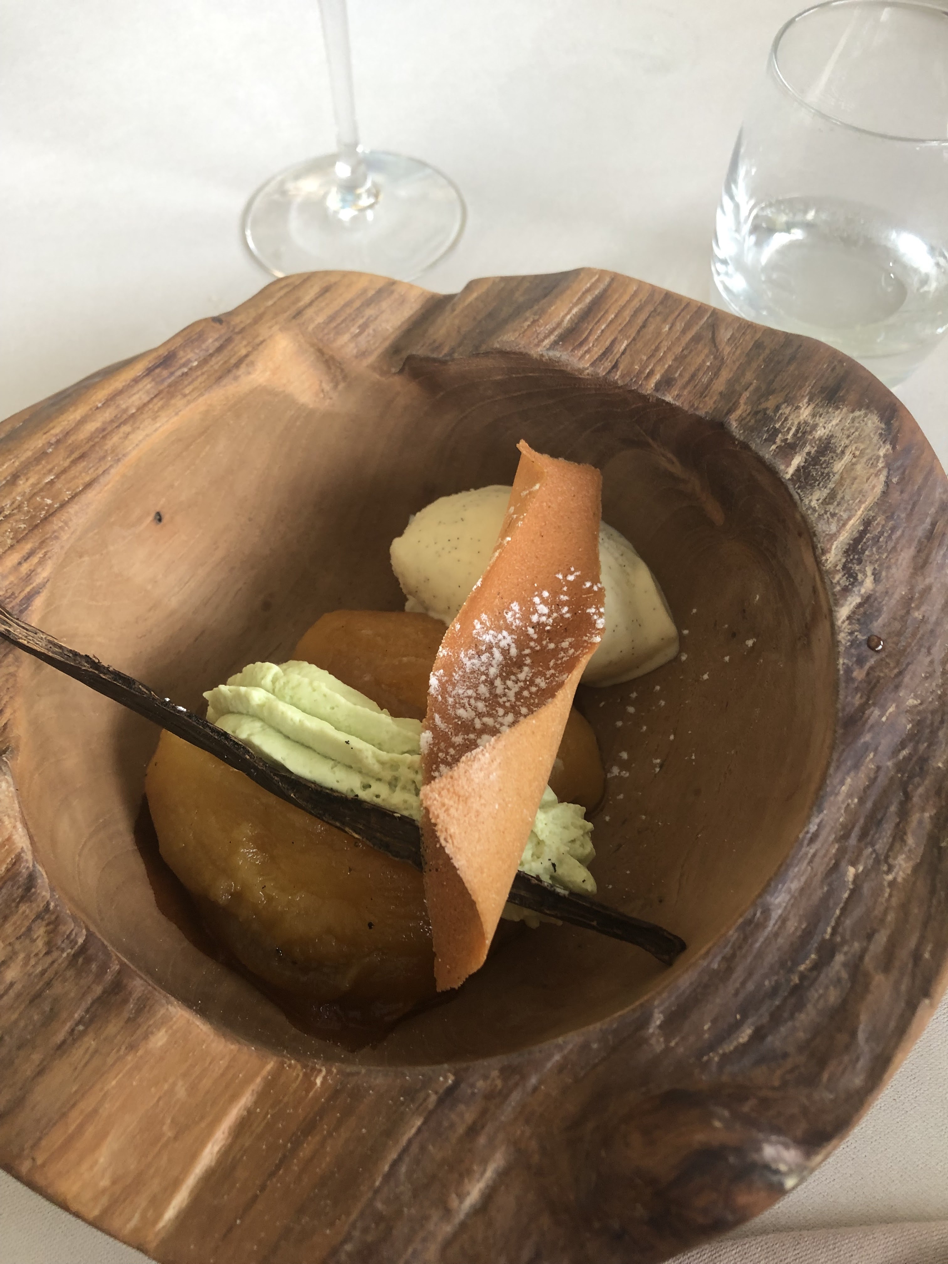 Les plats sont bons avec des goûts intéressants mais cela ne vaut pas le prix déboursé : minimum 47 euros le menu obligatoire en trois plats le soir. Par ailleurs, nous avons trouvé le service très lent : 4 heures de service pour arriver au bout du dîner avec beaucoup d’attente entre les plats… Nous avons aussi été un peu surpris du dessert servi dans une noix de coco : impossible de manger l’intérieur de la noix de coco, trop dure et le tout est servi sans couteau pour la découper… pour un restaurant gastronomique nous nous serions attendus à une meilleure experience.