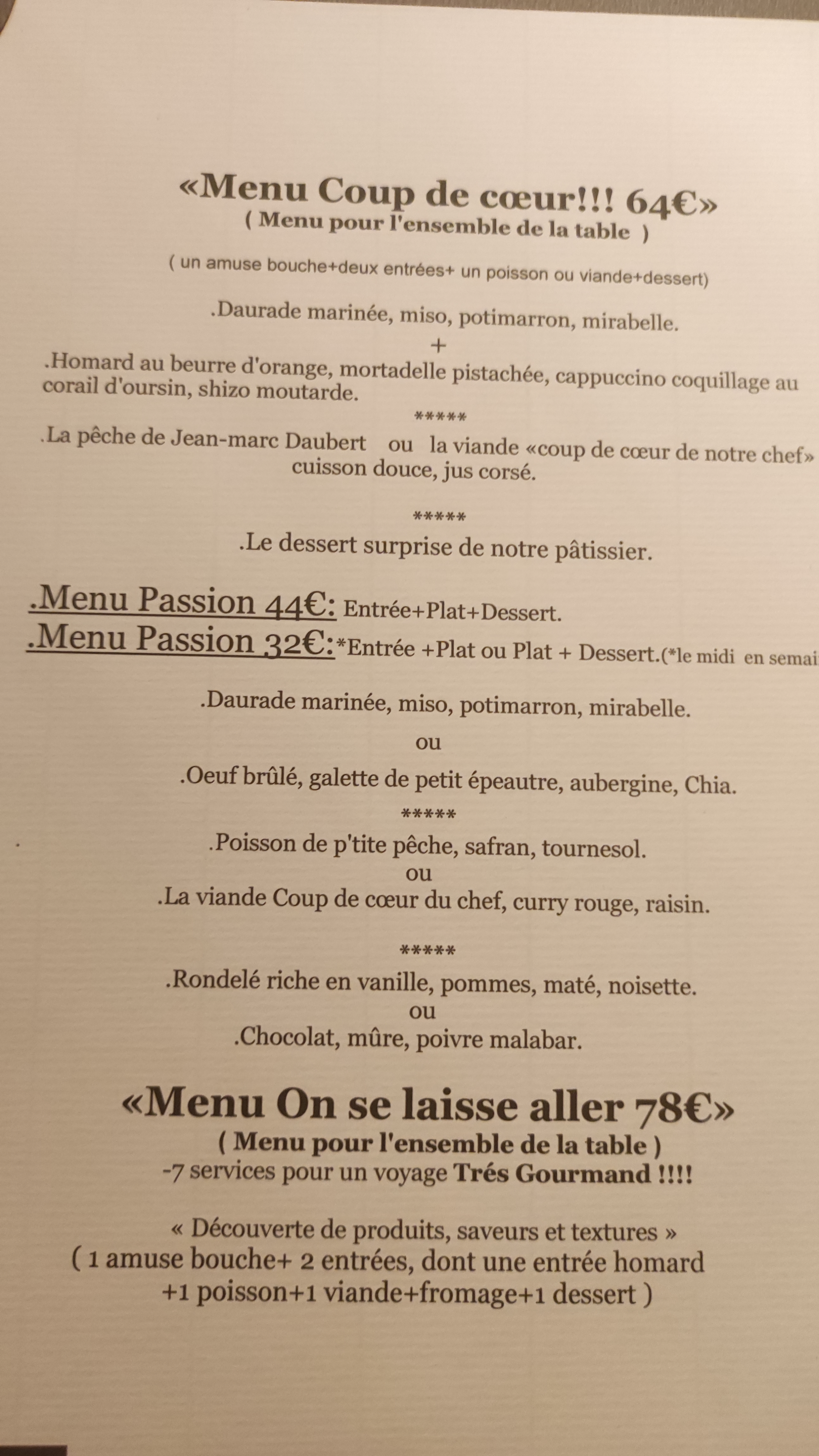 Seulement un menu à 42 et à 59 €. Si encore la cuisine avait été extraordinaire et les quantités suffisantes, ce qui était loin d'être le cas. 2 crevettes en entrée, les légumes pas cuits, et le dessert minimaliste. Il vaudrait mieux ne pas avoir d'entremet, mais en avoir suffisamment dans l'assiette. On sort déçus, avec la faim, et le sentiment de s'être fait arnaquer. Déçu également par rapport aux avis non justifiés dont ce restaurant est gratifié sur ce site. Ne vous faites pas prendre, à éviter absolument.