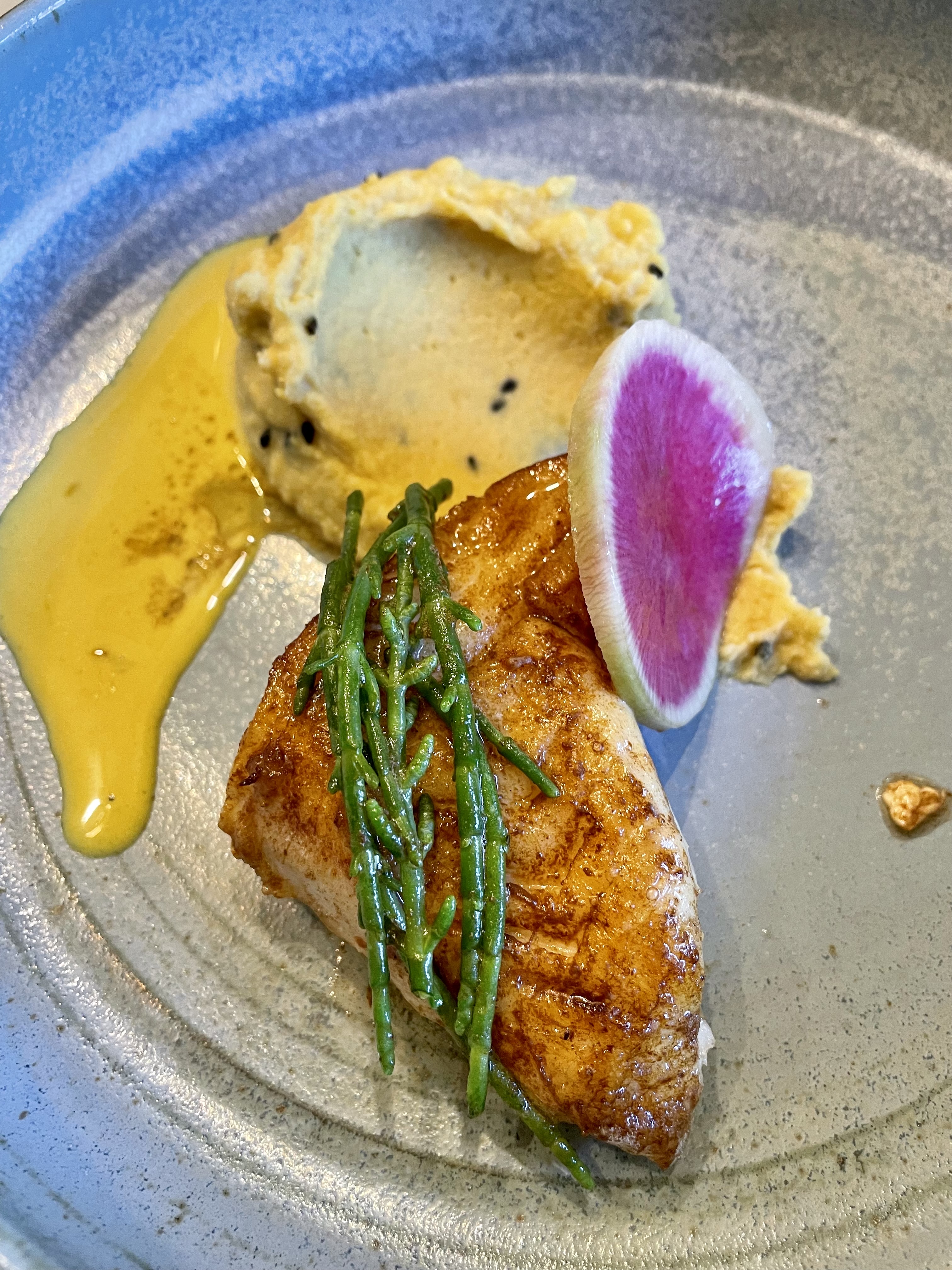 Une superbe découverte d un restaurant gastronomique À berniere sur mer. Une exploration de nouvelles sauveurs avec un saumon glace betteraves et une sauce cervelet plus que succulente. Des agastaches pepsy que nous ne connaissions pas. Que dire du velouté tome d Isigny et pdt, c est un bol qu il faudrait 😋. Que d'éloges... allez vous régaler...
