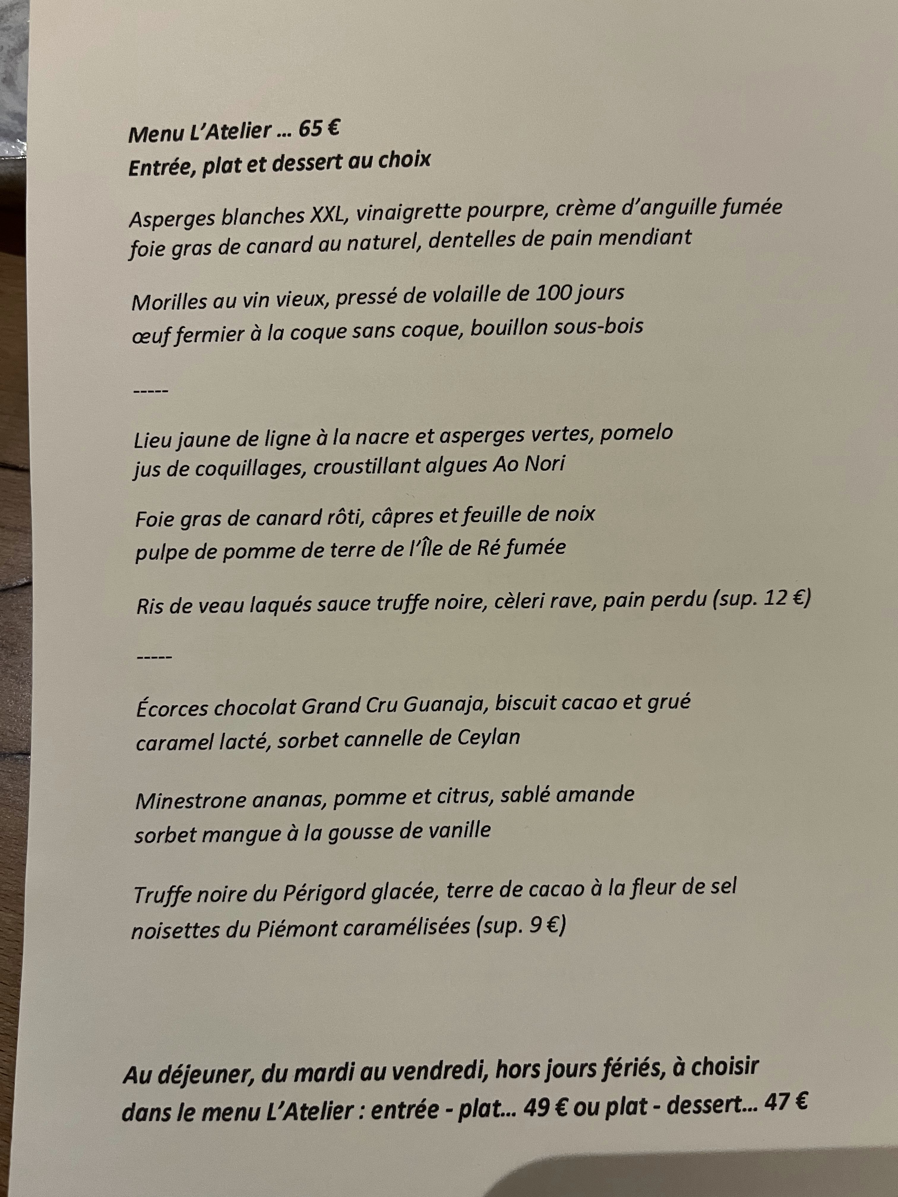 Au top, de l'accueil à l assiette en passant par le verre, j'ai adoré. Une nouvelle cave du plus bel effet, bien entendu ce qu'elles contiennent relevé du divin. La cuisine est toujours aussi fine et équilibrée, un régal. C est un détail peut-être, mais les nouveaux couteaux Nontron sont du plus bel effet.
