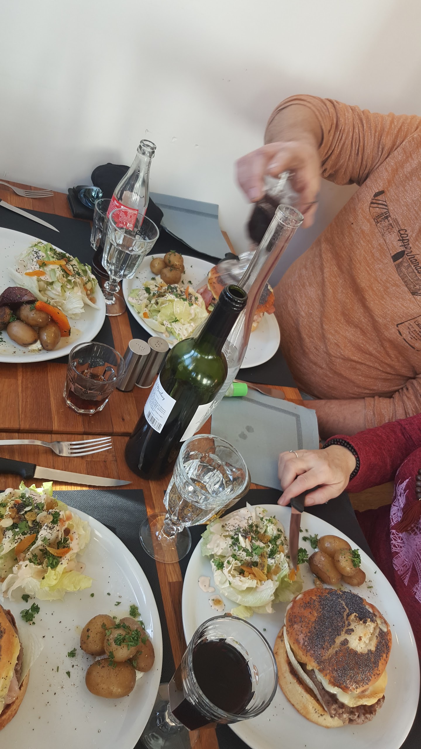 Wow! C’était super bon. Nous avons eu le hamburger avec chèvre, pesto et tomate, et le pic de canard avait une excellente marinade. La viande était excellente qualité! Très contente et plein