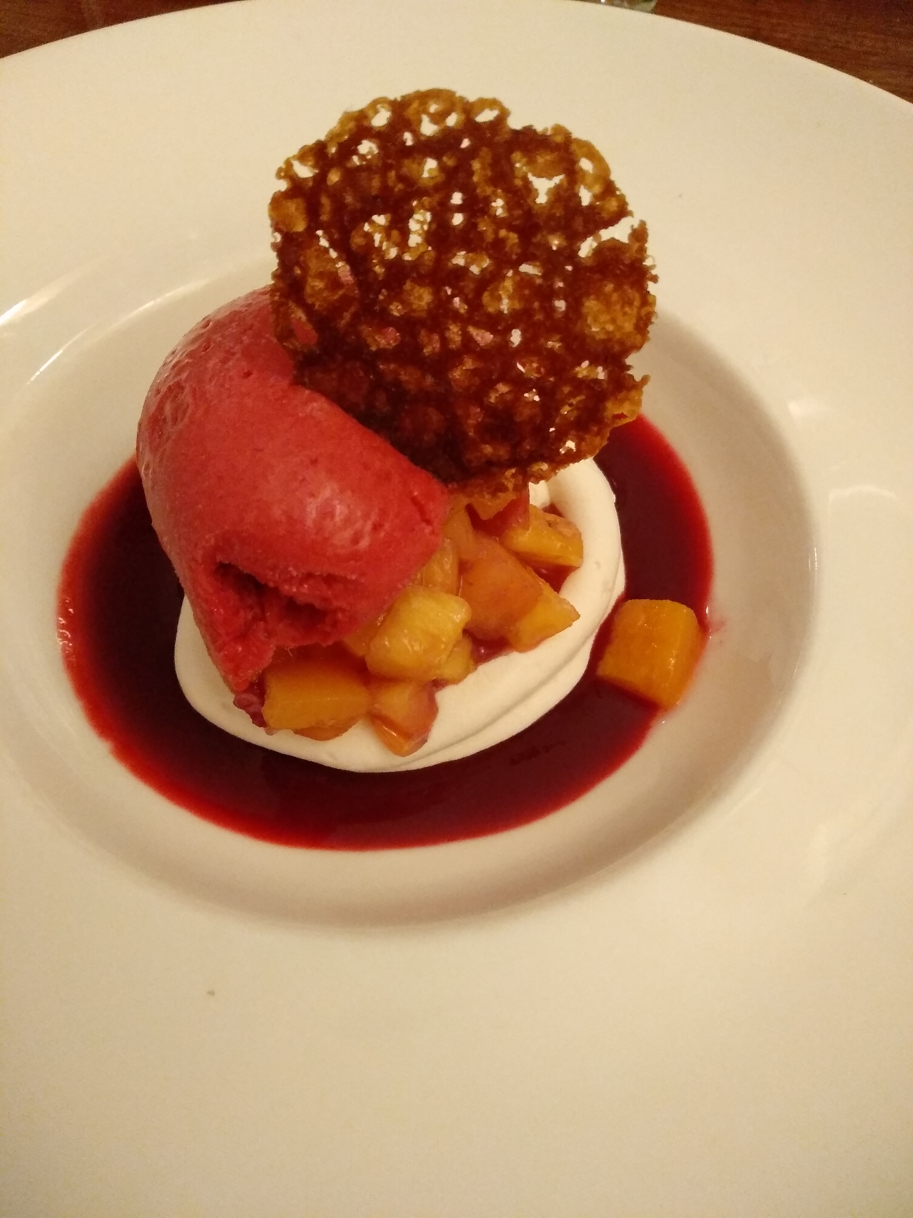 Le service était très gentil et avenant et le vin était superbe mais le canard était coriace et la panure reposait dans une bouillie de purée et de sauce. Je m'attendais à quelque chose de plus savoureux🙁