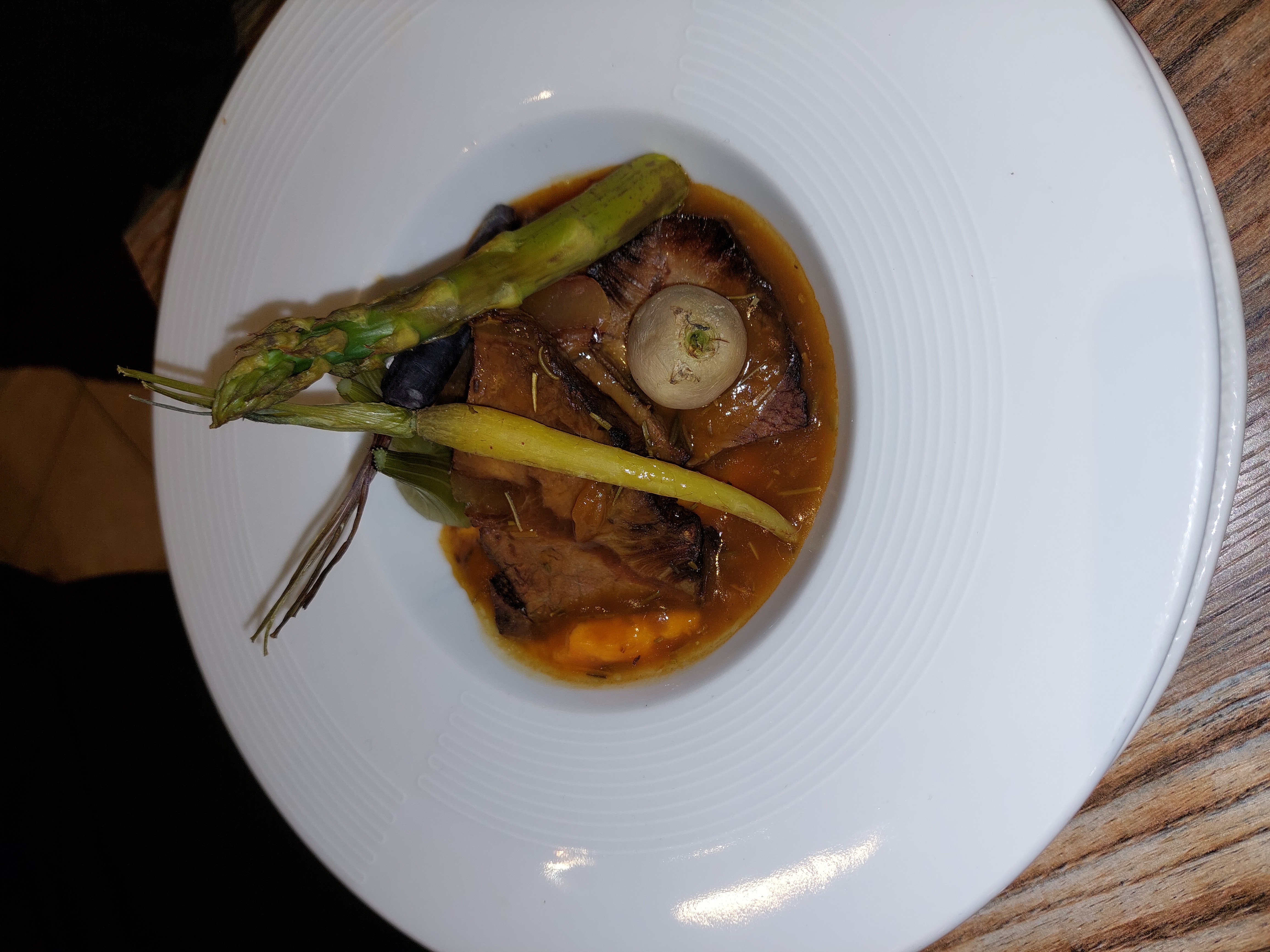 Plat vraiment mauvais. Viande très sèche, cuite de la veille, voire plus, quasi inmangeable, aucune saveur. Flute a champagne sale. Le vin rouge commandé pour boire avec le plat n a jamais été servi, même après l avoir réclamé.. Service pas professionnel du tout. Restaurant a fuir.