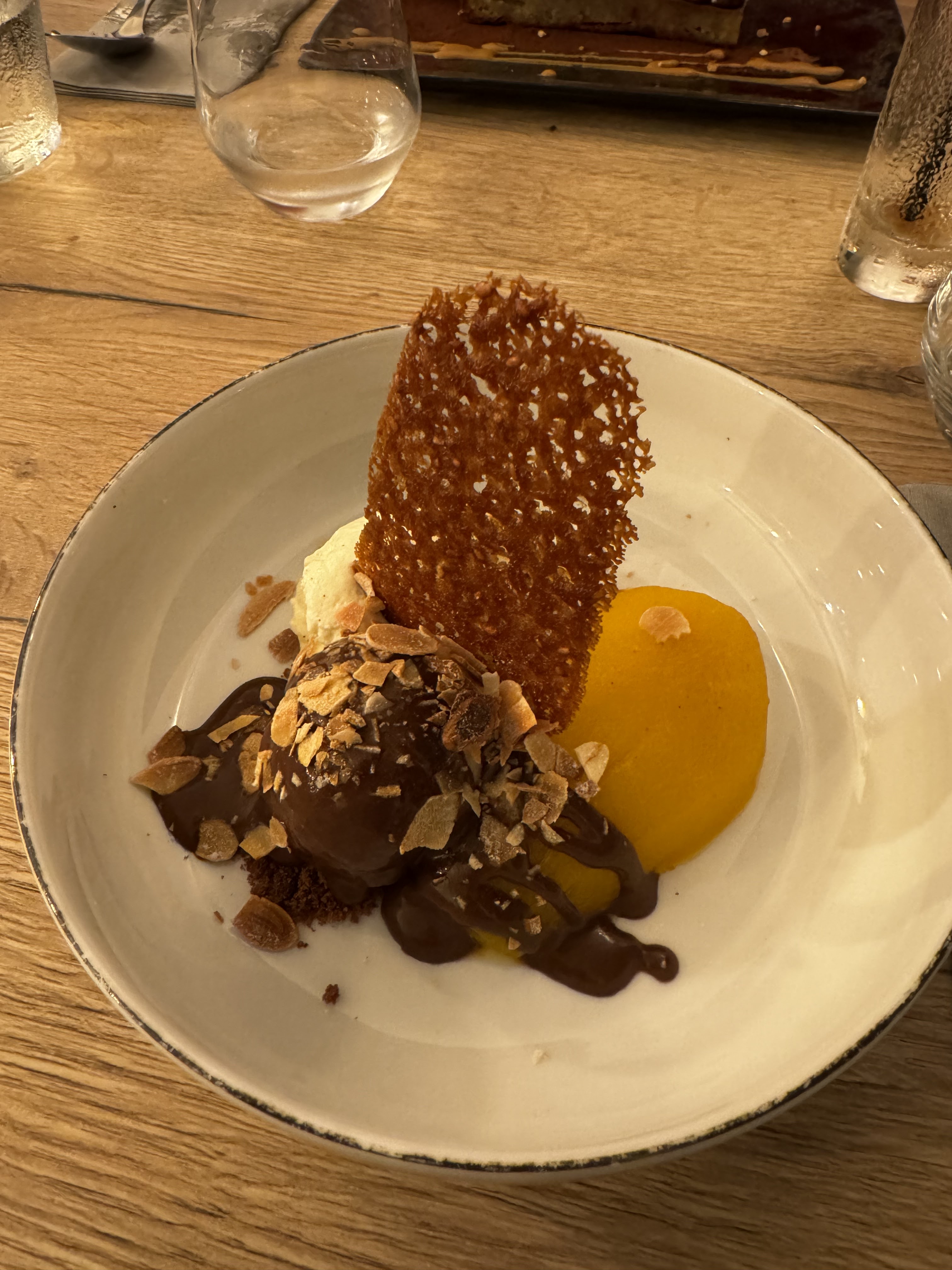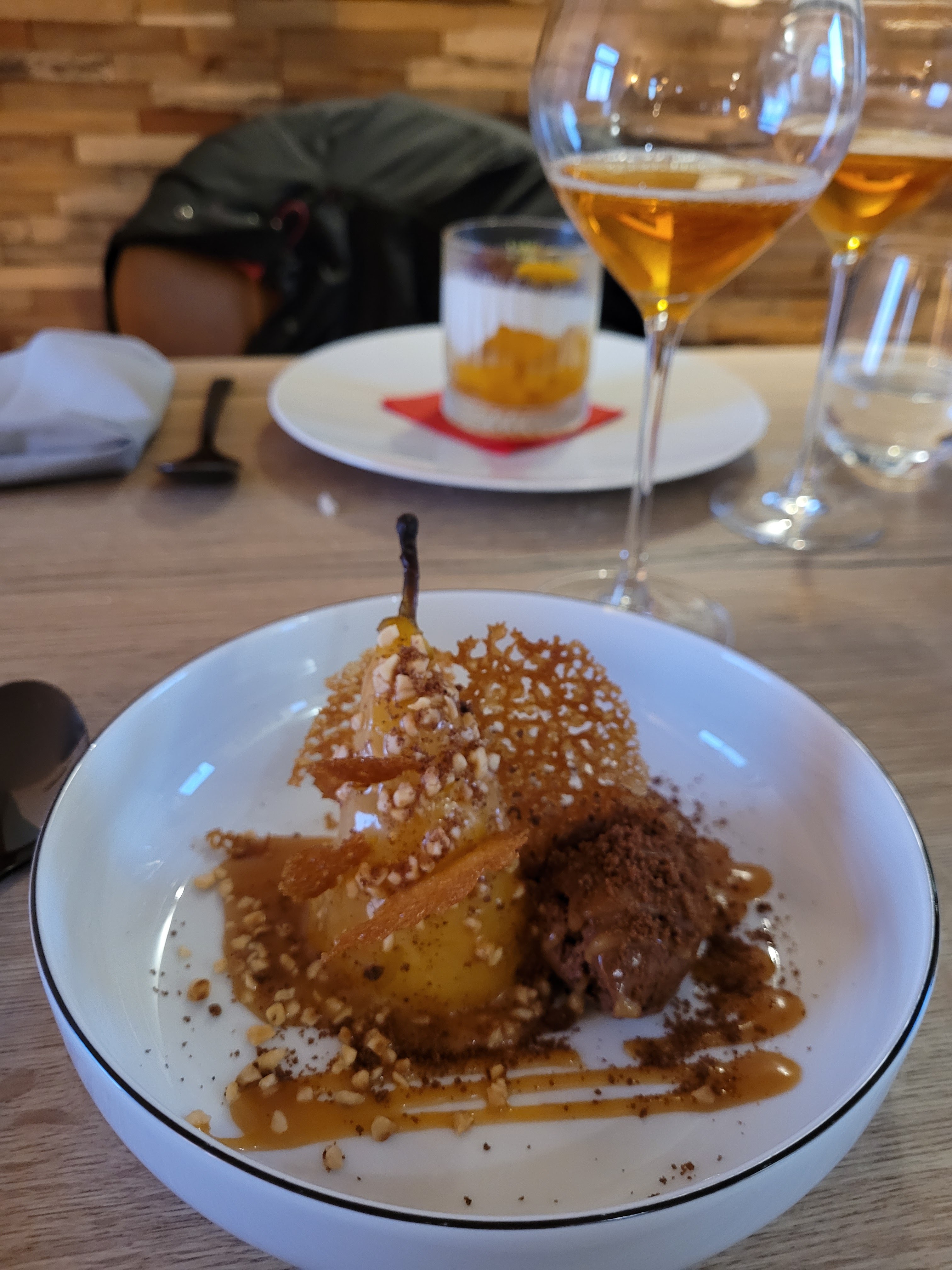 Très décevant! Entrée très fade (on ne distingue pas le goût du cannelloni de celui du crabe!). Pas de sel sur la table pour assaisonner le plat et lui donner un peu de goût! Plat (filet de daurade) délicieux, savoureux! Le dessert à été une catastrophe…. Poire belle Hélène ou il n’est pas mentionné sur le menu que la poire est marinée dans des épices! J’en fait part à la serveuse et met mon plat de côté….je ne pourrai le manger! Aucun dessert de substitution ou de gestes en fin de repas! Bref j’ai payé 28 euros pour un filet de daurade…