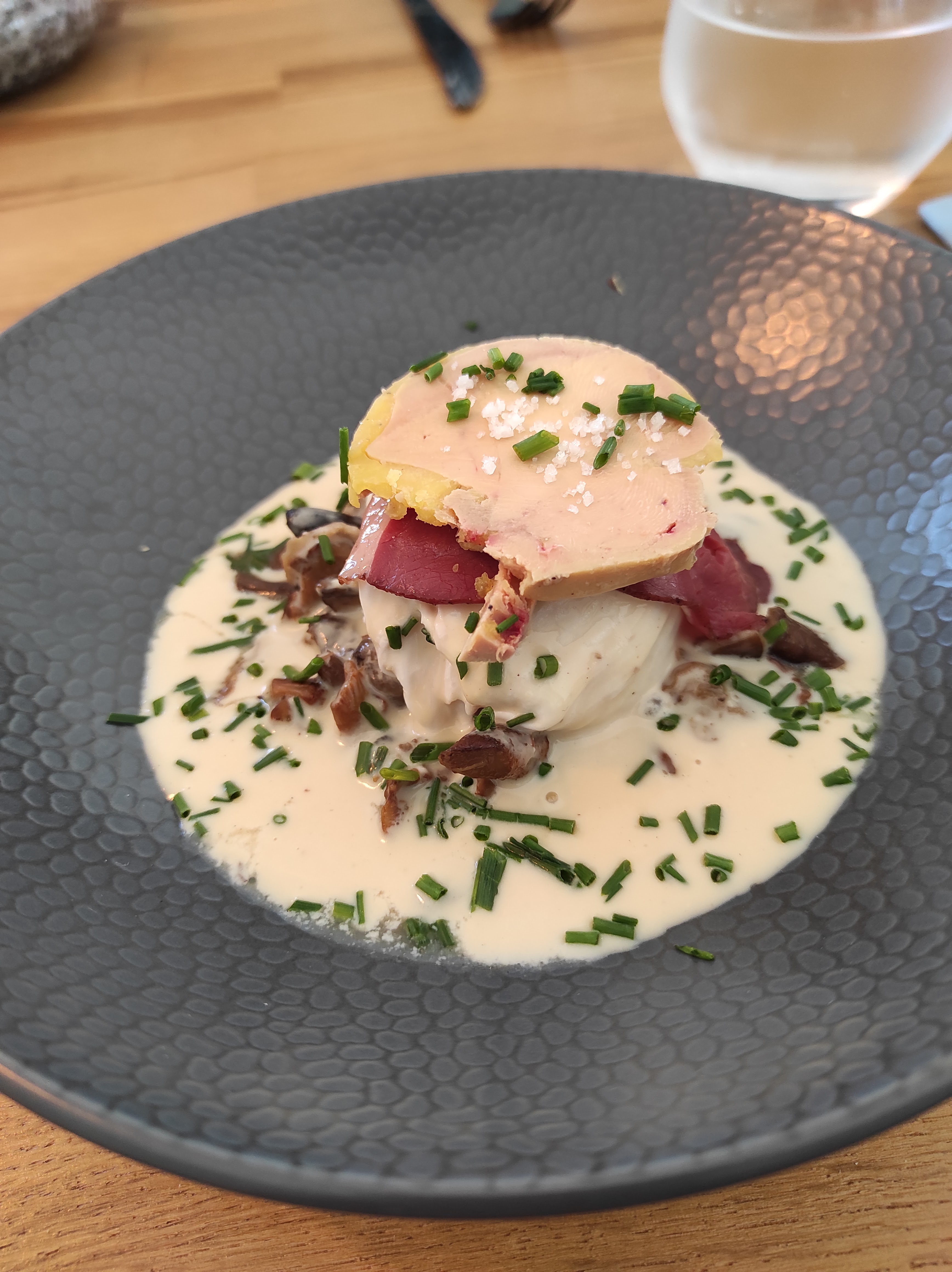 Déçue par la cuisine. Pour l’entrée, j’avais pris un cannelloni au crabe. C’était plutôt un cannelloni au sarrasin avec un peu de crabe. Si je l’avais su, je n’aurais pas pris cette entrée. Pour le plat, c’était un tournedos de bœuf avec de la purée. La viande était très bonne mais la purée très salée. Nous l’avons laissée dans l’assiette. J’ai invité l’hôtesse de salle à goûter. Elle est venue s’excuser car le chef et le sous-chef avaient tous deux salés…. Ils ont eu la gentillesse de m’offrir la bouteille d’eau.