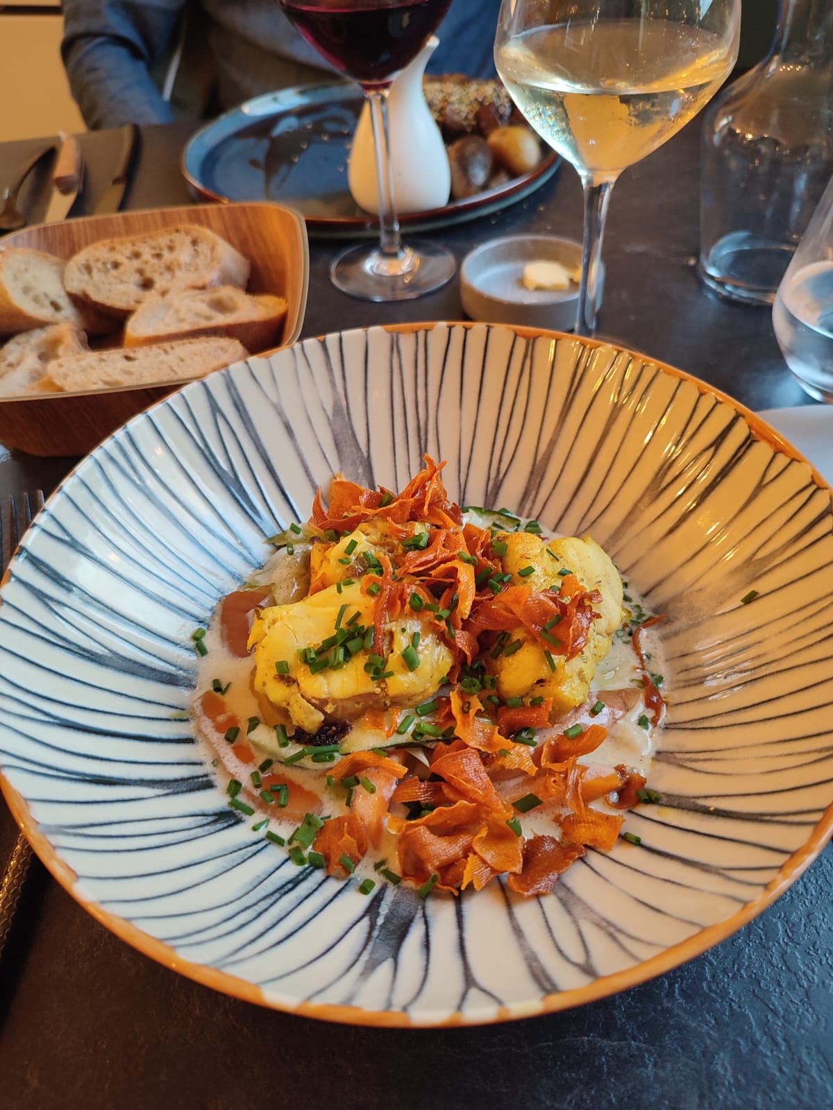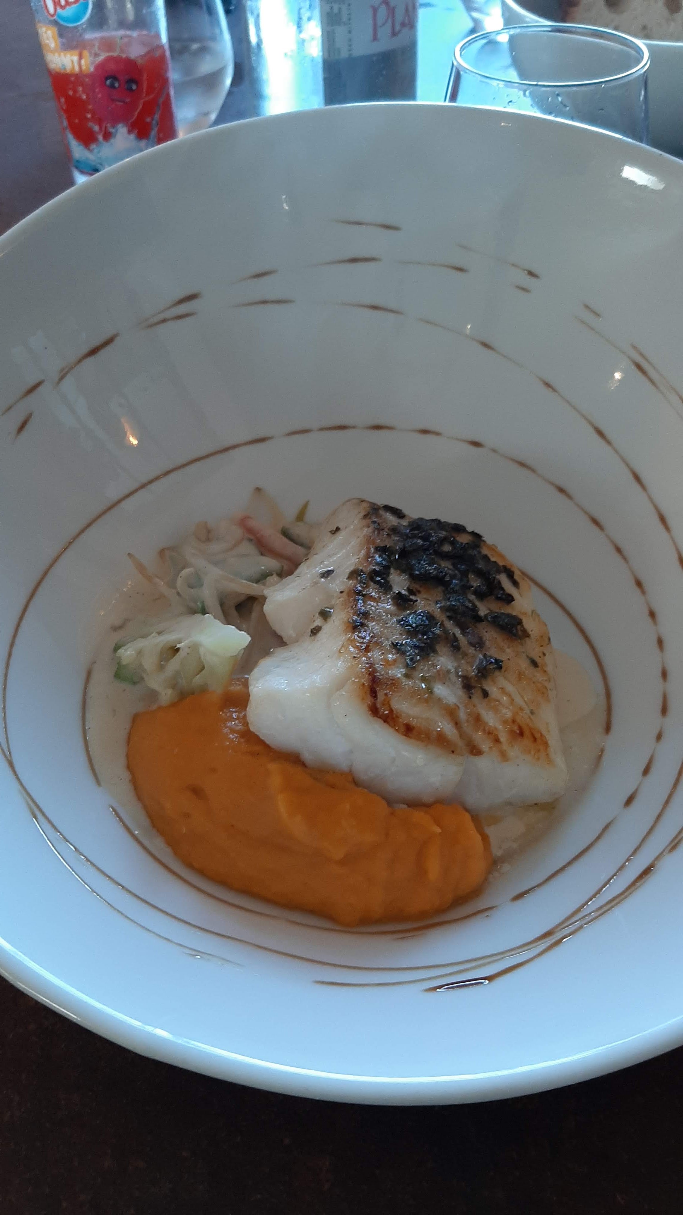 Déjà, supers fauteuils ! Quel plaisir de manger confortablement ! Menu à 24.50, rapport qualité prix parfait ! J'ai eu la chance de découvrir avec votre Dos de Lieu une sauce au beurre vanillée. Contraste délicieux ! L'entrée aussi était délicieuse ! Si je pouvais, une demie étoile en moins pour le dessert qui était certes bon, mais un cran en dessous de l'entrée/plat ! (après peut être était ce du a l'exceptionnel du début du menu ? 🤗)