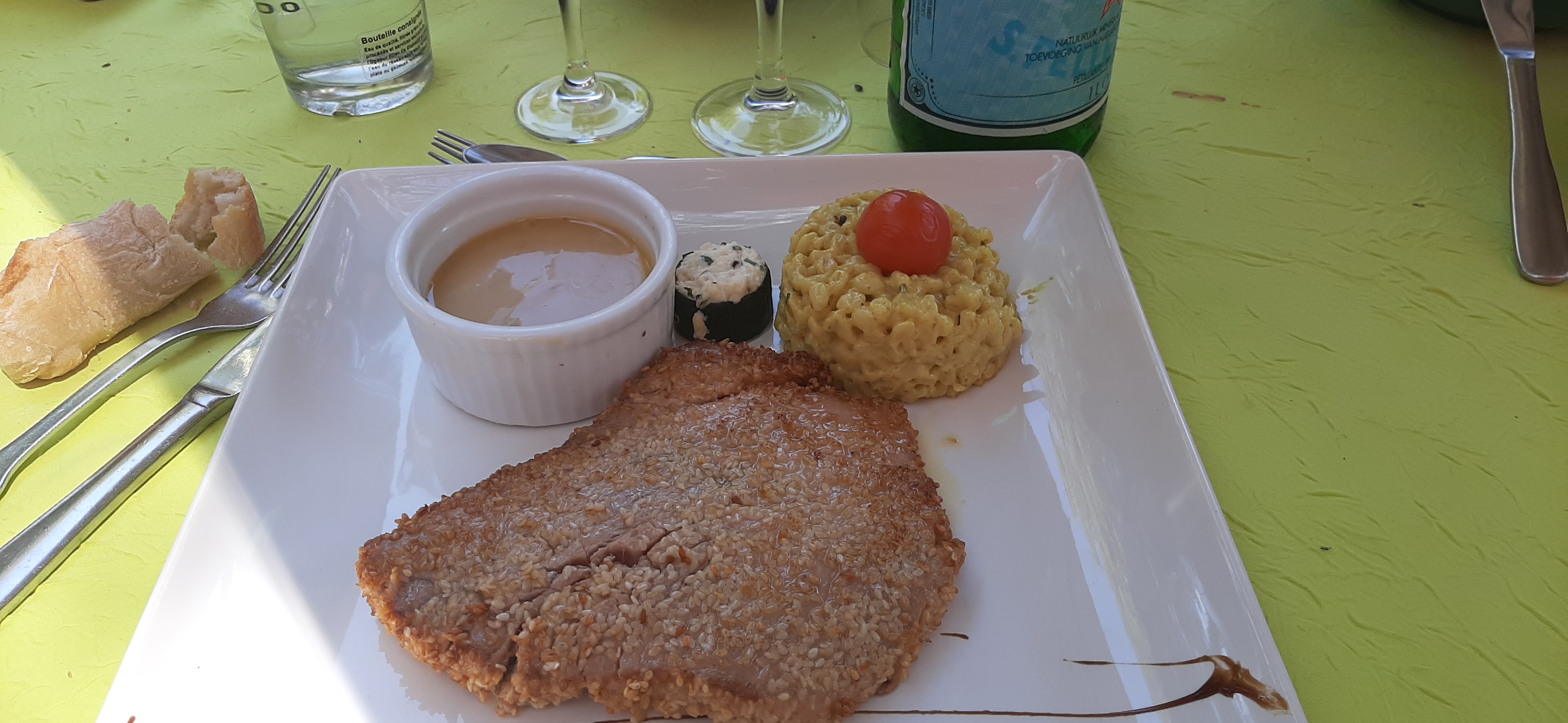 Excellente repas !!!! Très agréable personne même avec la journée très chaude on est bien protégé par les arbres !!!! Rien à dire !!! Chef qui vient à table pour nous présenter son plat sur un plateau !!! Que de bonheur !!!!!