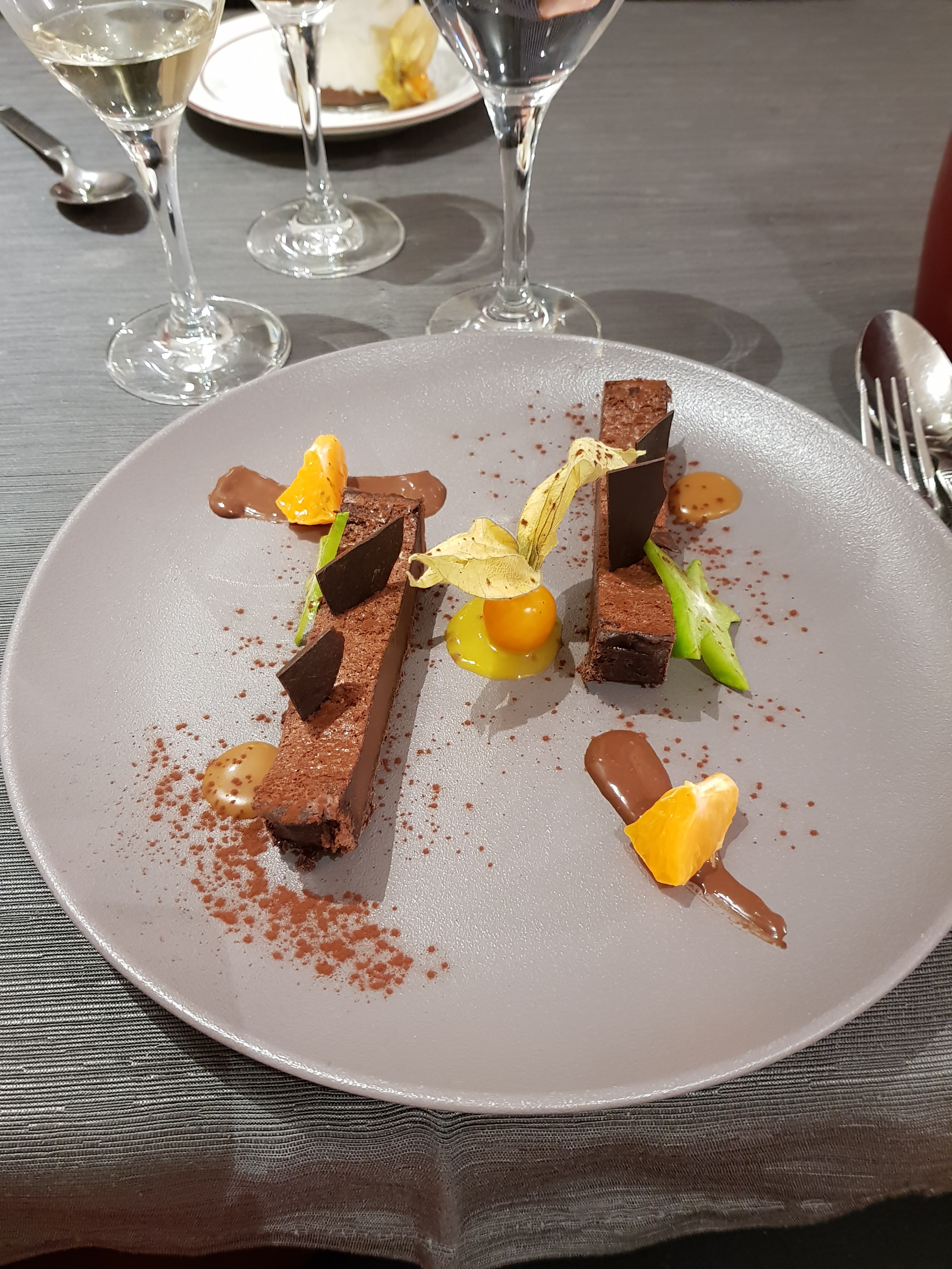L'ambiance est cosy, la décoration contemporaine et chaleureuse à la fois, nous avons apprécié les nappes sur les tables, les fauteuils confortables au toucher velours, du chic sans tape à l'œil. Et le must du must, ce que nous avons dégusté!!! de l'apéritif (le cocktail maison est divin) au dessert, en passant par la mise en bouche, l'entrée et le plat, tout était une merveille à déguster, nos papilles ont été autant en fête que nos yeux, car il ne faut pas oublier de féliciter le chef pour sa présentation de chacune des assiettes amenée par son épouse en salle, une farandole de couleurs et de textures qui mettent l'eau à la bouche, bref en deux mots : ALLEZ-Y!!!