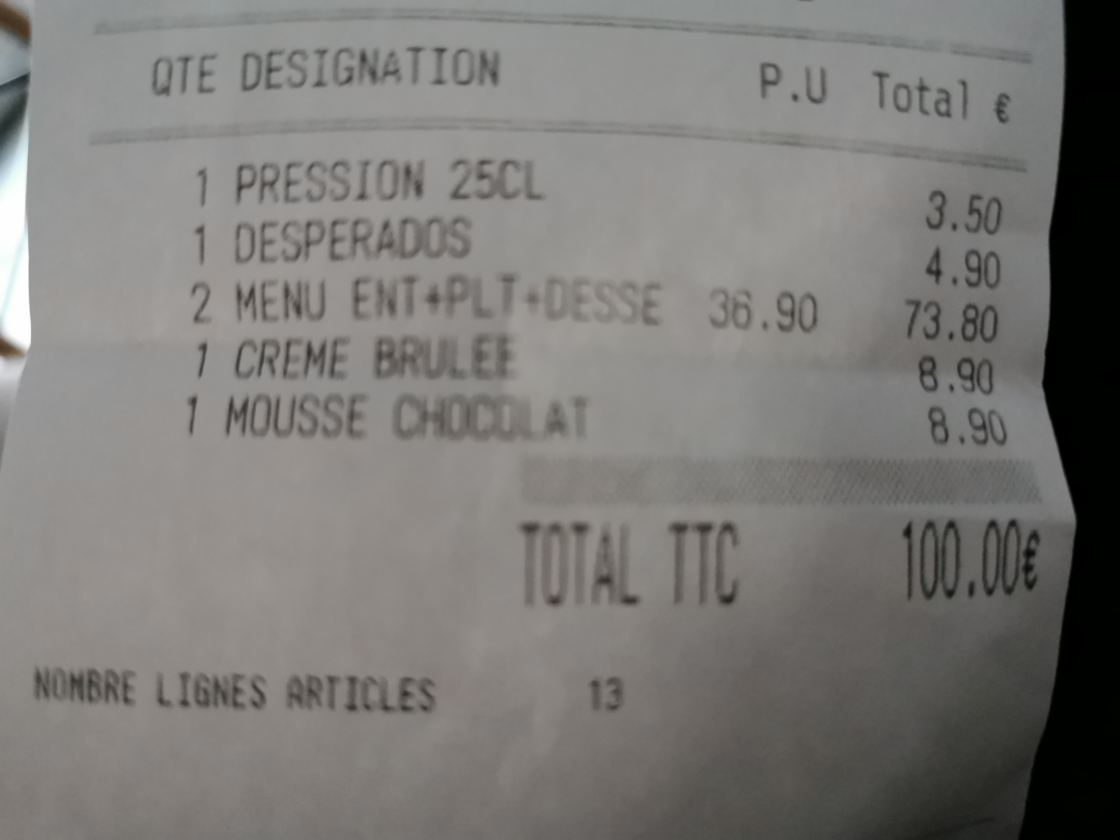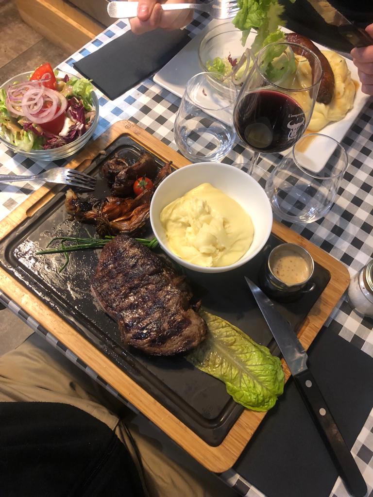 La viande était très bonne (faux filet maturé)24€ Accompagnement frites aligot ou salade, si 2 accompagnements 5€ de plus...pour quelques feuilles de salade en plus.... Frites maison pas terribles, dessert premier prix 8,90. Je trouve que cela reste assez cher pour un repas basique. Je reconnais tous les serveurs était agréable souriants.