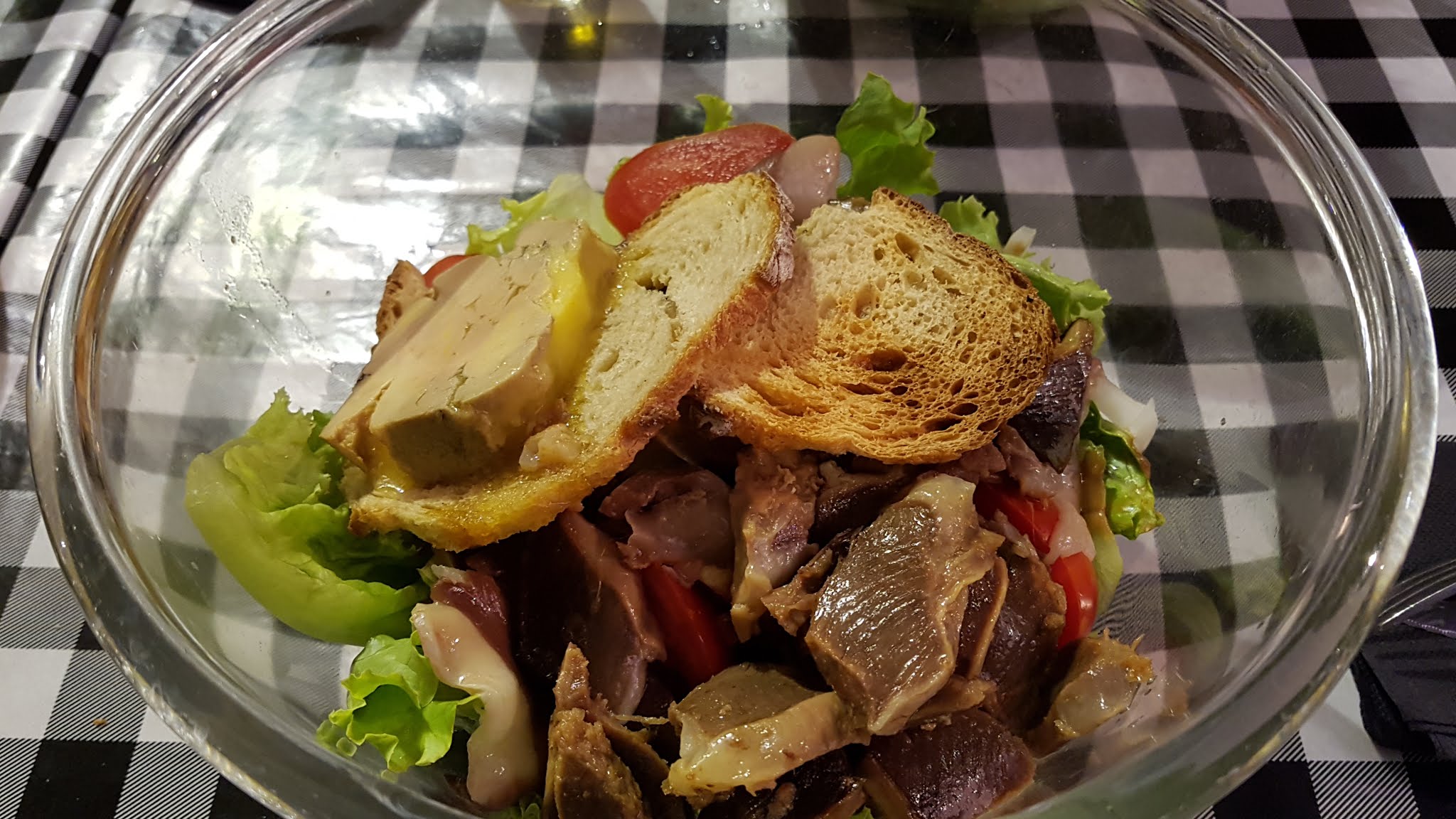 Salade très copieuse voir trop lol Nous avons été bien accueilli et les serveurs ont été aux petits soins des clients avec l'averse qui est survenue d'un coup! L'aligot est très bon