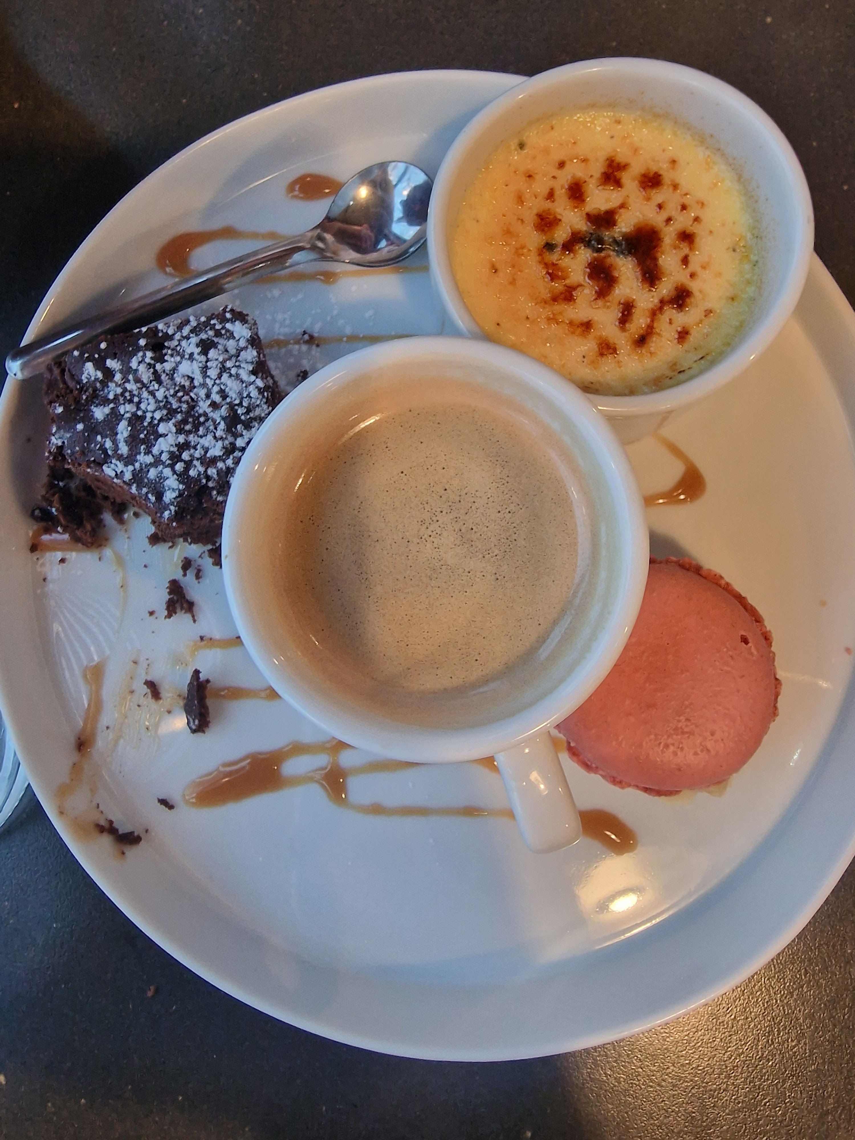 Brochette de Magret de canard, plus frites, maison et un café gourmand très copieux. Quantité suffisante pour tous les plats. Je recommande.