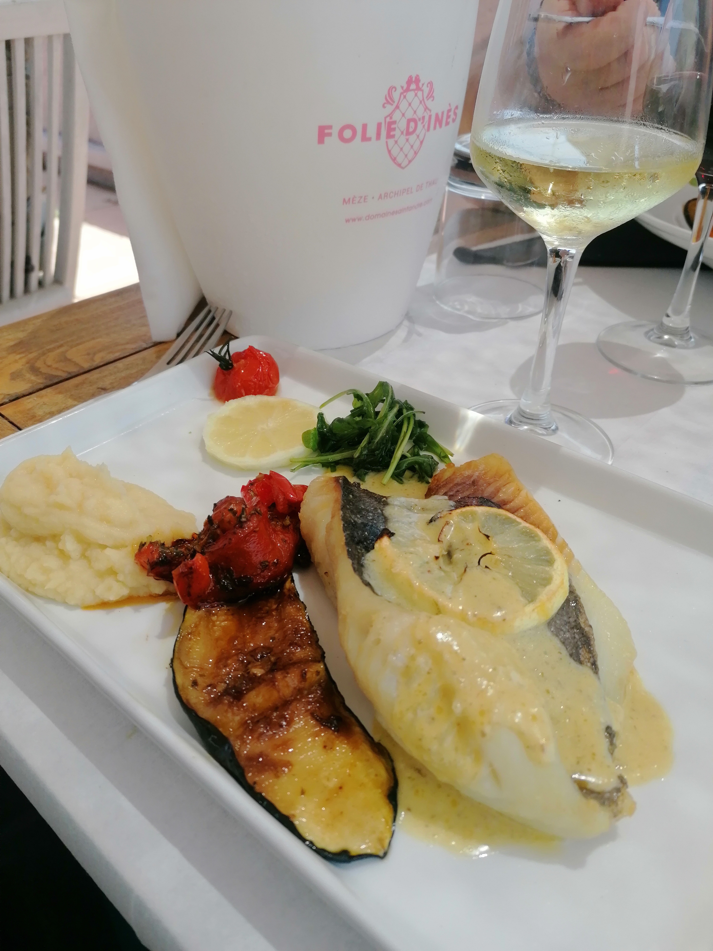 Une vue magnifique et le régal du palais avec la daurade à l'aïoli... surprenante découverte d'un dessert à la patate douce. Merveilleuse soirée...