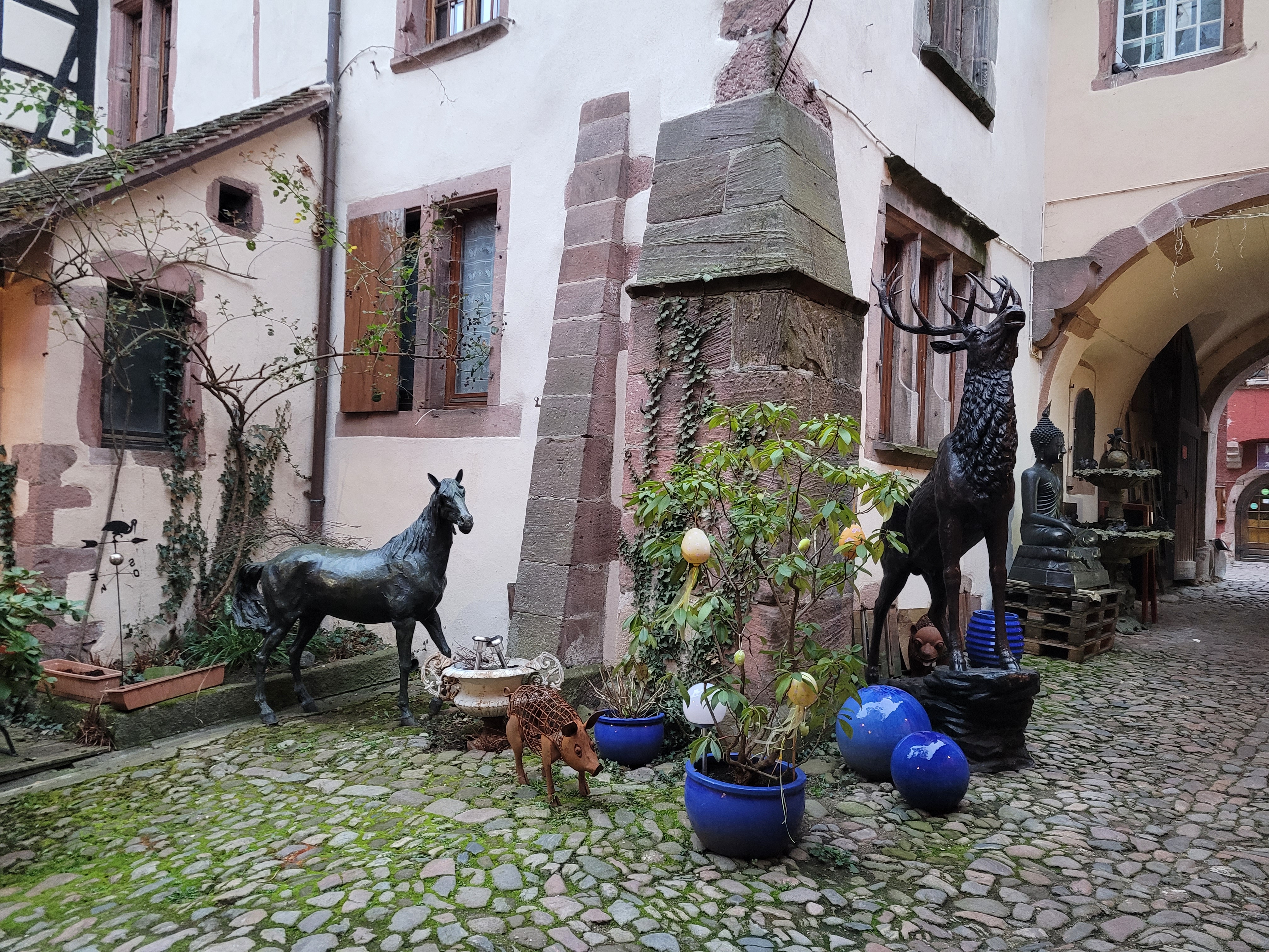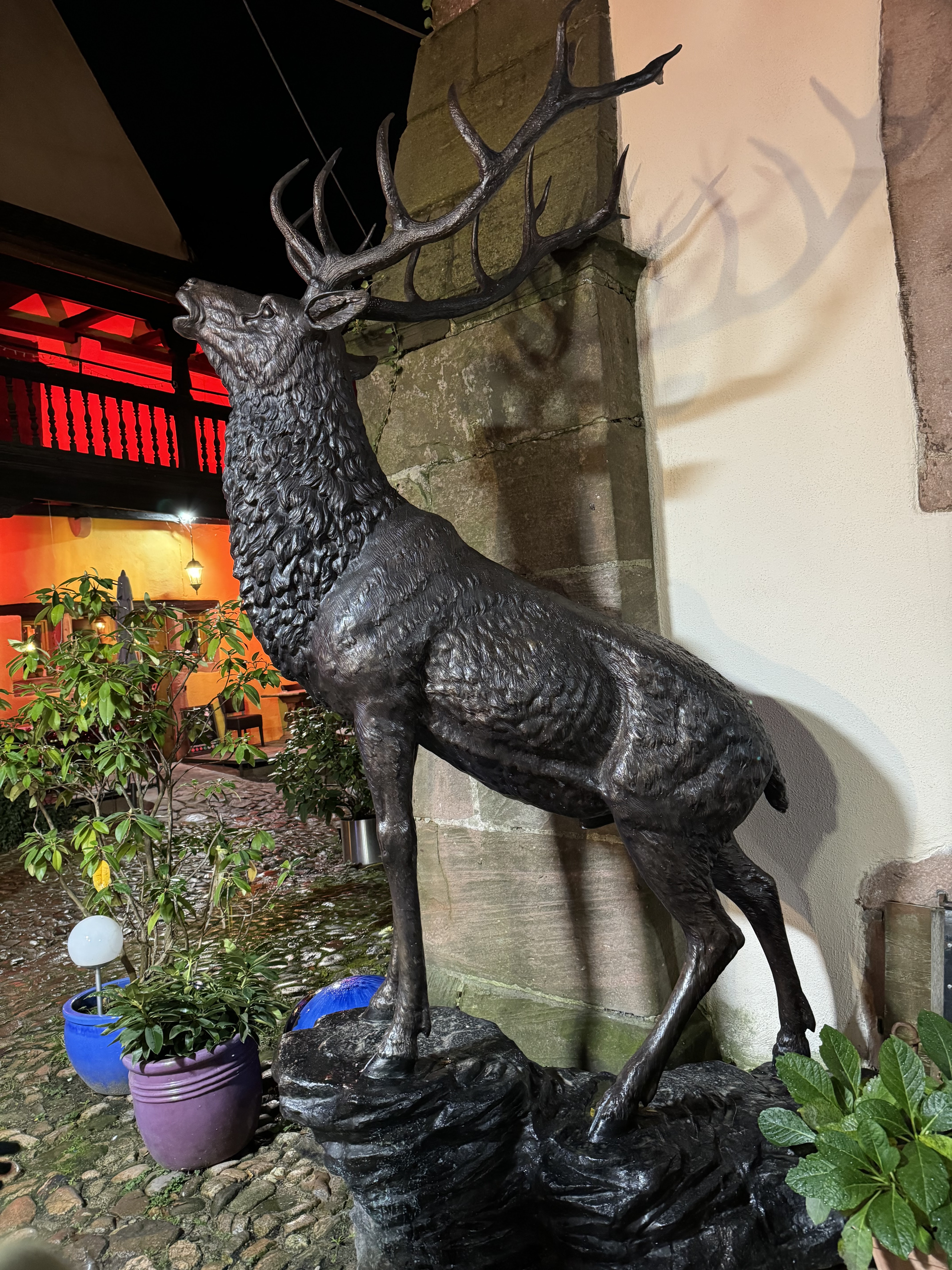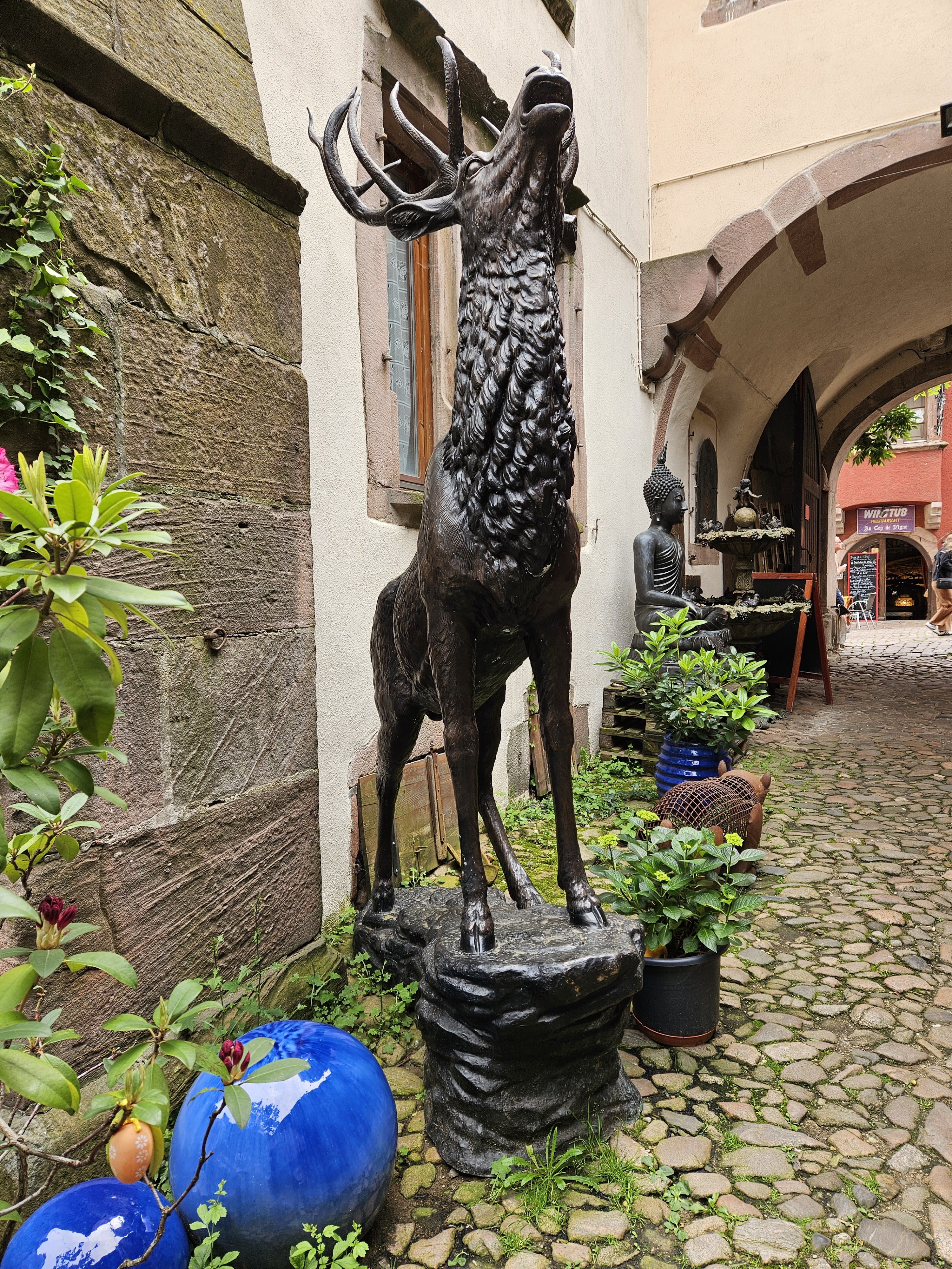 Ce restaurant fait partie de ceux recommandés par l'office de tourisme local. Situé dans l'artère principale réservée aux piétons, l'établissement est accessible par un porche. Plusieurs statues vous accueillent dont un cerf majestueux. Les tables sont installées dans cette cour intérieure. Ce jour là, par manque de personnels, le service à l'intérieur n'était pas assuré. Nous avons testé le menu du jour comprenant une choucroute parfumée au cumin et aux oignons. Pâté de tête et sorbet au marc de Gewertz complétaient ce menu. Le tout pour vingt cinq euros. Nous avons aussi goûté à la bouchée à la reine ainsi qu'aux rognons, ces derniers n'avaient pas la saveur attendue. Le service était efficace. Dans l'ensemble, une réussite.