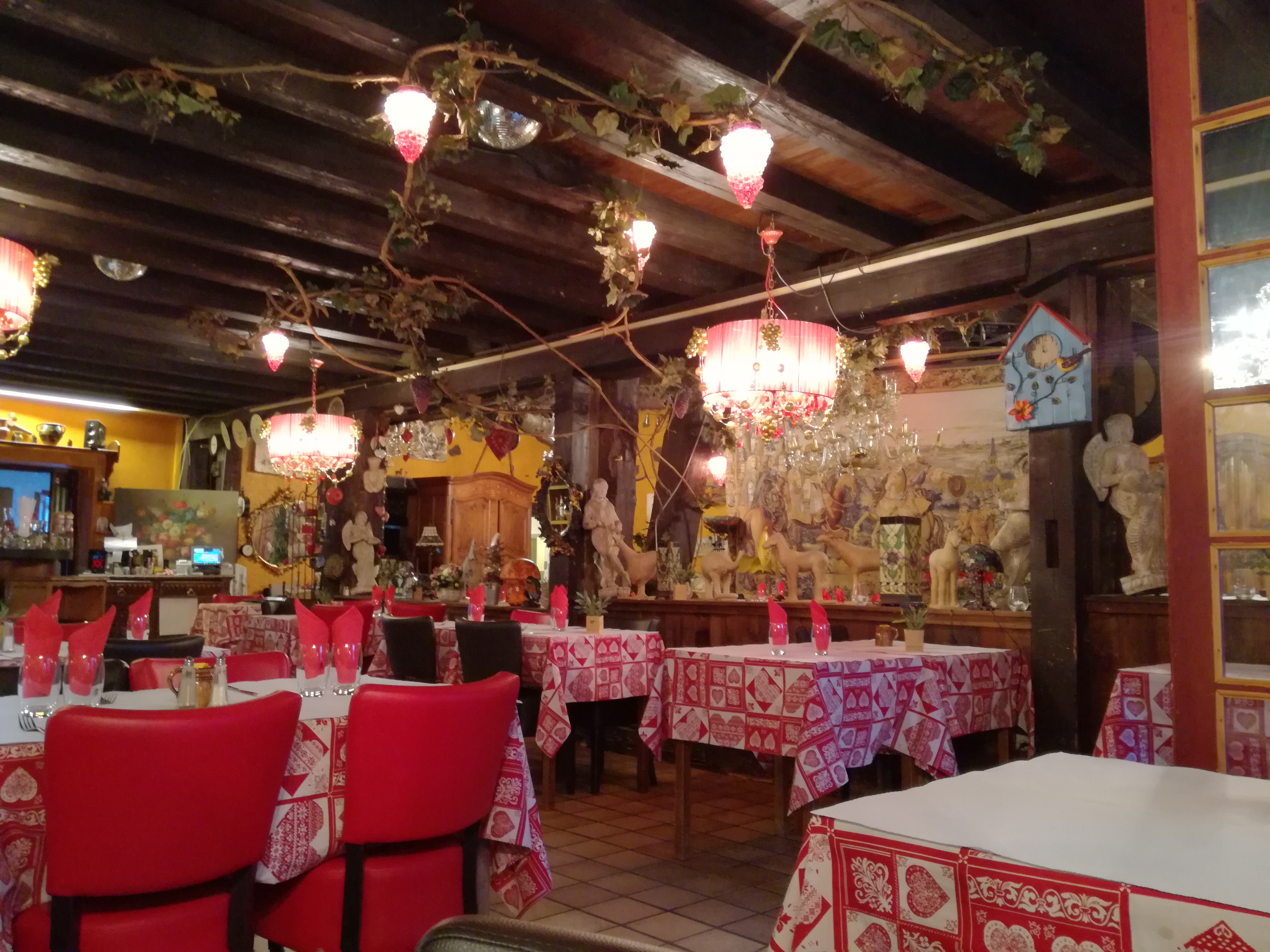 Un décor kitsch dans un bâtiment typiquement alsacien. Nous avons choisi ce resto par hasard et n'avons pas regretté notre choix. Service impeccable. Foie gras maison et saumon gravelax délicieux, flammenkuche également. A recommander