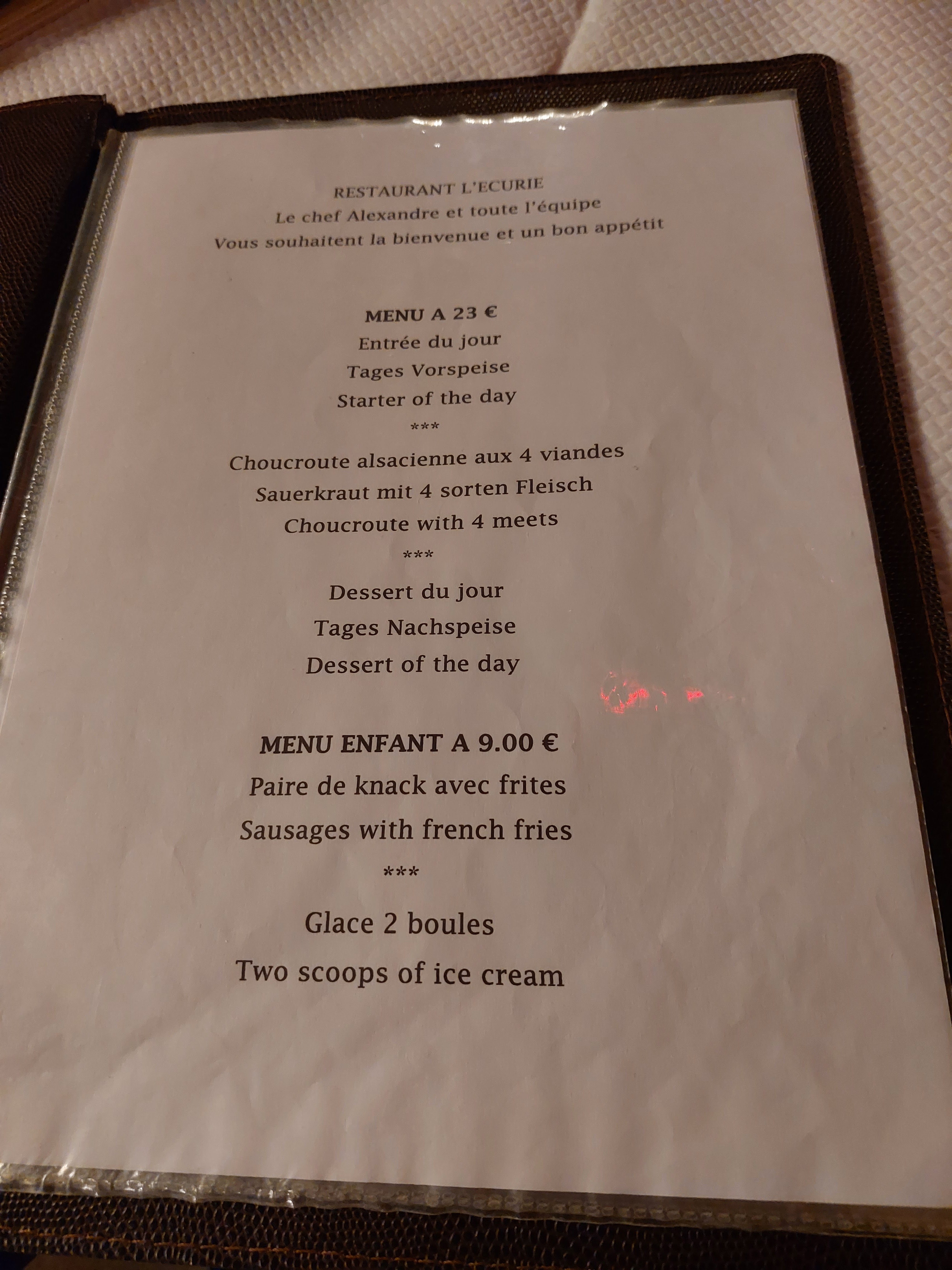 Très bon accueil. La choucroute est délicieuse la verte comme la blanche et l'accompagnement aussi. C'était notre deuxième passage à Riquewihr et notre deuxième passage à l'Ecurie. Une bonne table à recommander.