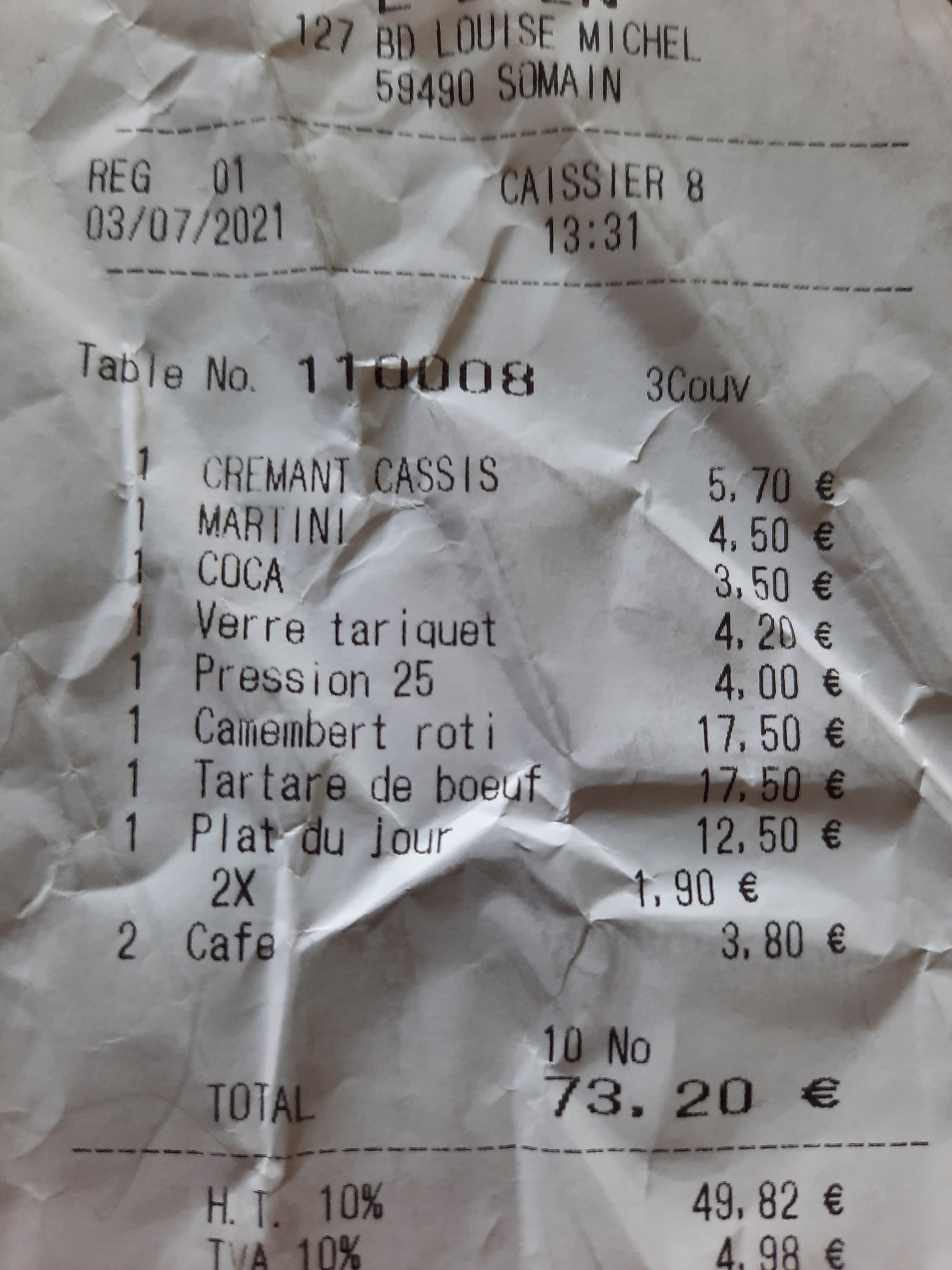Je met la note de 5 car nous avons très bien mangé(le meilleur camembert rôti que j'ai mangé). Mon conjoint a mangé un pavé bien cuit(cuisson parfaite comme il aime et c'est rare car en general ce n'est jamais assez cuit ),frites au gras de boeuf excellente.Les dessert delicieux(creme brûlé à la chicorée et dame blanche)Félicitations au chef pour sa bonne cuisine