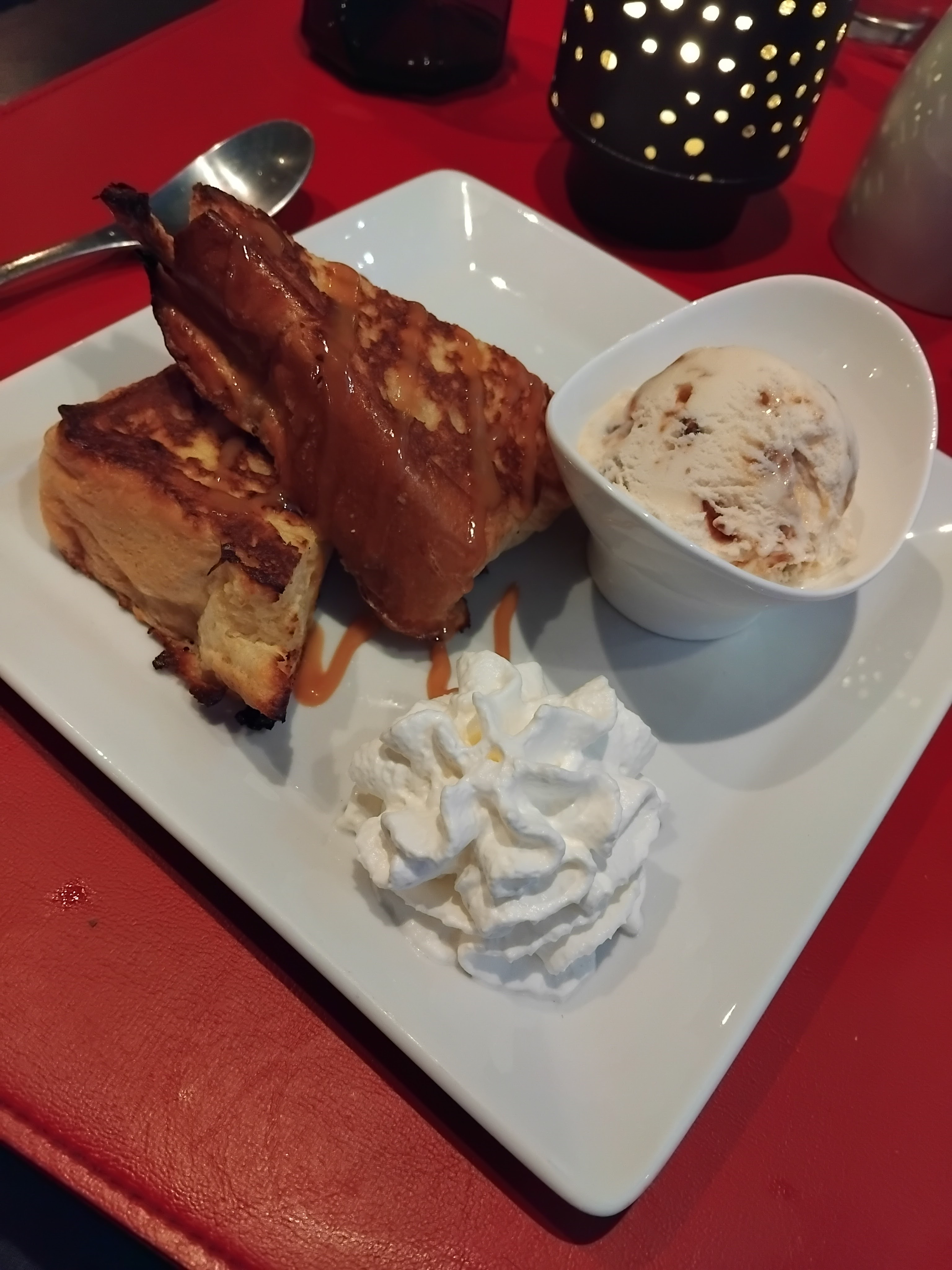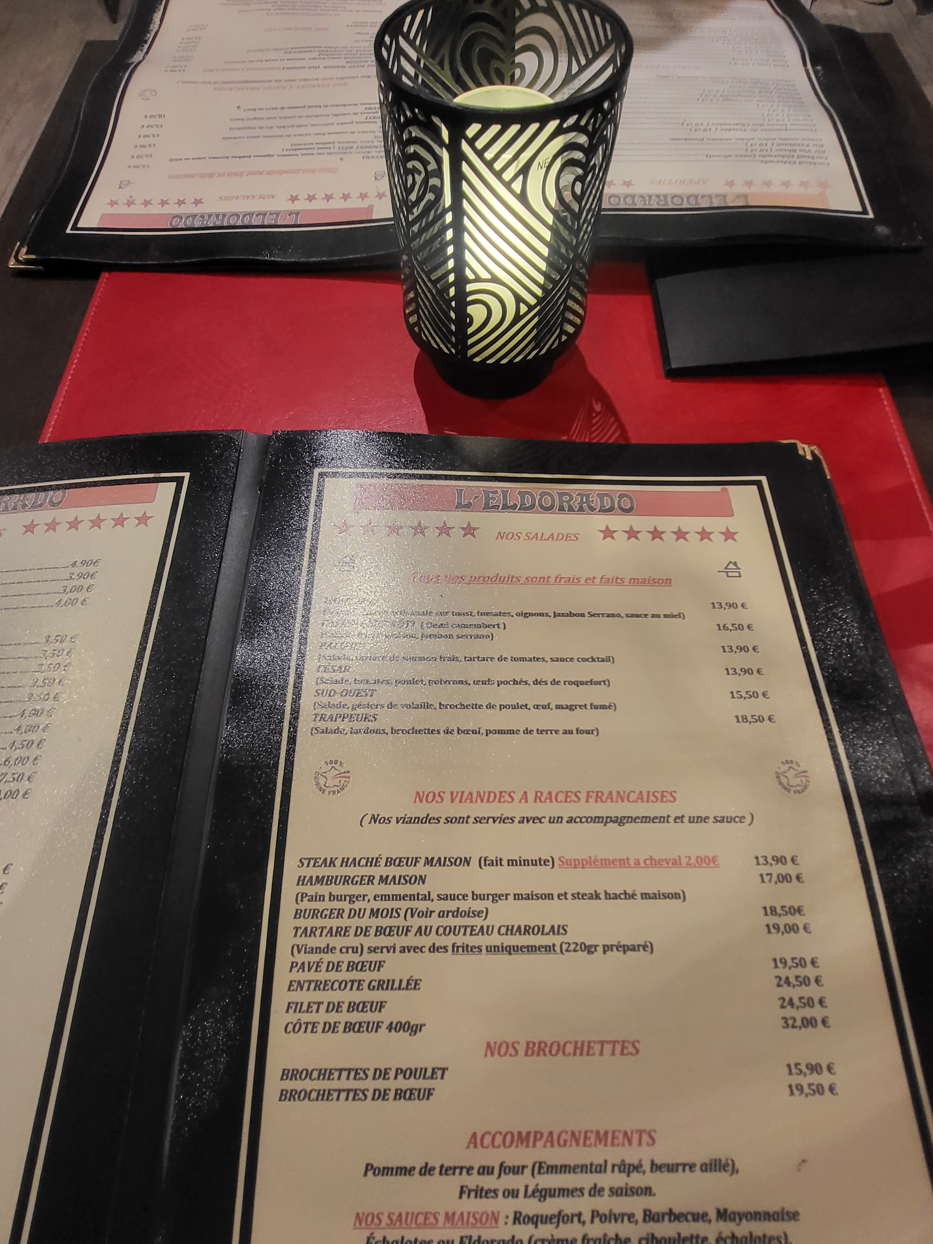 Dans une déco western, nous avons choisi : - le burger maison, - une pizza mexicaine, - des profiteroles, - et une coupe de glaces. Franchement, nous avons apprécié le burger ainsi que la pizza, et le tarif est correct. Comptez environ 20 à 25 € pour un plat + un dessert. C'est vraiment un restaurant à découvrir si vous êtes de passage dans le coin ...