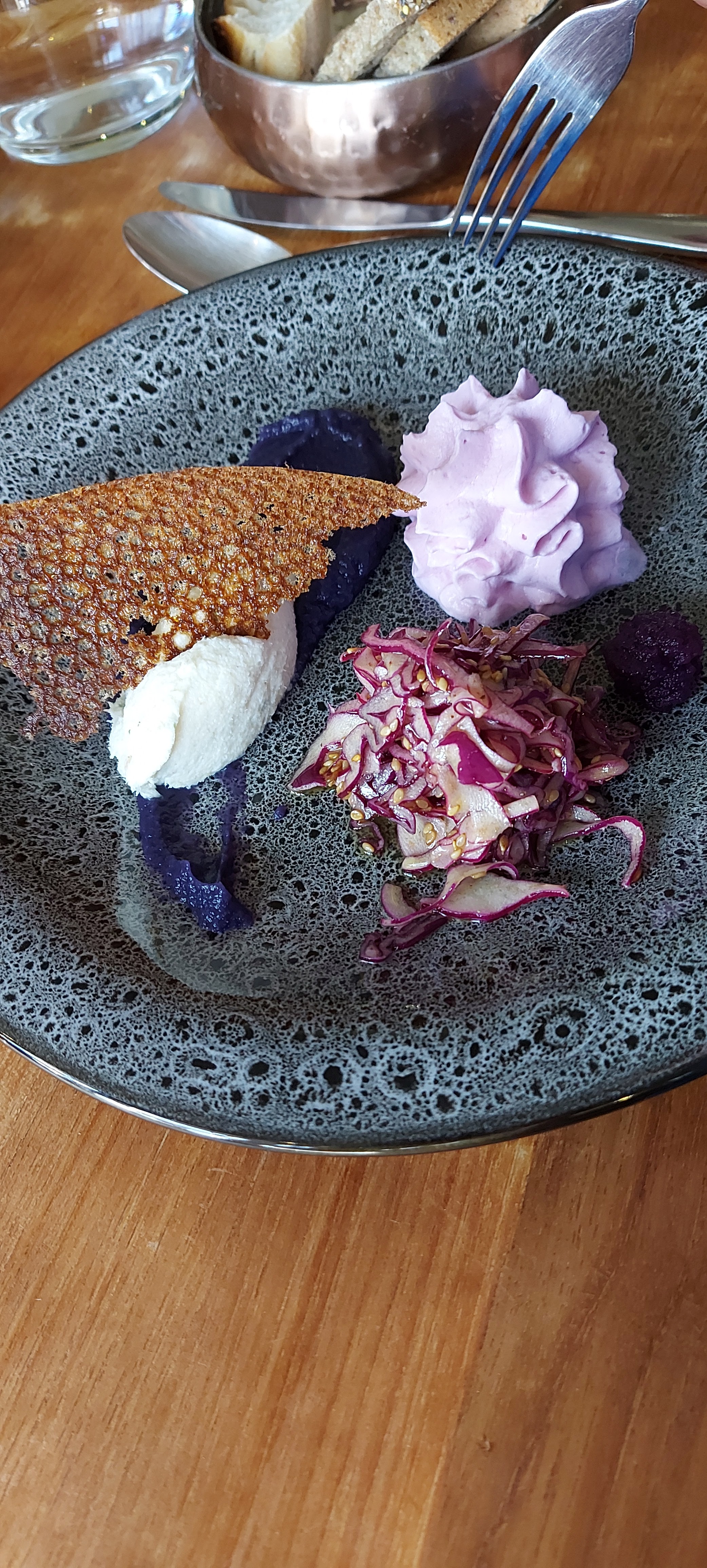 Une surprise pour nous deux de passage dans la région .Nous n'avions pas compris le concept.. Surprise du chef concernant la cuisson et les accompagnements selon les achats du marché nous dit on...sans pouvoir en savoir plus à l'avance. . Bref ayant des goûts assez limités en alimentation, je choisis par prudence le pavé de bœuf (un peu ferme à mon avis) mais dont la cuisson sera parfaite .J'avais juste demandé pas de légumineuses en accompagnement. Ma viande sera servie avec de la purée maison . je devrais dire une portion de purée jetée à la louche dans l'assiette façon self de cantine. Je vous épargne la photo... trop triste . Mon accompagnatrice mangera un filet mignon de porc au goût de fumée très prononcé.. curry noir et charbon végétal selon le menu affaire du jour proposé à 20 € pour plat dessert. Nous sommes un peu dépitées. Heureusement les desserts viendront nous réconcilier avec cet établissement. . Travail sur la pomme pour elle et déclinaison sur le chocolat pour moi. Le tout joliment présenté, copieux et savoureux ouf. Le tout pour une addition relativement correcte.