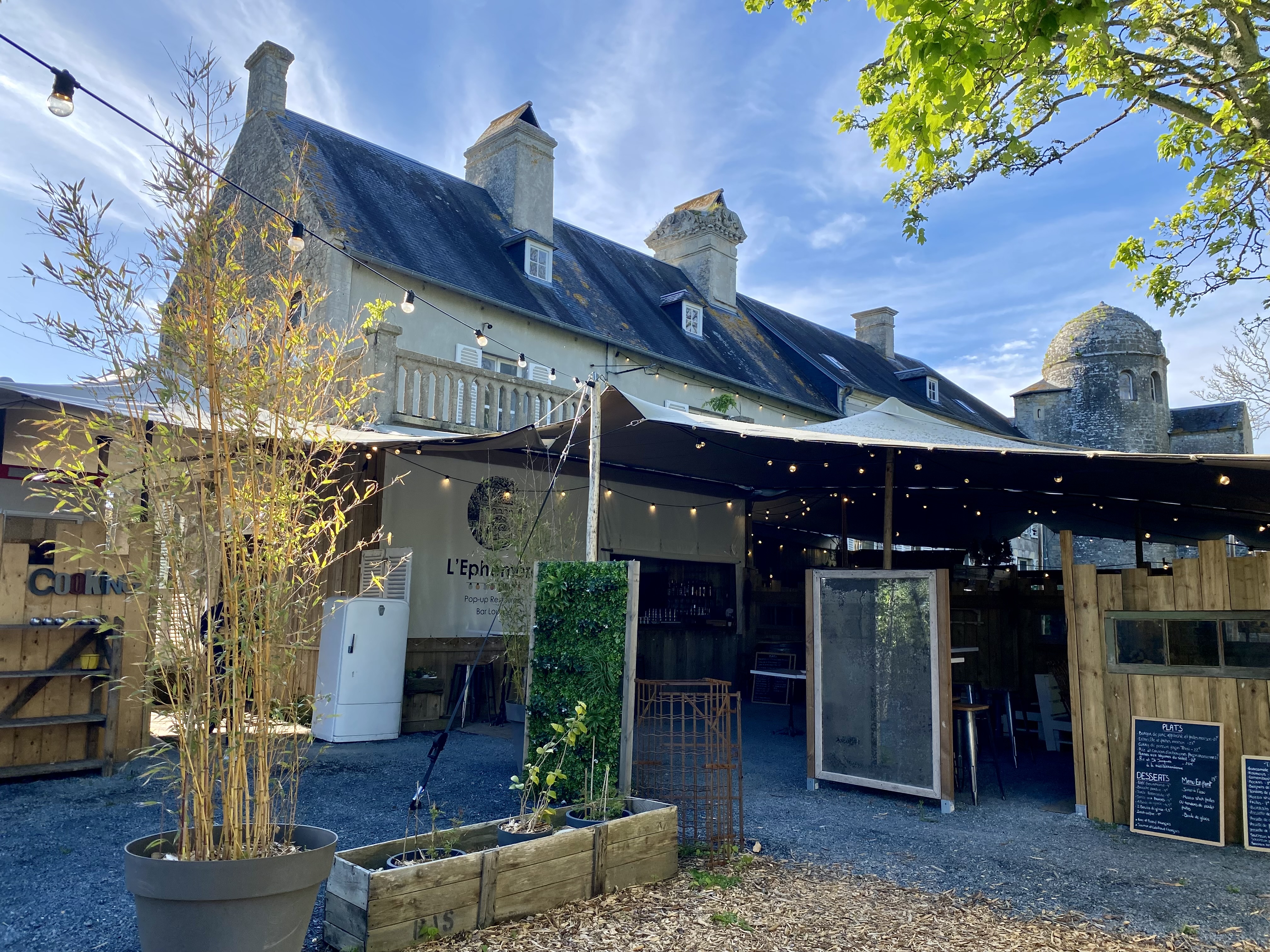 Nous avons vécu une expérience exceptionnelle au Restaurant L'Ephémère Omaha! Lorsque nous avons franchi la porte de cette forteresse médiévale magnifiquement patinée, juste en bas de la route de la Pointe du Hoc, c’était comme remonter dans le temps. Nous avons été accueillis par un hôte accueillant et une atmosphère terreuse qui a donné le ton parfait à notre repas. Le personnel se sentait comme des amis perdus depuis longtemps, prenant le temps de discuter avec nous et de détailler la riche histoire de la propriété. Les tapas et le dessert nous ont volé la vedette, mais j'ai eu un steak frites français classique parfaitement préparé. La brioche perdue en dessert était fantastique ! Absolument une des meilleures expériences de notre court séjour en famille en Normandie ! Des hôtes chaleureux et accueillants, un excellent cidre (juste à côté) et des bières locales, une carte créative aux saveurs de saison et un espace pour se dégourdir les jambes, profiter de la côte et se détendre. Globalement, c'est un endroit incroyable pour vivre une expérience vraiment unique et personnelle. Nous reviendrons.