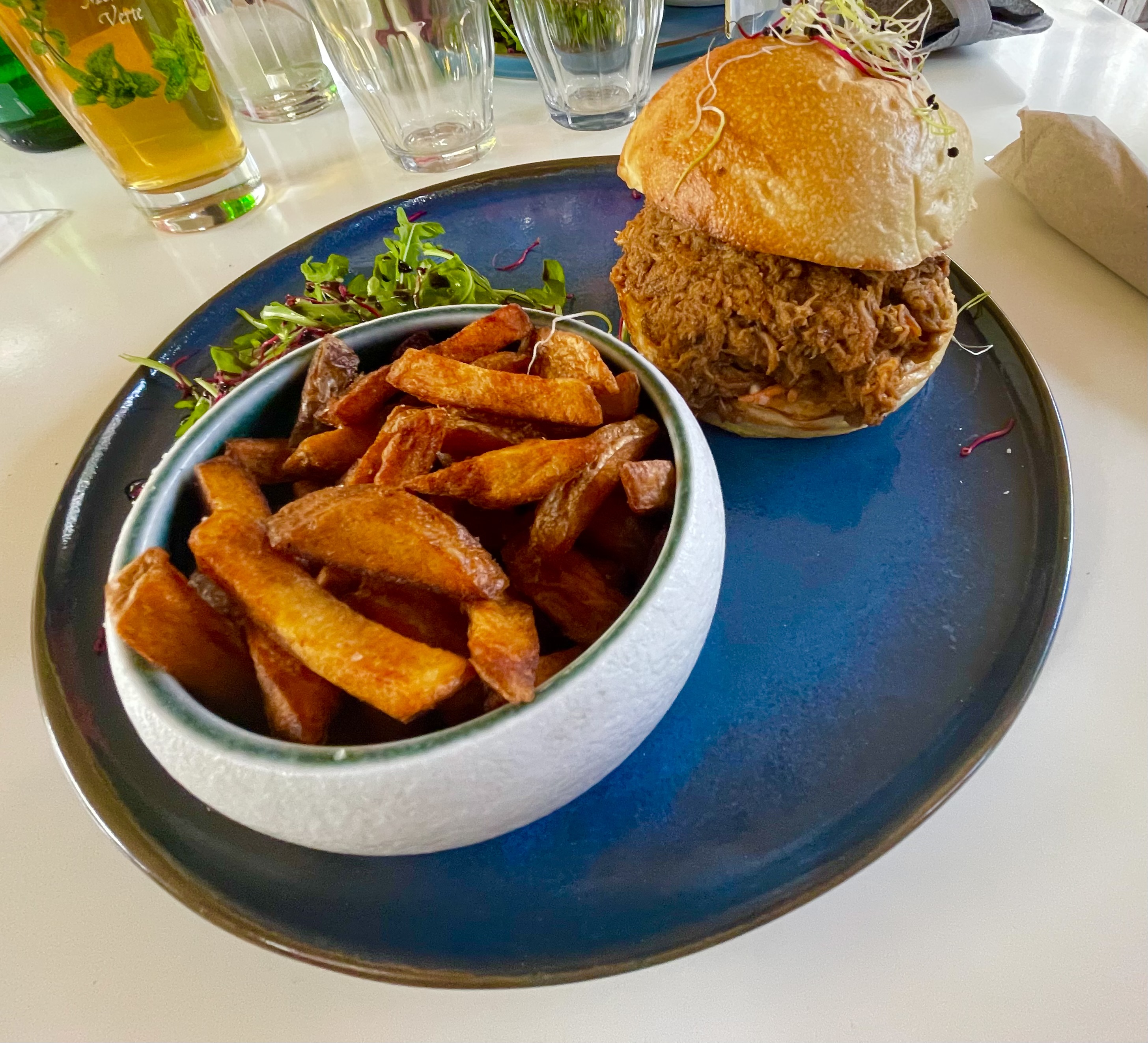 Sans doute la meilleure suprise de l'été et le secret le mieux gardé de la côte (ça ne va pas rester un secret longtemps) ! Une carte simple mais gourmande et généreuse, qui fait la part belle aux ingrédients locaux ( le burger de la photo est au porc effiloché - où Pulled Pork pour ceux qui connaissent - sans hésitation,le meilleur porc effiloché que je n'ai jamais goûté ! ), un cadre enchanteur au pied d'un magnifique château, et un service franchement sympathique et convivial qui faisait défaut sur cette côte pourtant très touristique. Félicitations à la fine équipe des trois frères aux commandes. Je reviendrai, c'est sûr !