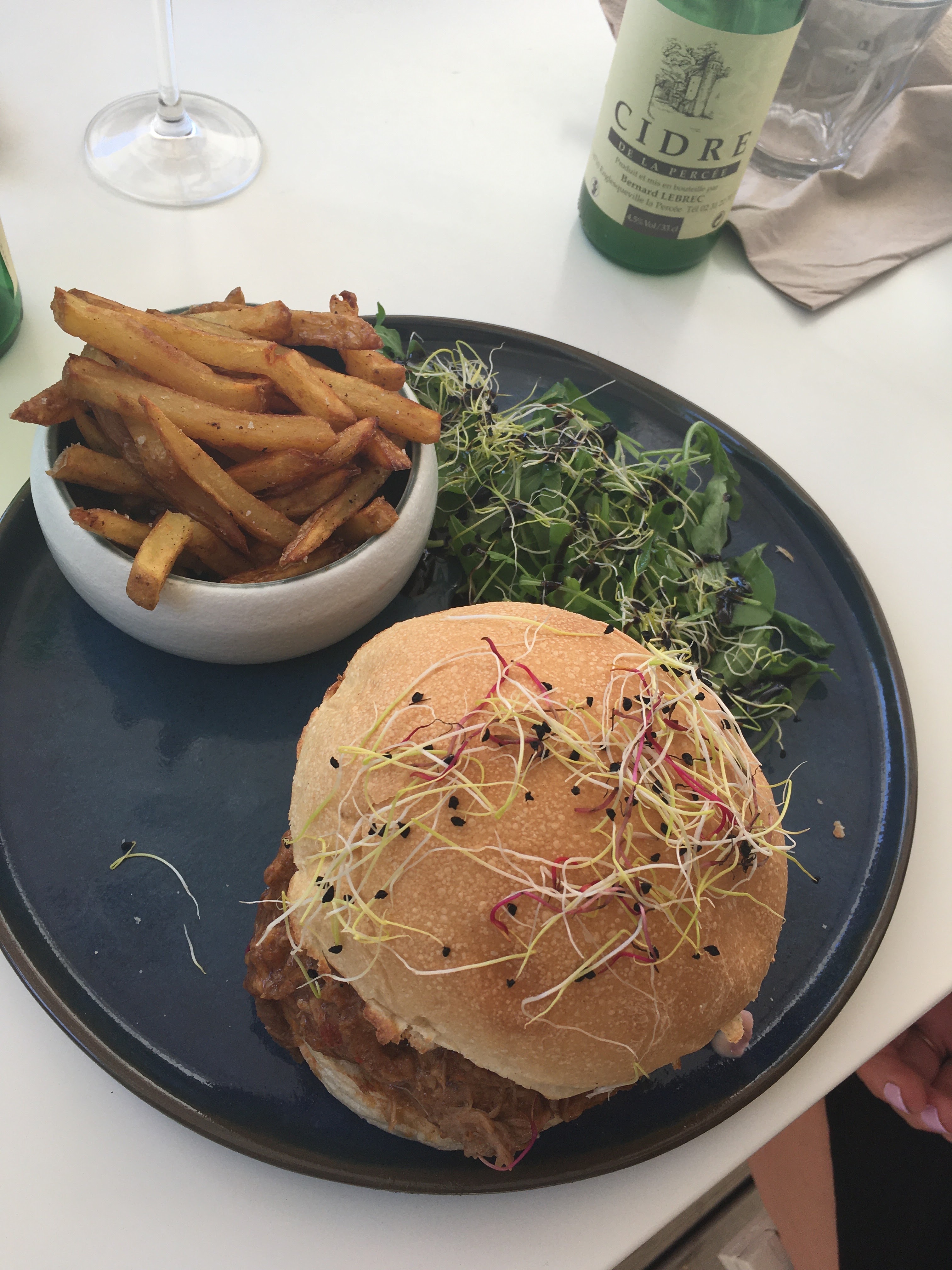 Quel restaurant incroyable. Jonathan et ses frères ont vraiment créé un endroit sympa pour faire une petite pause lors de la visite des sites de Normandie et profiter du plein air quelle que soit la météo. Il y avait un peu de vent et de froid et ils nous ont fourni des couvertures. Il y avait une zone couverte au cas où il pleuvrait et des tonnes d'espaces ouverts au soleil. La nourriture était incroyable. Tellement frais et bien cuisiné. Mieux que n'importe quel restaurant parisien que je connaisse. Au départ, nous avons vu l'enseigne à côté du magasin vendant du Calvados. Au moment où nous sommes revenus là-bas, il était fermé et nous avons vu le restaurant et avons décidé d'y manger de toute façon. Ils avaient le calvados au menu - il était toujours préparé par la famille. Jonathan a eu la gentillesse de nous offrir une bouteille à acheter même si le magasin était fermé !