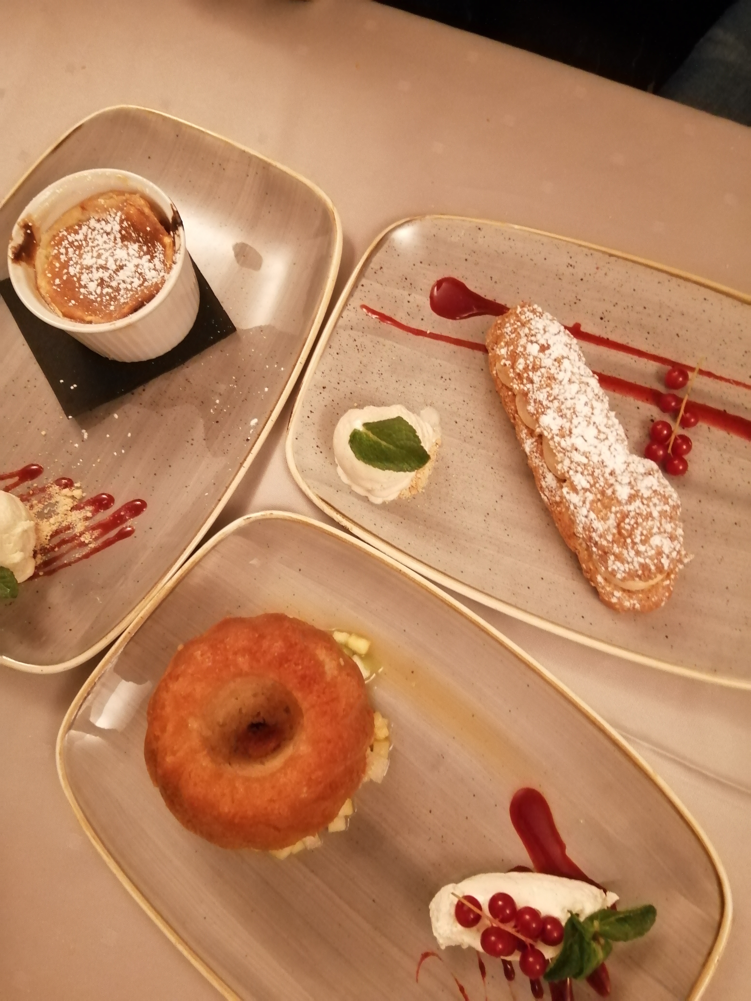 Entrée : je n'ai pas pu avoir de coquillages car c'était le dernier jour avant les congés pas annoncé à la réservation. Entrée saint Jacques très bonne. Ensuite, plat gratin dauphinois avec du Gruyere et sec. Carré d'agneau qui devait être en croûte de gingembre et citron sans goût, tian de légume qui s'est transformé en brocolis et chou fleur vapeur. Dessert très bon. Addition erreur on nous fait payer les desserts en plus compris dans le menu quand on nous rembourse la personne nous rembourse 5 euros de moins on reviens pour réclamer et on nous propose des digestifs(la moindre des choses)... Nous ne reviendrons pas.