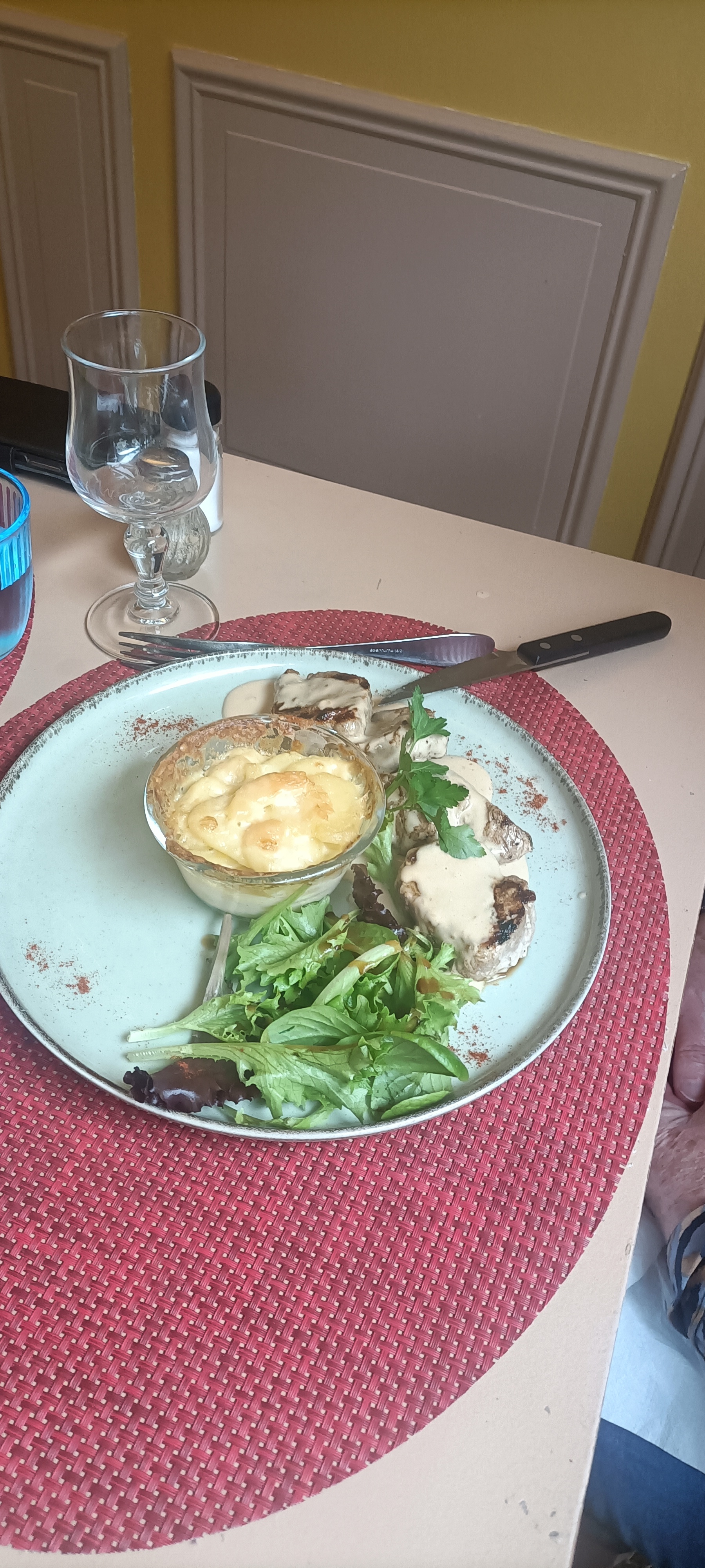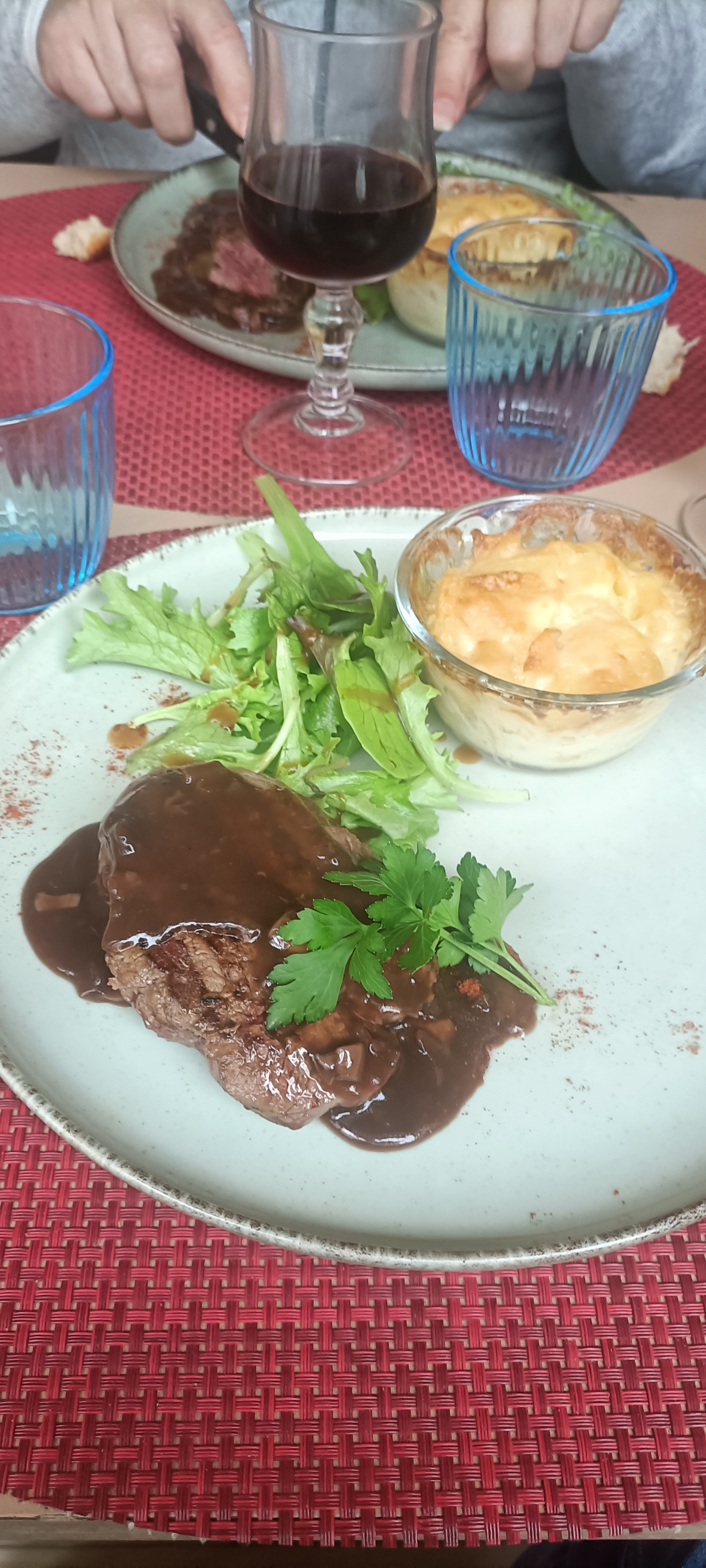 accueil froid , veau très gras , à vue d’œil je dirais 30% de viande , 70 de gras , par contre la pomme de terre était bonne. 25€… sans entrée , sans désert , sans boisson.