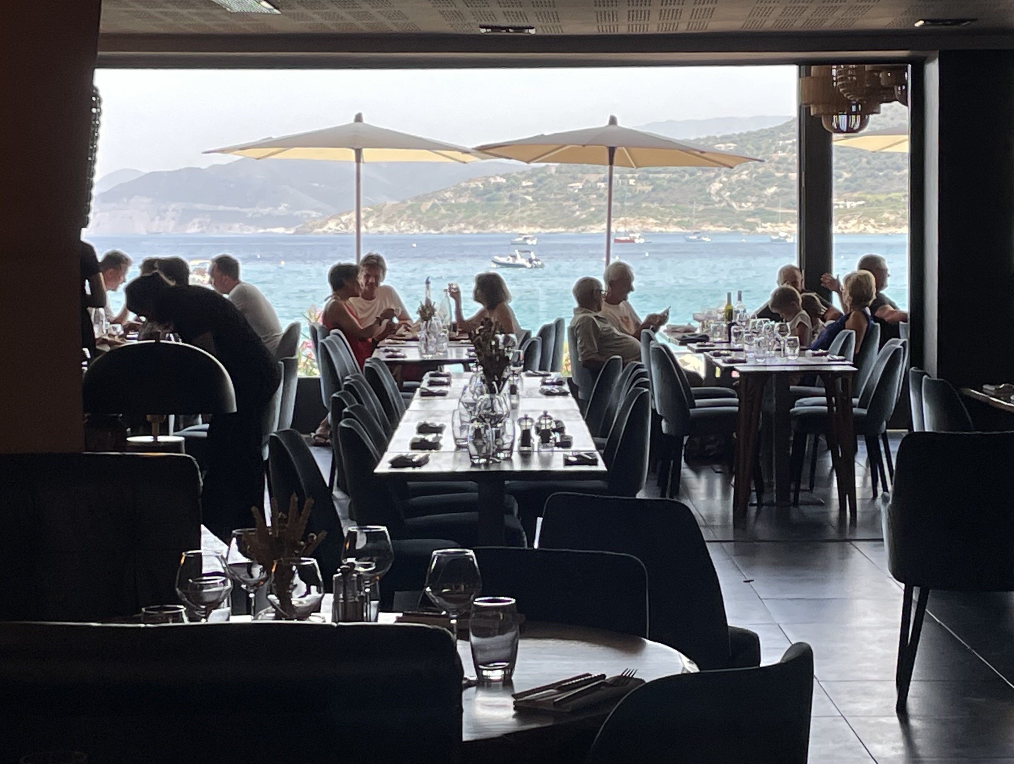 En premier lieu, parlons de l’atout principal de ce restaurant : la vue. Imprenable et incomparable sur la mer, la plage… si vous avez la chance d’être sur le tables les mieux situées. Après, comme rien n’est gratuit, l’addition s’en ressent fortement. Les tarifs sont prohibitifs. Pour ce niveau de prix, on est en mesure d’attendre le meilleur et cela n’a pas été le cas. Pourtant la clientèle est assez aisée et chic. Le midi, en prenant le menu découverte à 40 euros pour entrée-plat-dessert, j’attendais nettement mieux. L’accueil est cordial et les serveuses efficaces. Les assises confortables et le décor agréable, même s’il aurait besoin d’un coup de propre et d’un peu de rafraîchissement (peinture écaillée, luminaires très poussiéreux). La carte est plus axée sur le poisson et en propose des espèces nobles, mais les tarifs sont dissuasifs : 80 euros pour une sole meunière, c’est le prix d’un étoilé parisien. En entrée : la charcuterie locale : 2 tranches de jambon sec (sans caractère), 1 tranche de coppa et 2 croquettes (purée de pomme de terre et fromage). En plat : le Saint-Pierre sauce vierge était trop cuit, ce qui est vraiment dommage avec un poisson aussi fin. La purée de patate douce était collante et plutôt insipide. En dessert : on nous annonce une « tuerie de chocolat ». Alors non, non et non. Une mousse à la vague saveur de châtaigne, quelques brisures de crêpes dentelle et le tout noyé sous une sauce chocolat banale, c’est loin d’être une tuerie pour le palais. A 10 euros, ce dessert doit leur revenir à moins d’1 euro à faire. Mon conjoint a pris le burger Corse (21 €). OK, il est roboratif, parce que le bun est énorme mais n’a pas trop de goût ! Le fromage et la charcuterie sont bonnes. Le steak était bien. Les frites très croustillantes sont plaisantes. Cela fait quand même cher pour un burger. Le digestif offert est ultra sucré. La bouteille est impressionnante par sa taille, le goût l’est beaucoup moins. Pour résumer, la vue et le confort sont appréciables, mais le rapport qualité-prix n’y est pas.