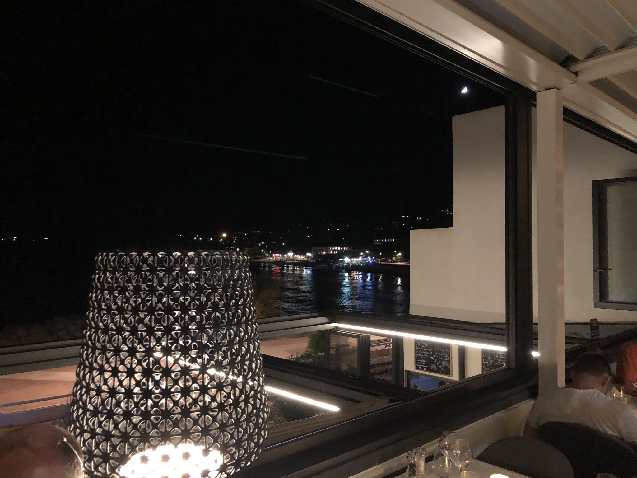 Pas de place en terrasse à notre arrivée (sans réservation). Pas de problème, on nous a installés en salle pour l'apéritif, puis nous avons pu nous déplacer à l'étage, au bord de la baie vitrée grande ouverte, vue sur la mer (et l'éclipse lunaire de ce soir-là). Belle carte des mets, accueil chaleureux.