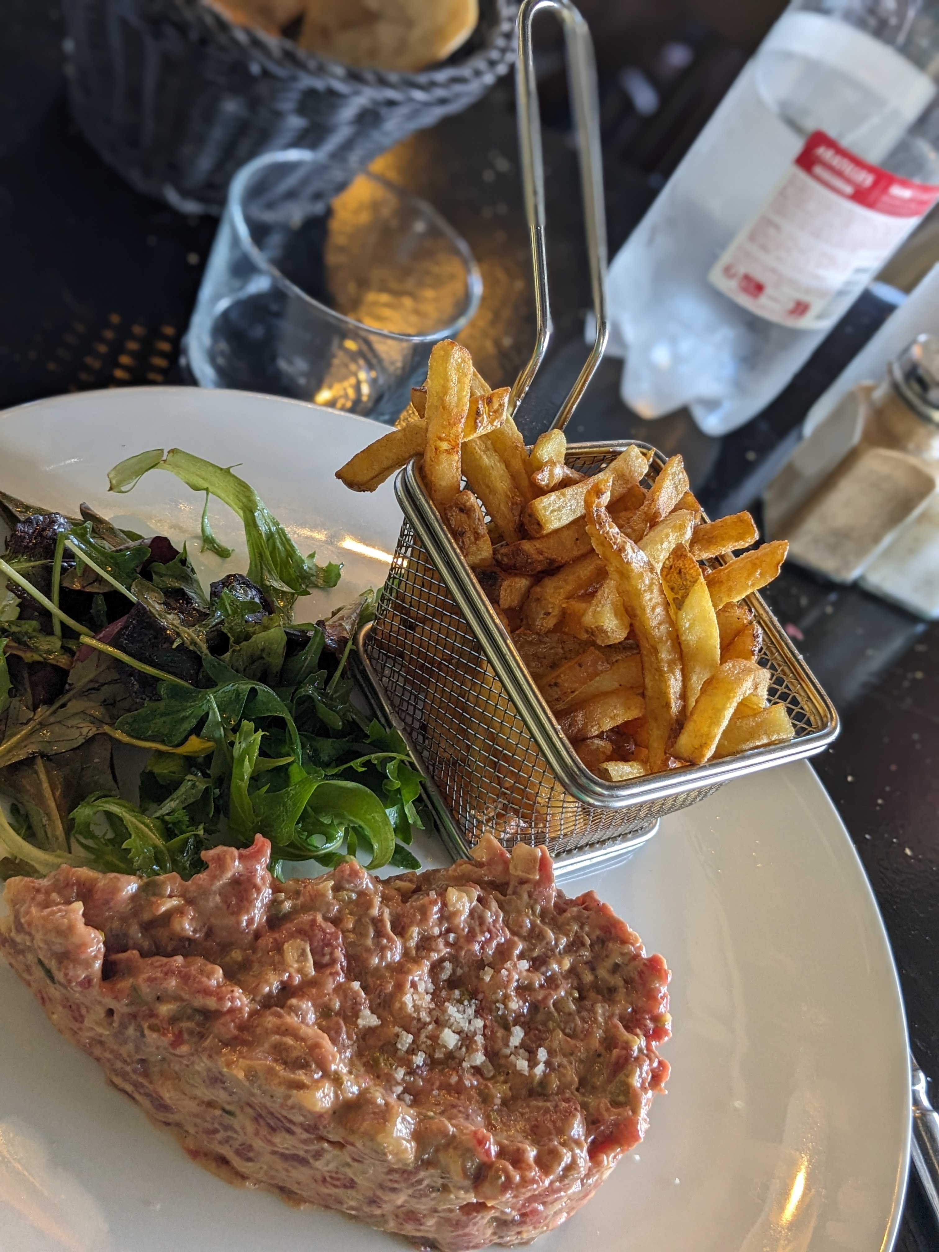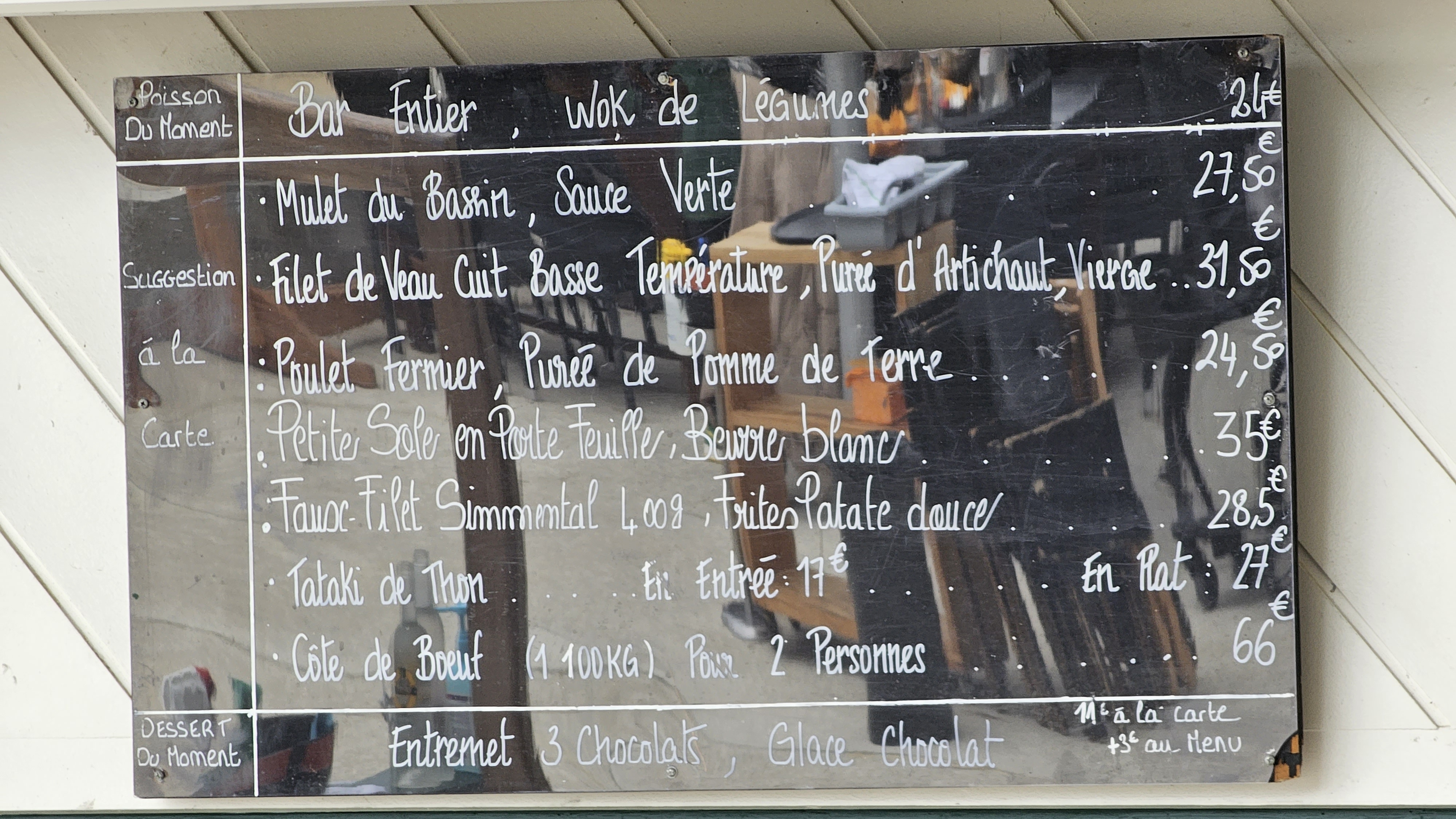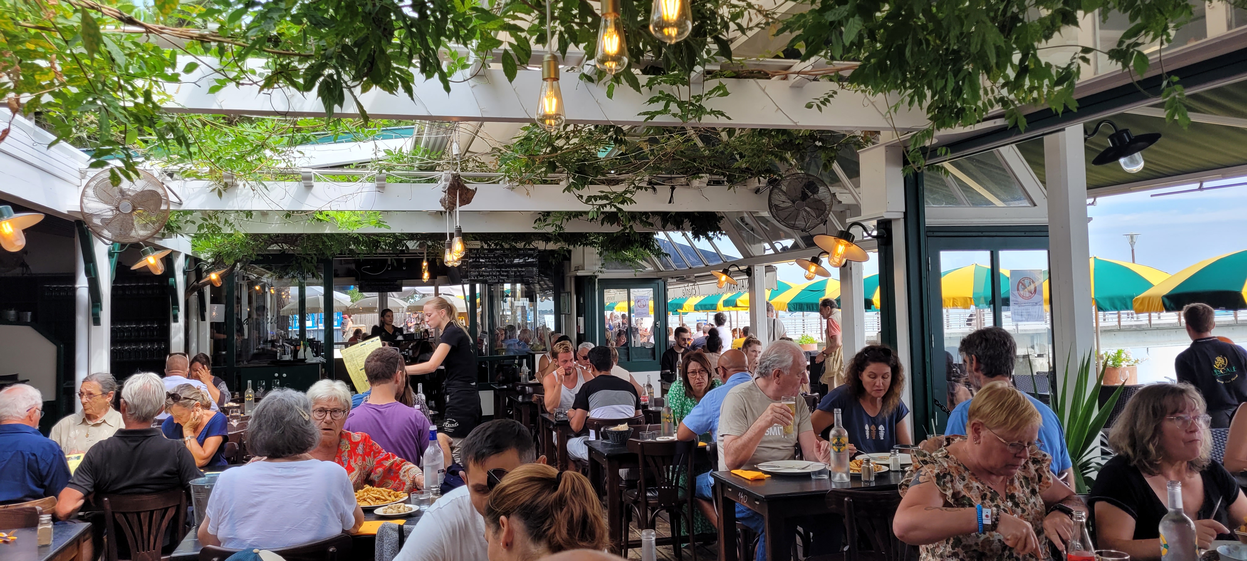 Repas un midi, placé face au bassin au top et service sympa. Seul bémol les prix de la carte ! Vous désirez un poisson passez votre chemin... ex : simple sole grillée à 40E !, bout de vin à 25e et plus soit 2 poissons et 1bout vous explosez les 100e pour 2 et sans entrée ni dessert, ni apéro, etc sinon vous finirez à 170e pour 2 rapidement ! Seule solution abordable les menus, mais là aussi entree+plat à 22.5e pour un oeuf mimosas et moules frites. Conseil ambiance , ne vous mettez pas en plein devant la dune en bordure car c'est bruyant (cela résonne) et les passants passent au milieu des tables et du resto, oui ! Demandez à vous mettre en décalé vers la cabane des tickets de bateaux = calme. Bref, ok mais juste pour la vue.