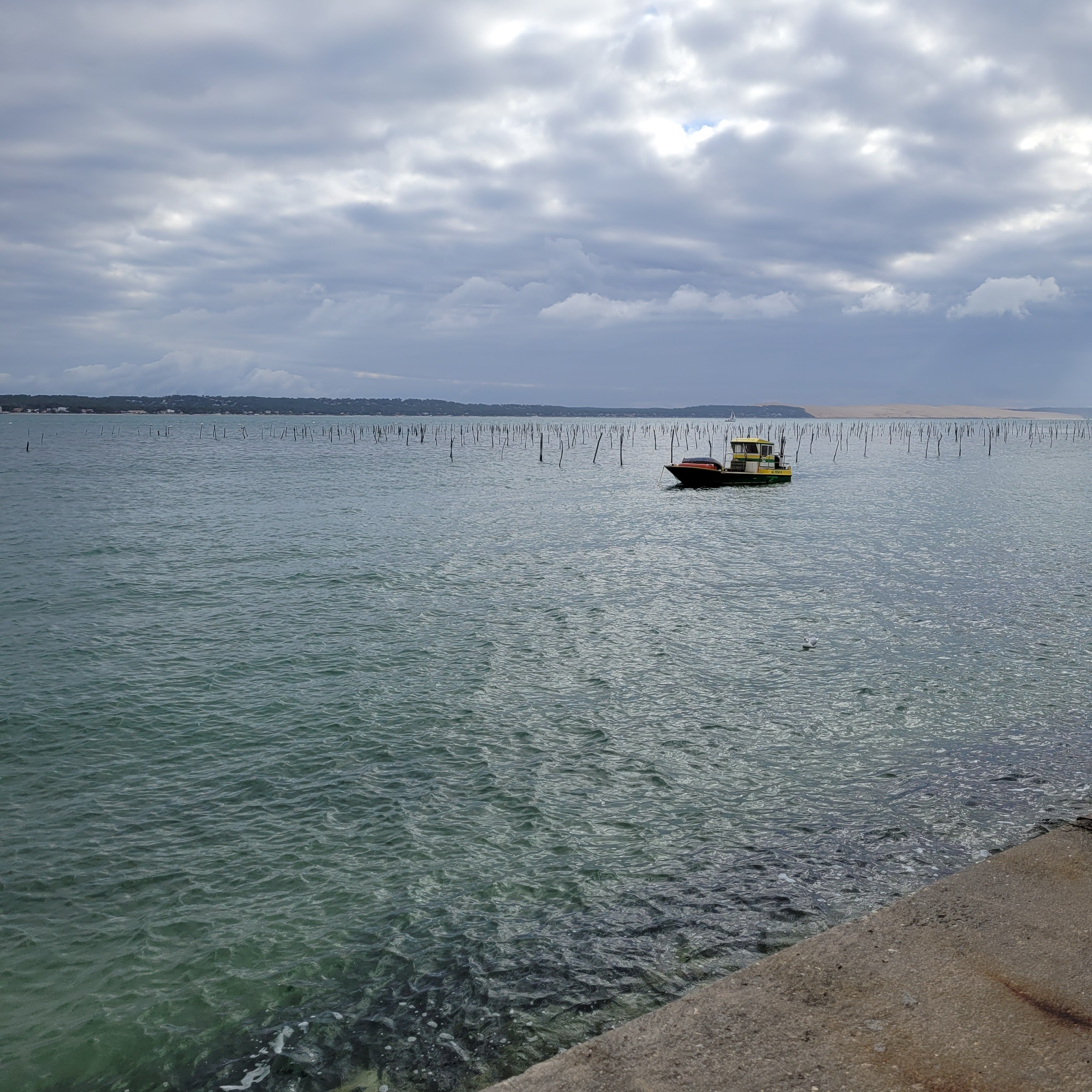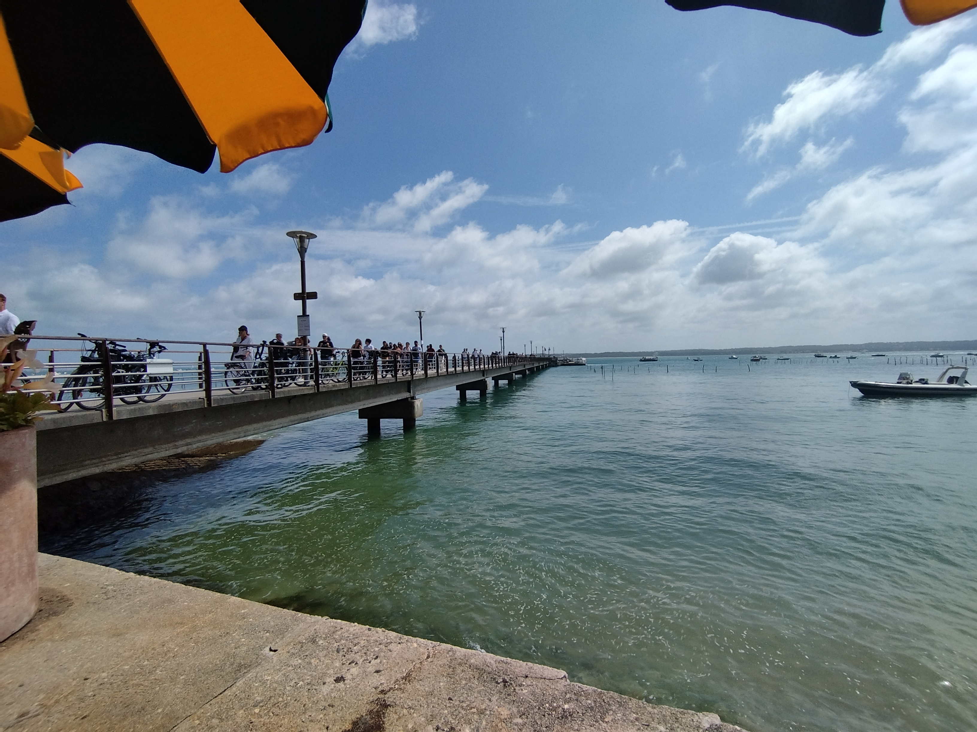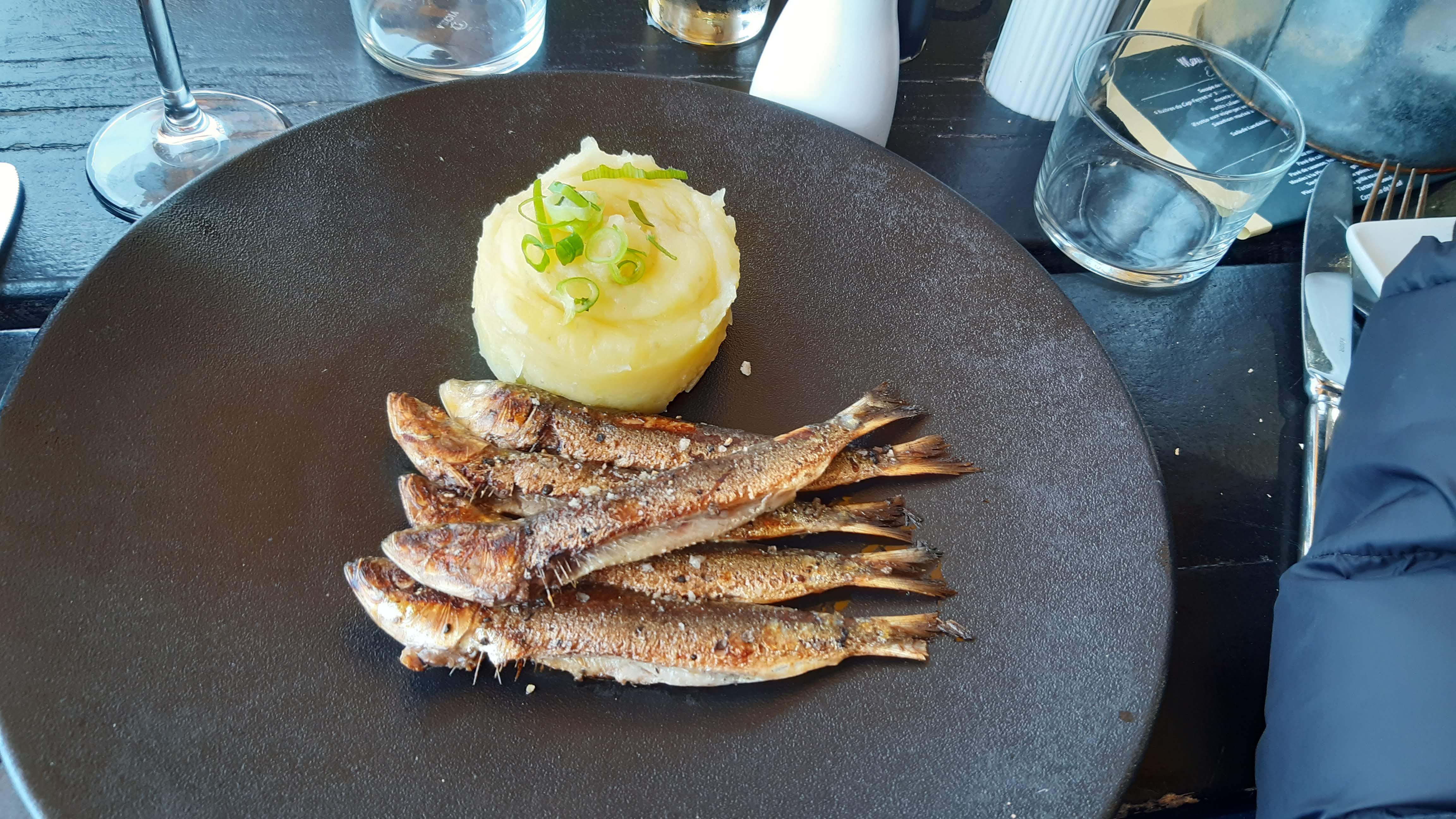 Nous avons apprécié de déjeuner au bord du bassin : huîtres, sardines grillées servies avec un écrasé de pommes de terre à l'huile d'olive et une assiette de fromage en dessert. Dommage que le pain donne une impression (réelle ?) d'être congelé. Le service était très sympa et efficace.