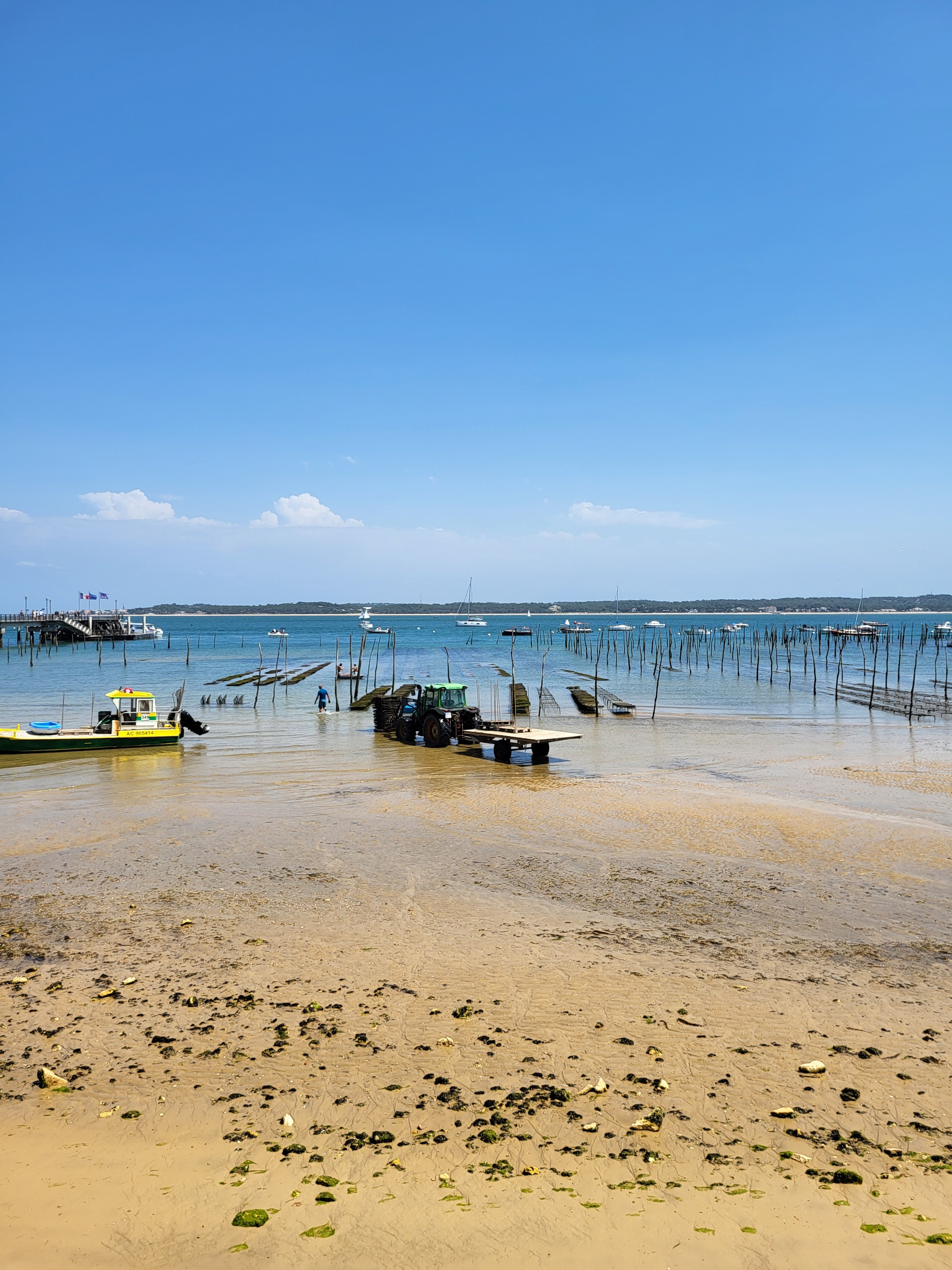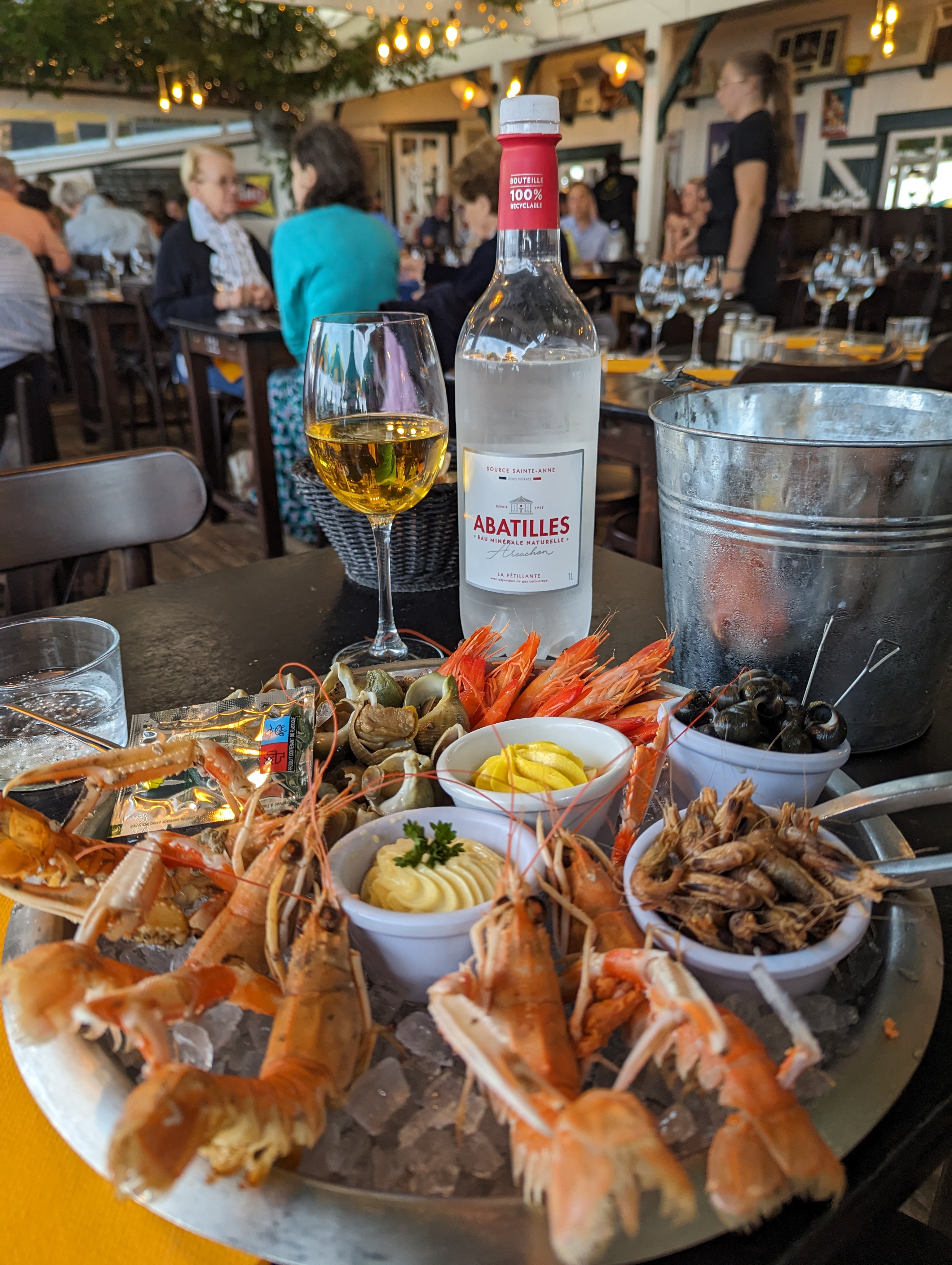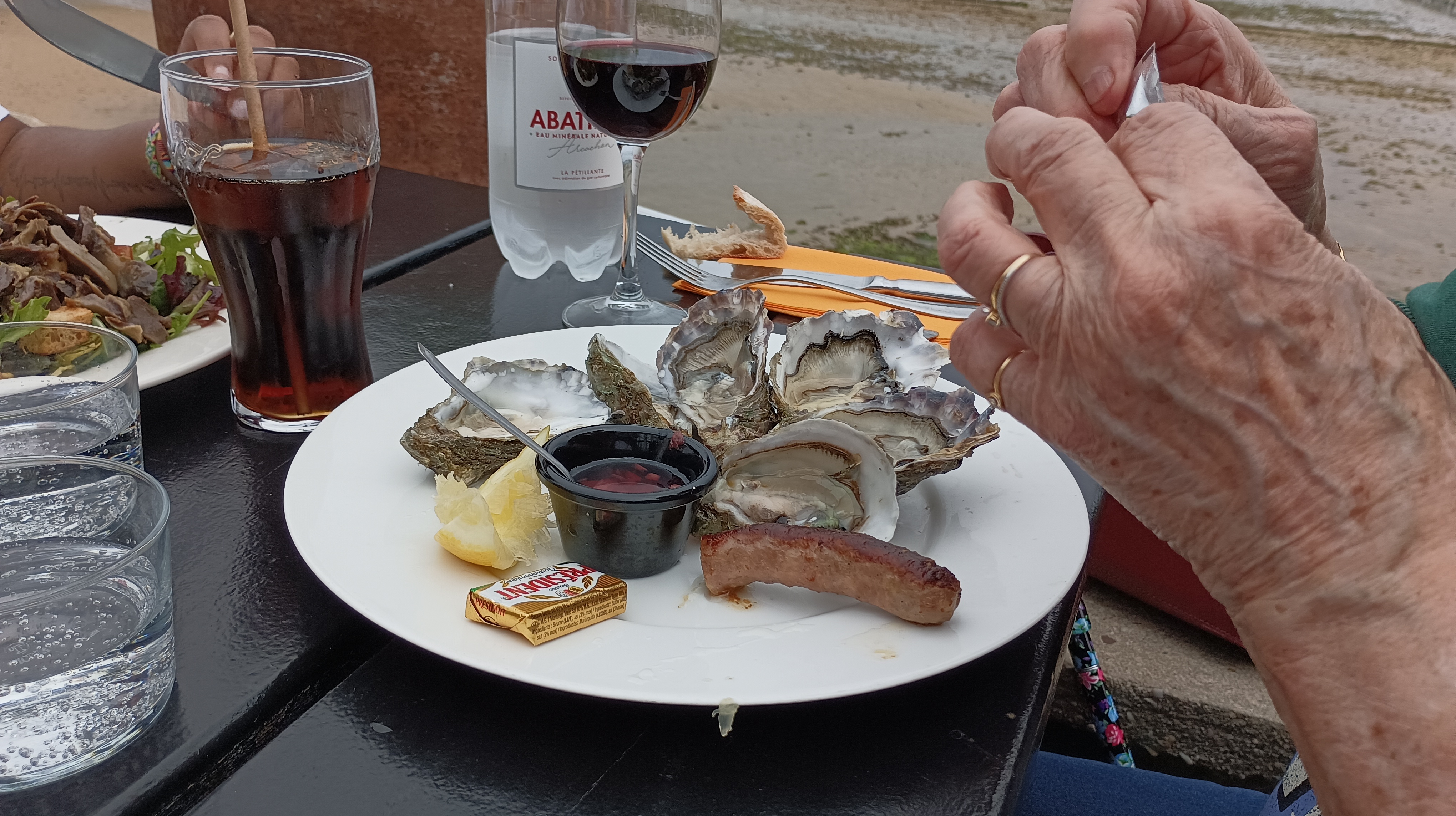 Nous avons apprécié de déjeuner au bord du bassin : huîtres, sardines grillées servies avec un écrasé de pommes de terre à l'huile d'olive et une assiette de fromage en dessert. Dommage que le pain donne une impression (réelle ?) d'être congelé. Le service était très sympa et efficace.
