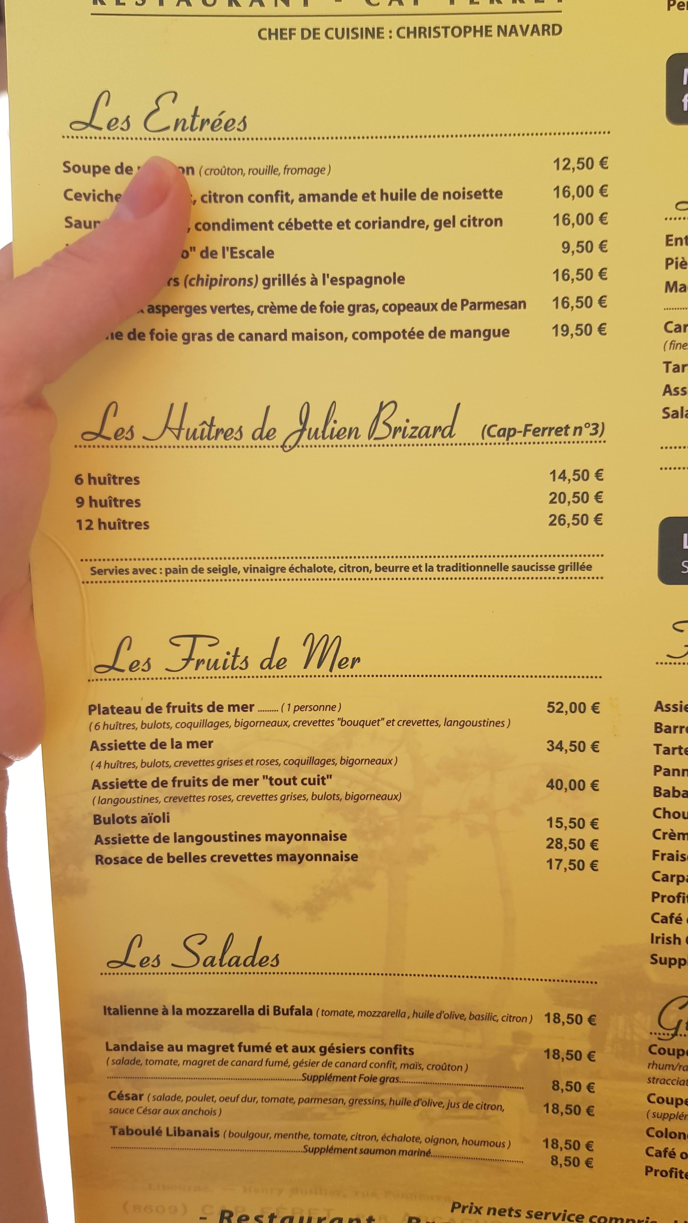 Accueil agréable. Le cadre est superbe, la vue sur le bassin… Les fruits de mers sont très bons et le service de qualité. Compter environ 25-30 euros par plat.