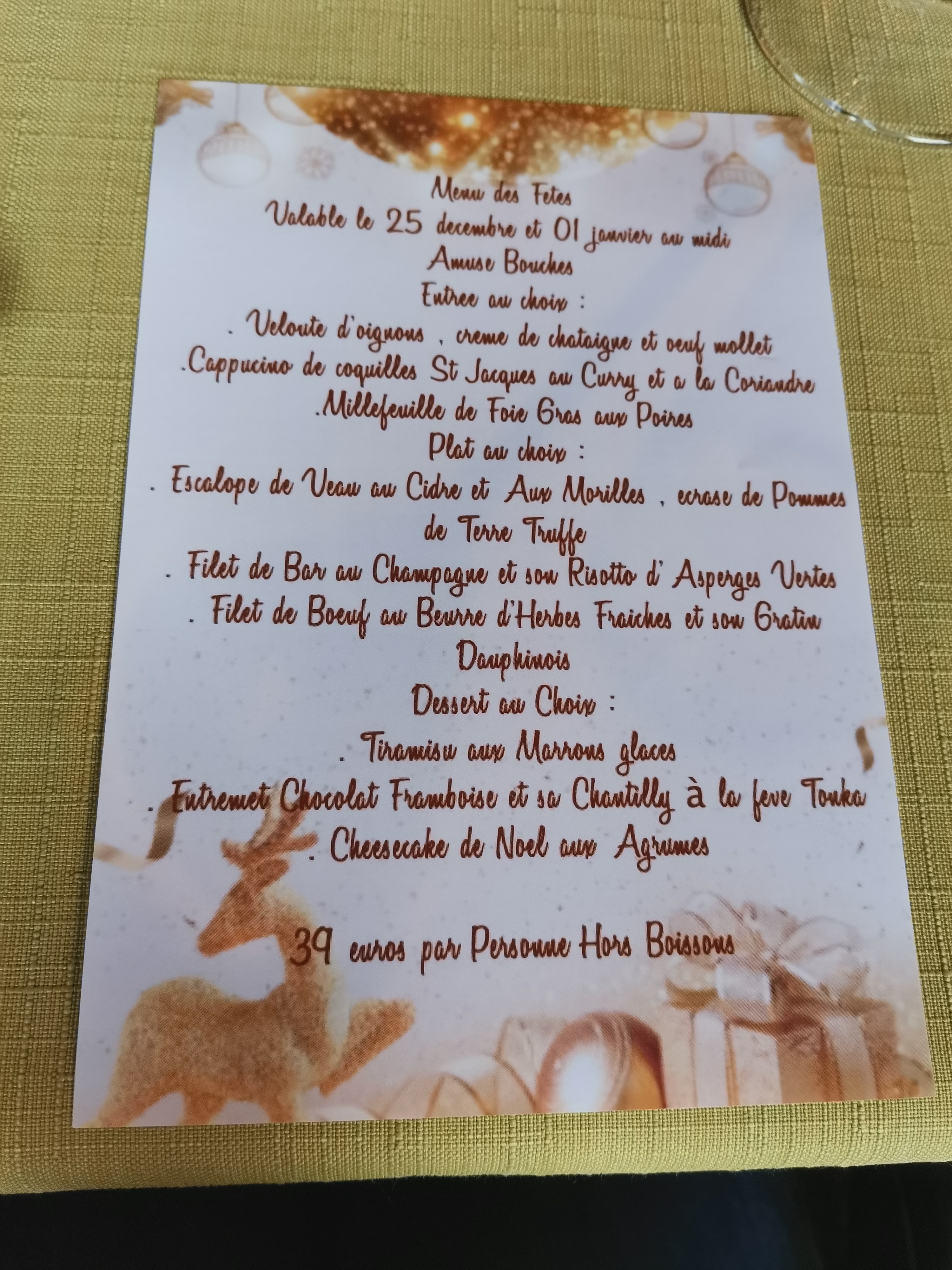 très déçu de la soirée du 14 février mon verre de chablis est arrive après l entrée pas d assiette pour l entrée je passe des détails très bon vin rouge au verre plat super bon restaurent a refaire mais dans le calme