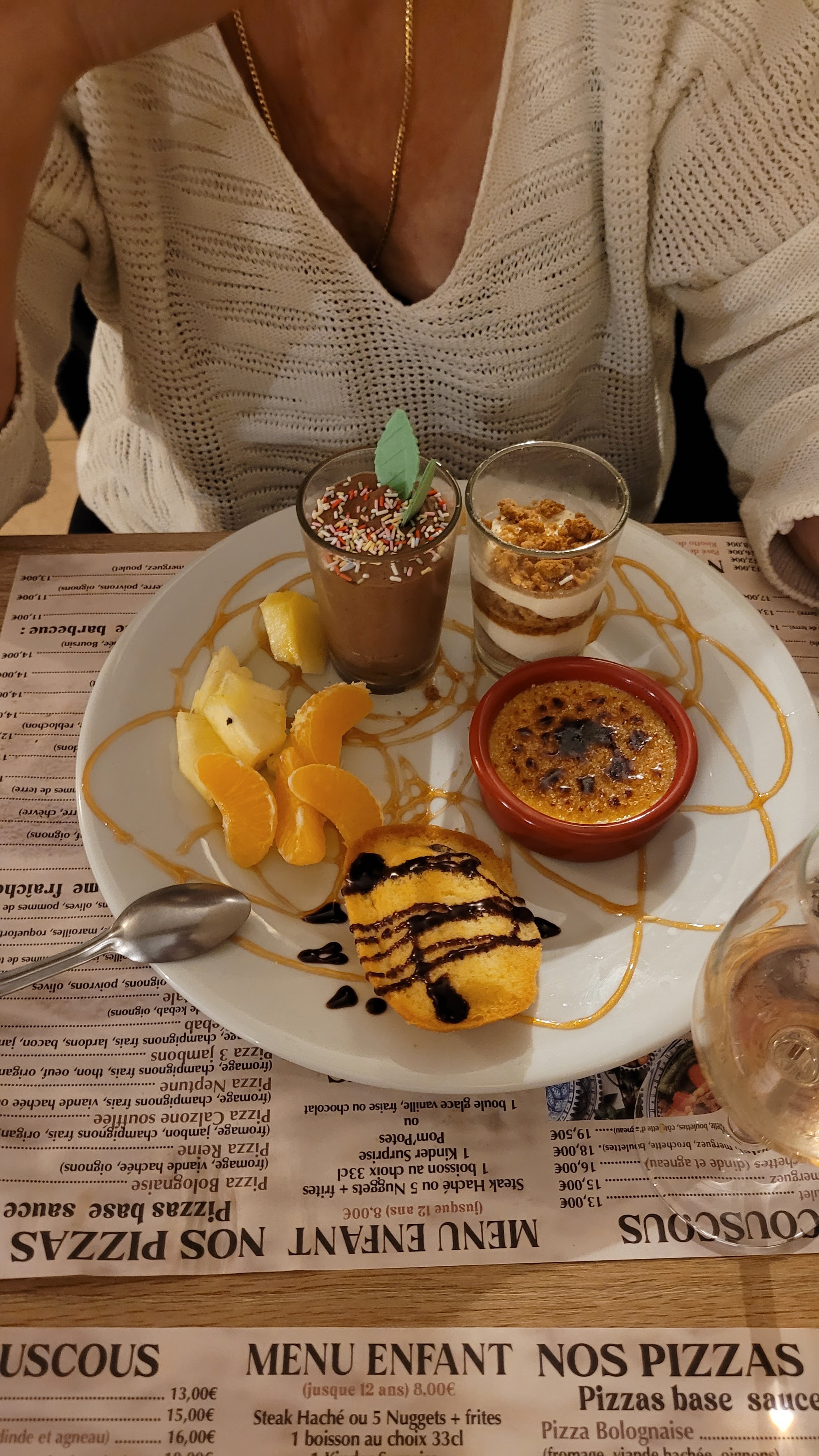 .trop copieux, beaucoup d attente.peut être un mauvais jours pour nous.et le champagne.....bof bof j ai un doute ! Les amusés bouches trop trop relevé,il faut surtout le dire lorsqu elle sont sur la table.( Le feu en bouche).et pour bouclé la boucle des enfants qui jouent,qui courent ,qui se cachent sous les tables.....bref sur 10 je met la note de 5. Un peu déçu 😉🤔😒