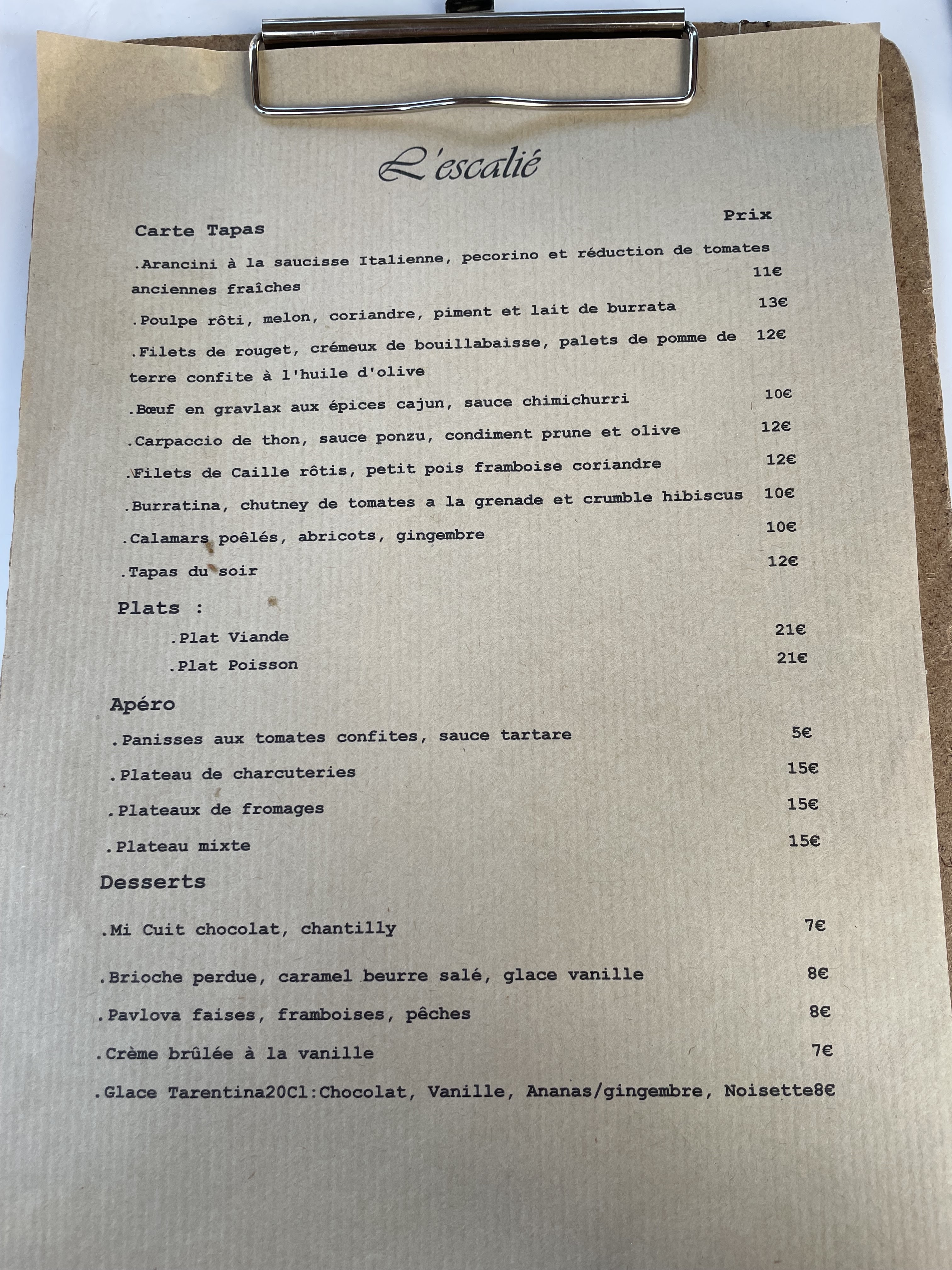 L'escalié est vraiment une bonne adresse à connaître absolument !!! La carte évolue régulièrement. Le restaurant propose généralement un menu du jour avec quelques autres propositions au menu. Les desserts sont travaillés et vraiment bons. Le restaurant propose aussi un brunch le dimanche assez varié avec de bons produits. Je recommande fortement !!!
