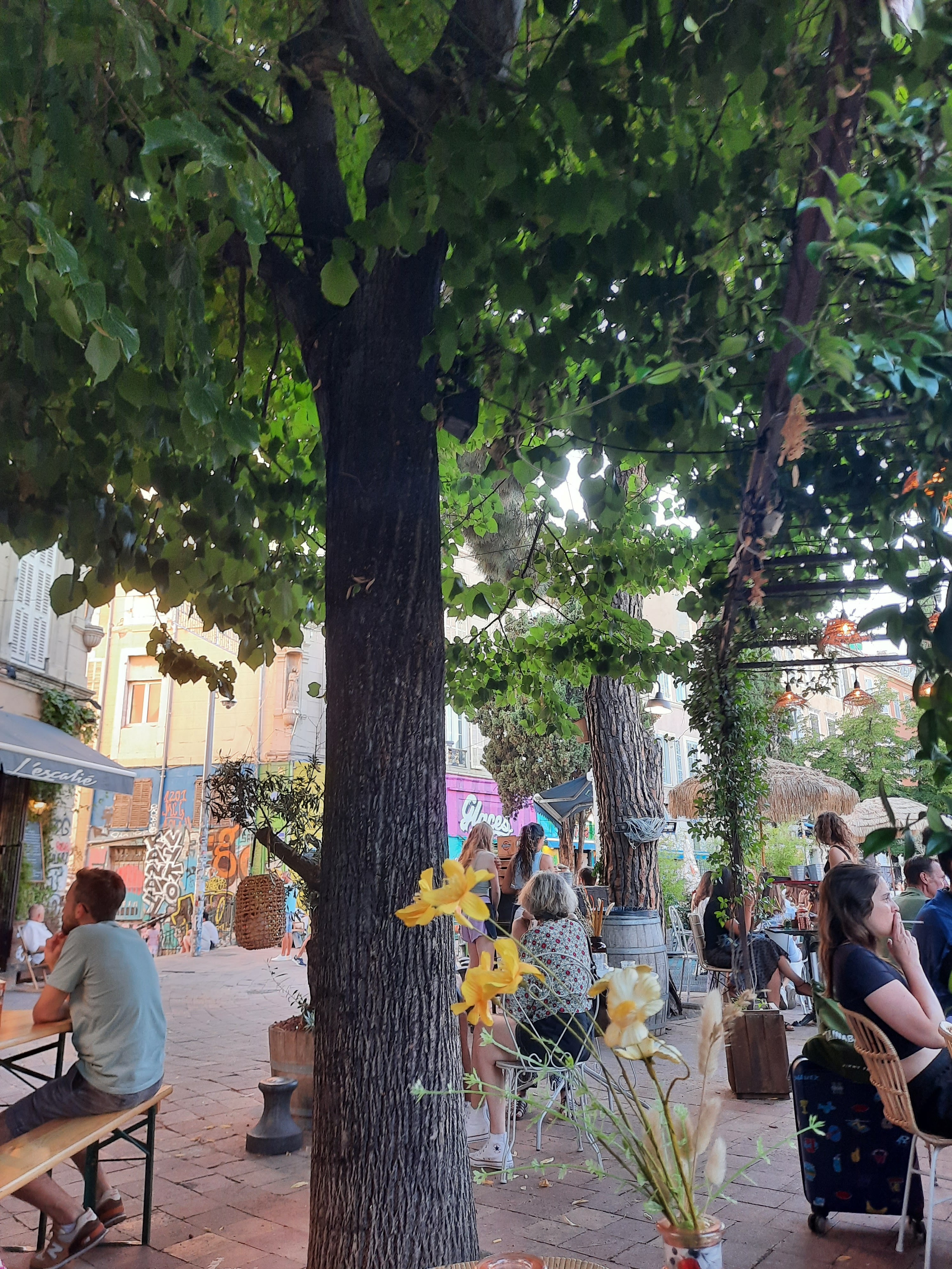 L’escalié propose une jolie terrasse entre l’escalier et la fontaine du cours Julien, décoration esprit paillotte. Cocktail Garde la Pêche à tester ! À partager : bonnes panisses, poulpe, arancini, tapas du jour, burratina. Et en dessert : pavlova fraises/framboises/pêches et crème brûlée.