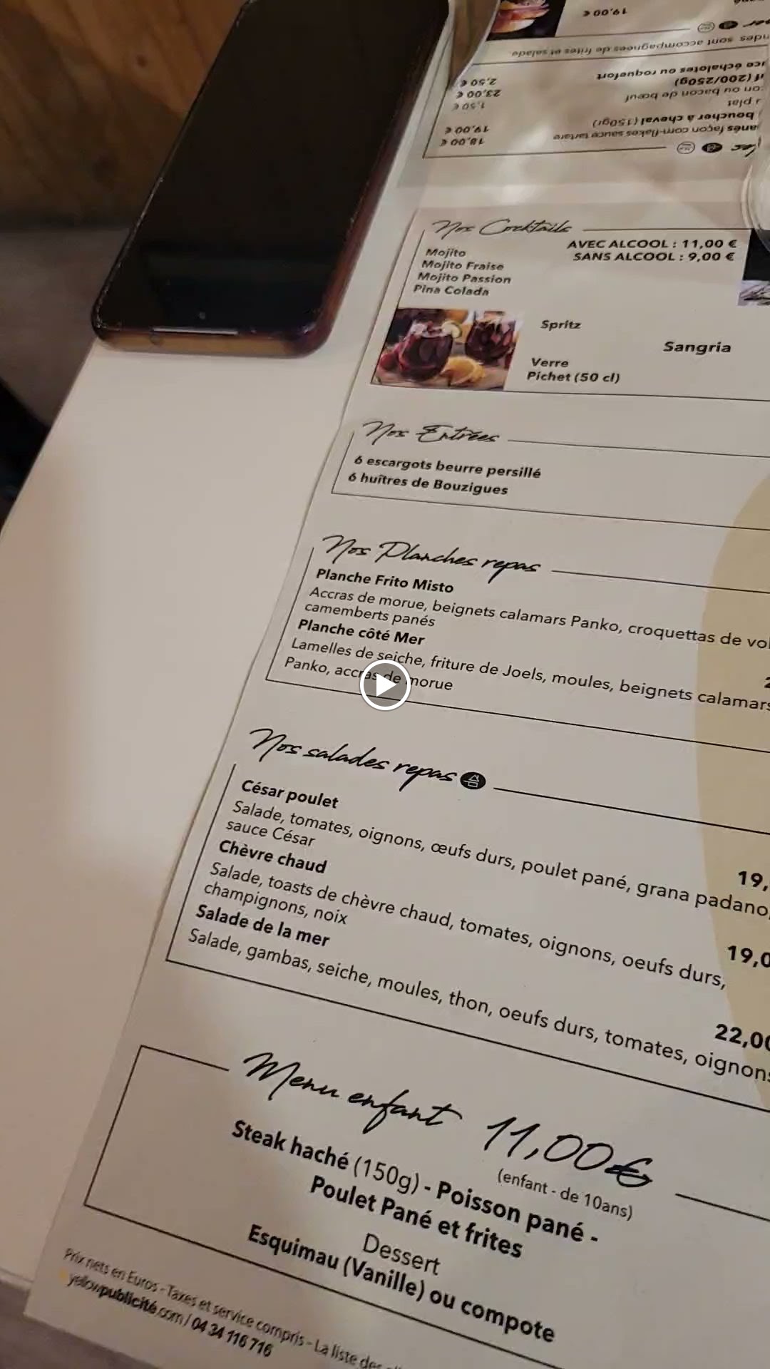 Tout est congelé et à prix fort, presque 100€ pour 3 Le plat de la Mer ( calâmar , sacra de morue … tout est congelé pour du bord de mer !!! ) une salade poulette , pour du poulet congelé et des vulgaires feuilles de salade, 2,3, morceaux de tomate et un pauvre œuf au plat ) franchement sans goût. Les menus enfants du poulet aux frites congelés Et les moules sans grand intérêt !!!! Je garantie pas que ce soit des produits frais !!! Franchement je n’y retournerai pas Qualité bas de gamme, congélation au MAX !!!! Ça ne me dérange pas de payer pour un bon resto mais là, je suis sortie et je n’ai rien mangé et de surcroît j’étais écœurée !!!