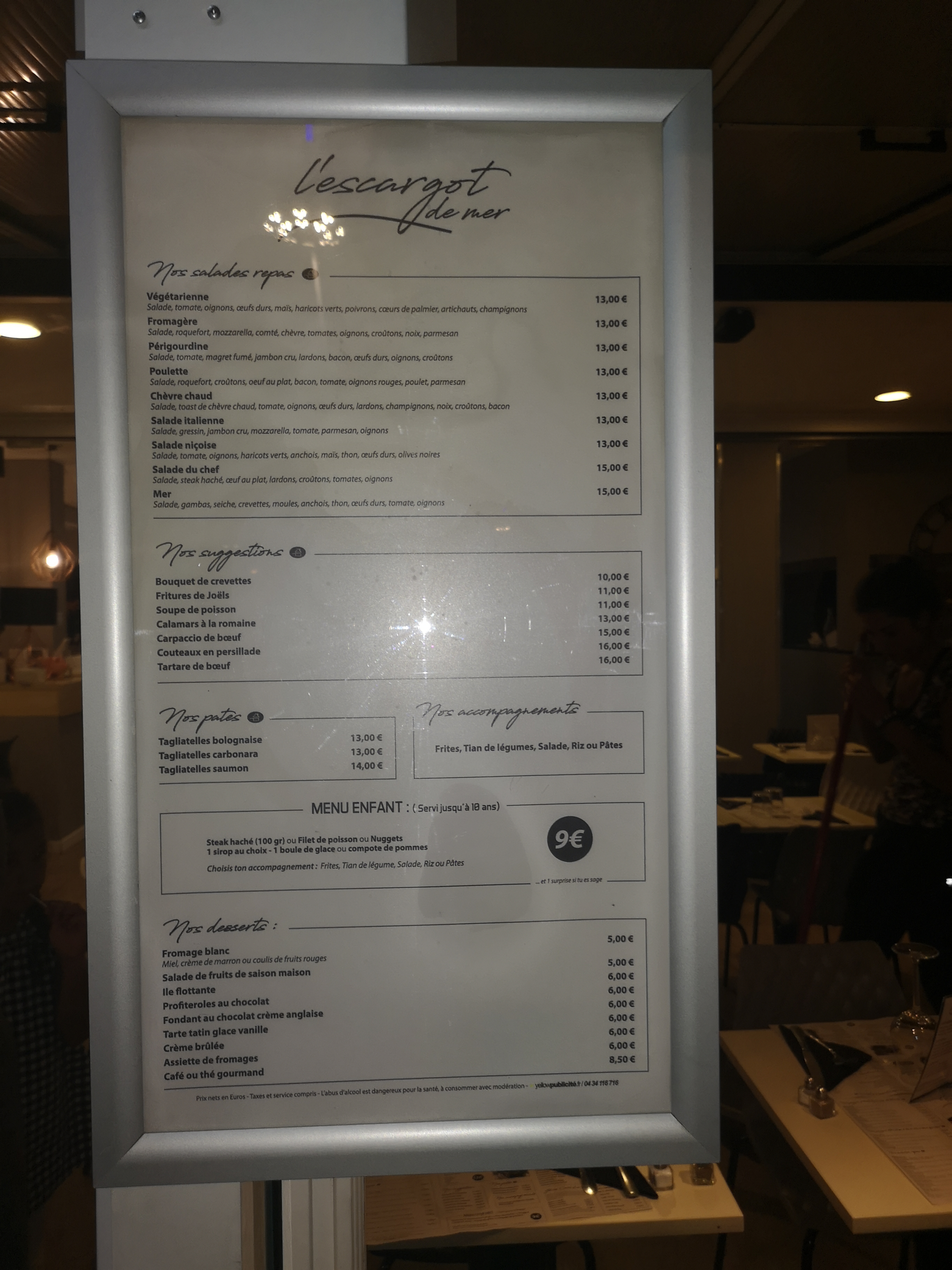 Nous avons dîné hier à l'escargot de mer. Bien que nous n' ayons pas réservé la personne à l'entrée très agréable nous a trouvé une place en 10 minutes alors que tout était réservé et bon dé. Nous avons pris des salades repas très copieuses qui étaient un régal pour les yeux et pour le goût. Personnel très accueillant et souriant. Je recommande ce restaurant pour un bon rapport qualité /prix. Allez y les yeux fermés 😉