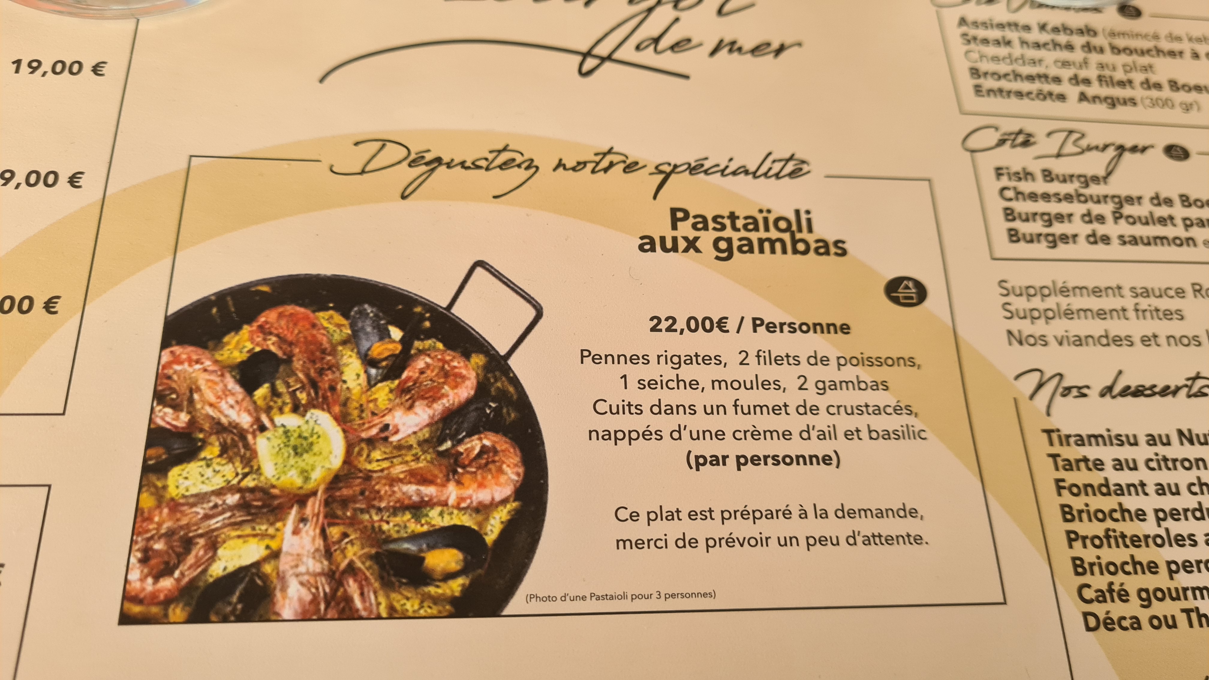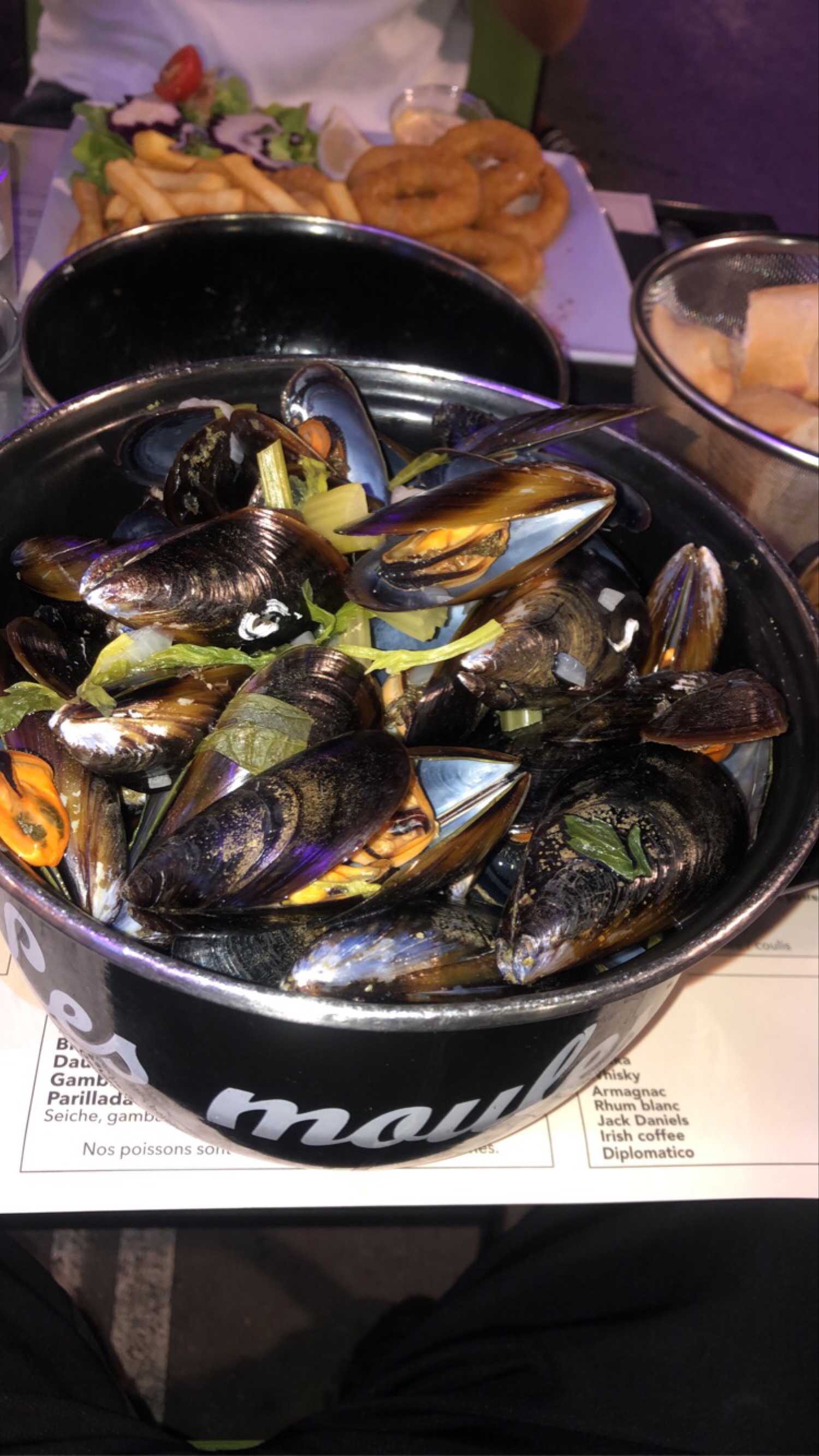 J'ai mangé moules frites, elles sont délicieuse, bonne quantité. Le plat principal pastaiolli est également très bon, mais il manque de garniture au niveau des fruits de mer je trouve que ce qu'il y a dedans est un peu légé surtout par rapport au prix.
