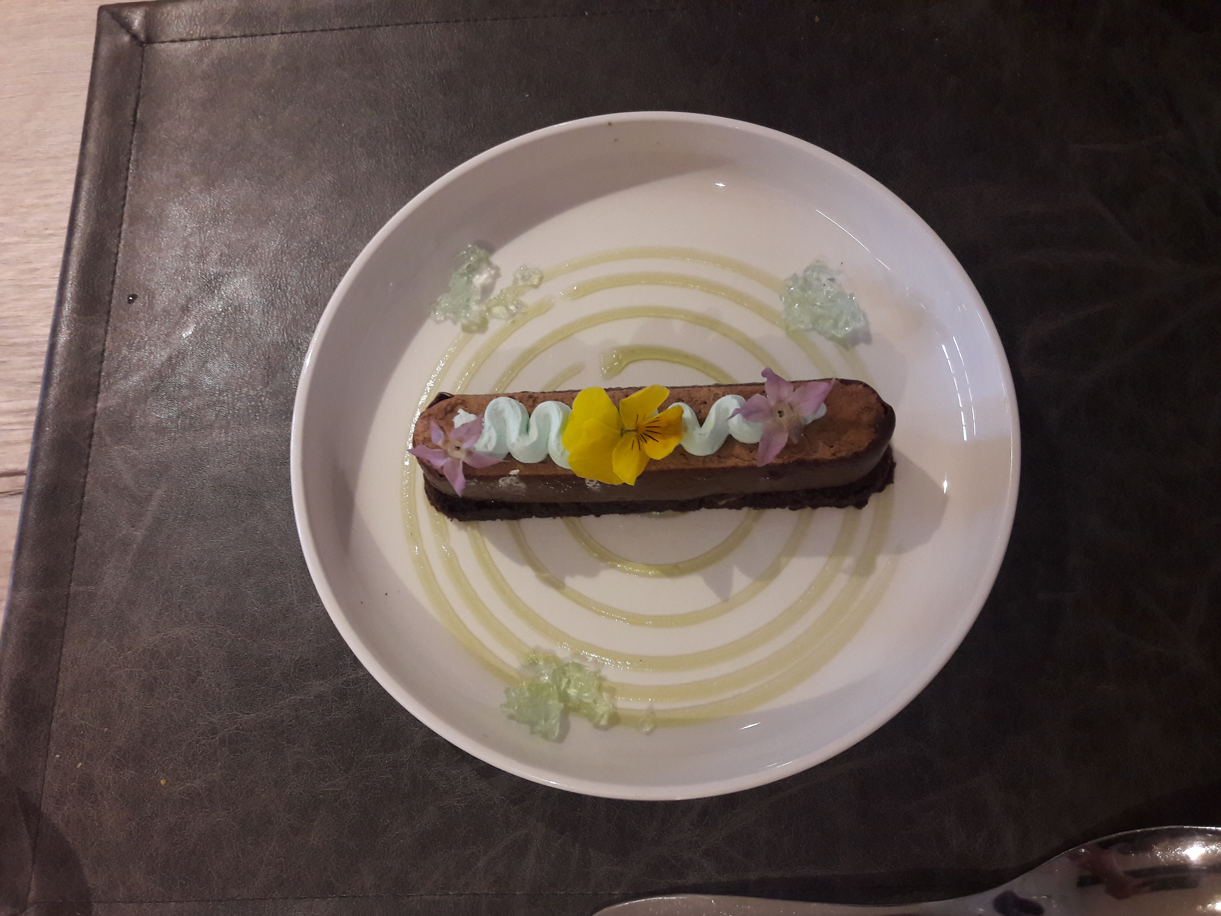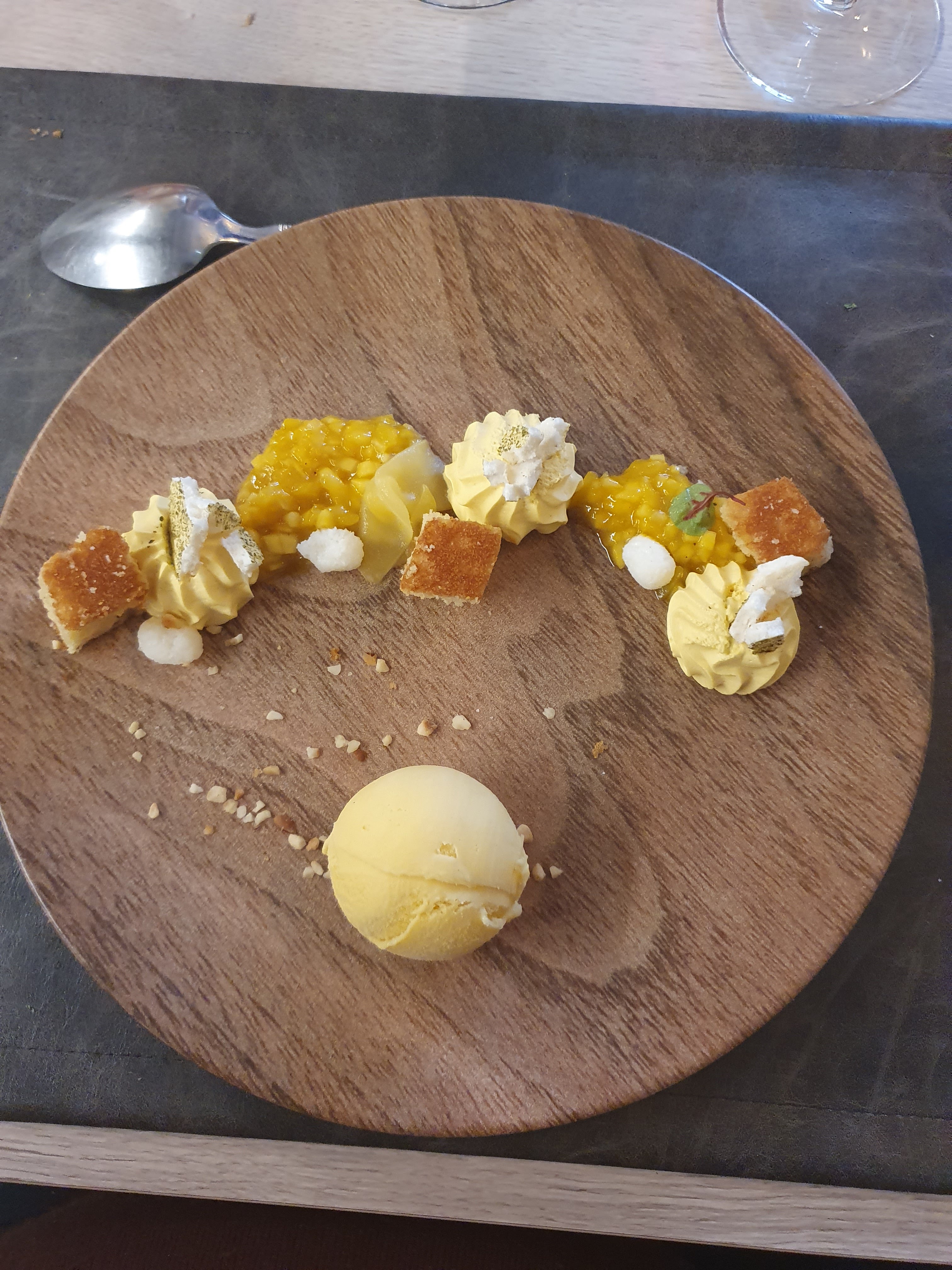 Entrée, terrine plutôt bonne noyée avec des accompagnements acide ou sans intérêt, le plat souris d'agneau, ouais ben il était très fort pour un agneau, accompagnement semoule façon bébé et une ratatouille infecte. Dessert, merci le fournisseur local de glace car ce n'était pas l intitulé. Ben pour le prix c était pas à la hauteur. Le vin, choix limité en Loire, de la grosse piquette vendue une fortune. Sans moi.