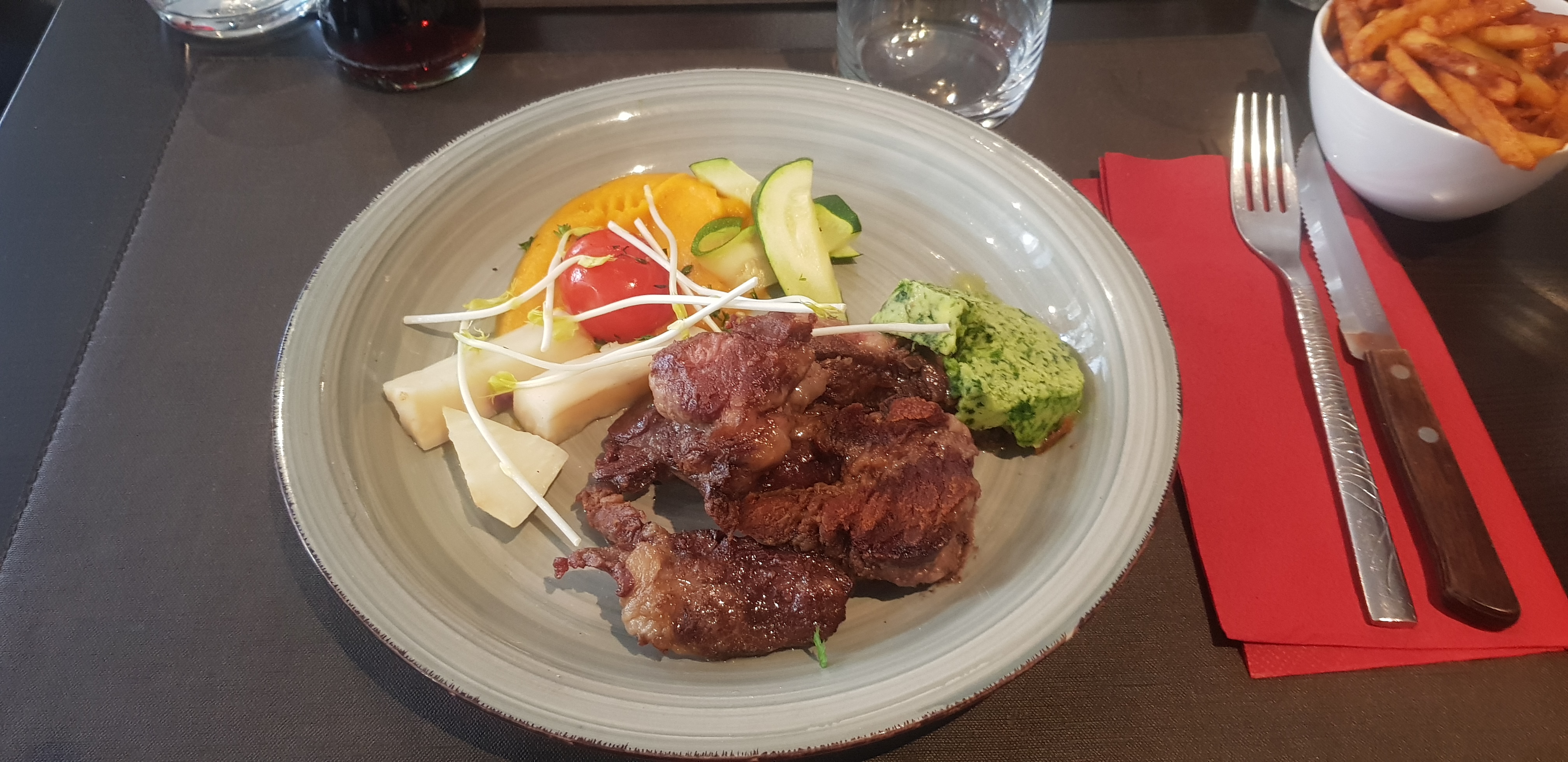Un cadre très agréable et des plats délicieux ! Nous sommes arrivés affamés un midi avec nos deux enfants de 2ans 1/2 et 6 ans :D Le serveur, très sympathique de plus, à tout de suite pensé à ramener un pot de crayons et des feuilles de brouillon aux enfants. Ce n’est pas partout et c’était très appréciable, nous avons pu attendre paisiblement notre repas :) Place au repas : des ingrédients frais et des plats préparés sur place. Personnellement j’ai pris le cordon bleu qui est accompagné de frites faites maison et quelques légumes, il était délicieux ainsi que la sauce qui l’accompagnait et très bien présentée (comme on peut le voir sur la photo). Les enfants (à qui ont à pris un menu pour 2 car on sait qu’ils ne terminent jamais un plat entier chacun) c’était donc un rumsteck et une portion de frites (très raisonnable et le serveur nous a proposé de nous en apporter à nouveau) avec également des légumes. Ils ont très bien mangé également. Pour le dessert j’ai pris la crème brûlée qui était très bonne. Si je devais donner un petit bémol c’était les frites un peu trop salées à notre goût, le mieux serait de laisser le client saler à sa guise je pense. Mais ce n’est qu’un léger détail qui ne nous a pas empêché de nous régaler ! Et puis nous n’avons pas pensé à faire la remarque au serveur mais je suis sure qu’il aurait proposé de rectifier cela :) Pour conclure, une carte avec « peu » de choix qui est gage de produits frais et de qualité, et ça nous aimons beaucoup , de plus les prix ne sont pas excessifs du tout ! C’est une adresse assez éloignée de notre domicile mais nous y reviendrons avec plaisir lorsque nous serons dans le coin ! Vous aurez compris que si vous voulez passer un bon moment et vous régaler c’est la bonne adresse !