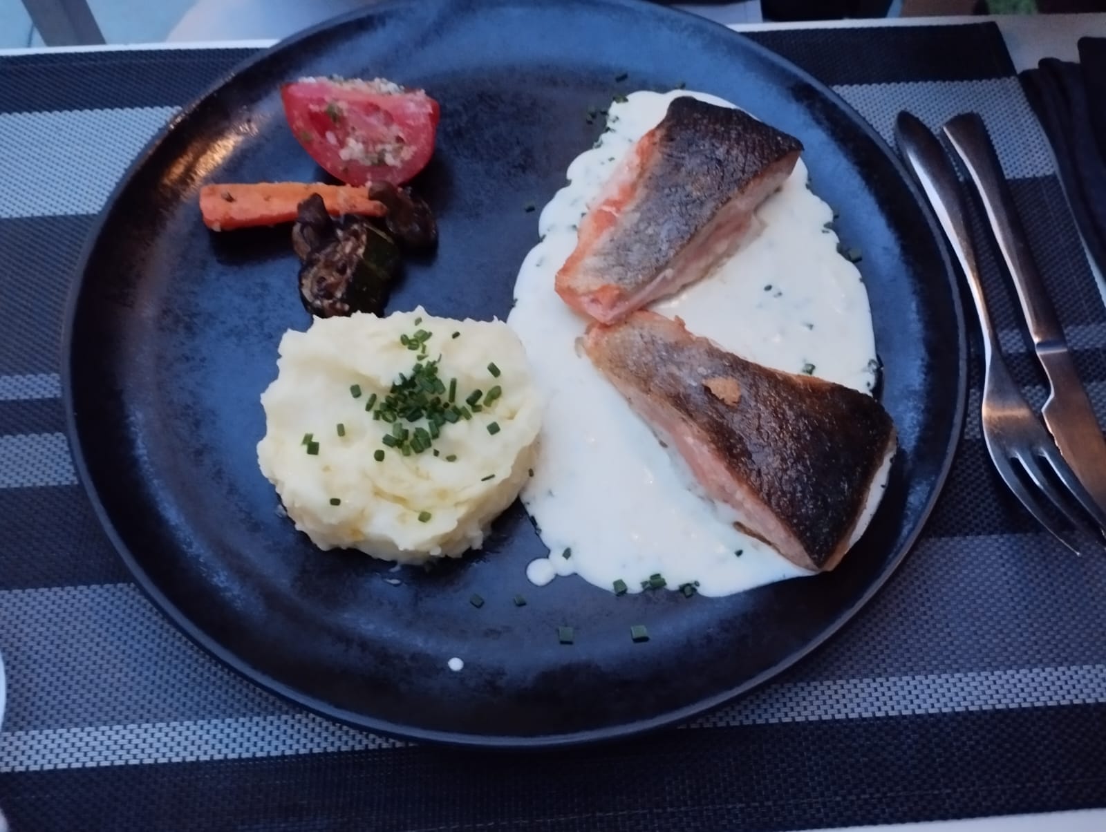 Le restaurant est situé un peu en dehors du cœur de ville où tout se passe à Sarlat. Alors par facilité, on a failli faire l'impasse. Quelle erreur on aurait fait ! Certes, le restaurant n'est pas installé dans une vieille bâtisse médiévale. Au contraire, c'est moderne. Mais l'accueil est impeccable comme le service, d'ailleurs. Les serveurs sont souriants et à l'écoute des besoins des clients, même des grincheux assis à côté de nous 😅 les plats sont travaillés, tout est frais et fait maison et ça se sent ! Le pavé de saumon était juste parfait ! Et le chou à la crème de pistache avec son petit coulis de framboise m'a laissé baba. C'est propre, on s'y sent bien et avec des plats savoureux autour de 20€, que demander de plus ?
