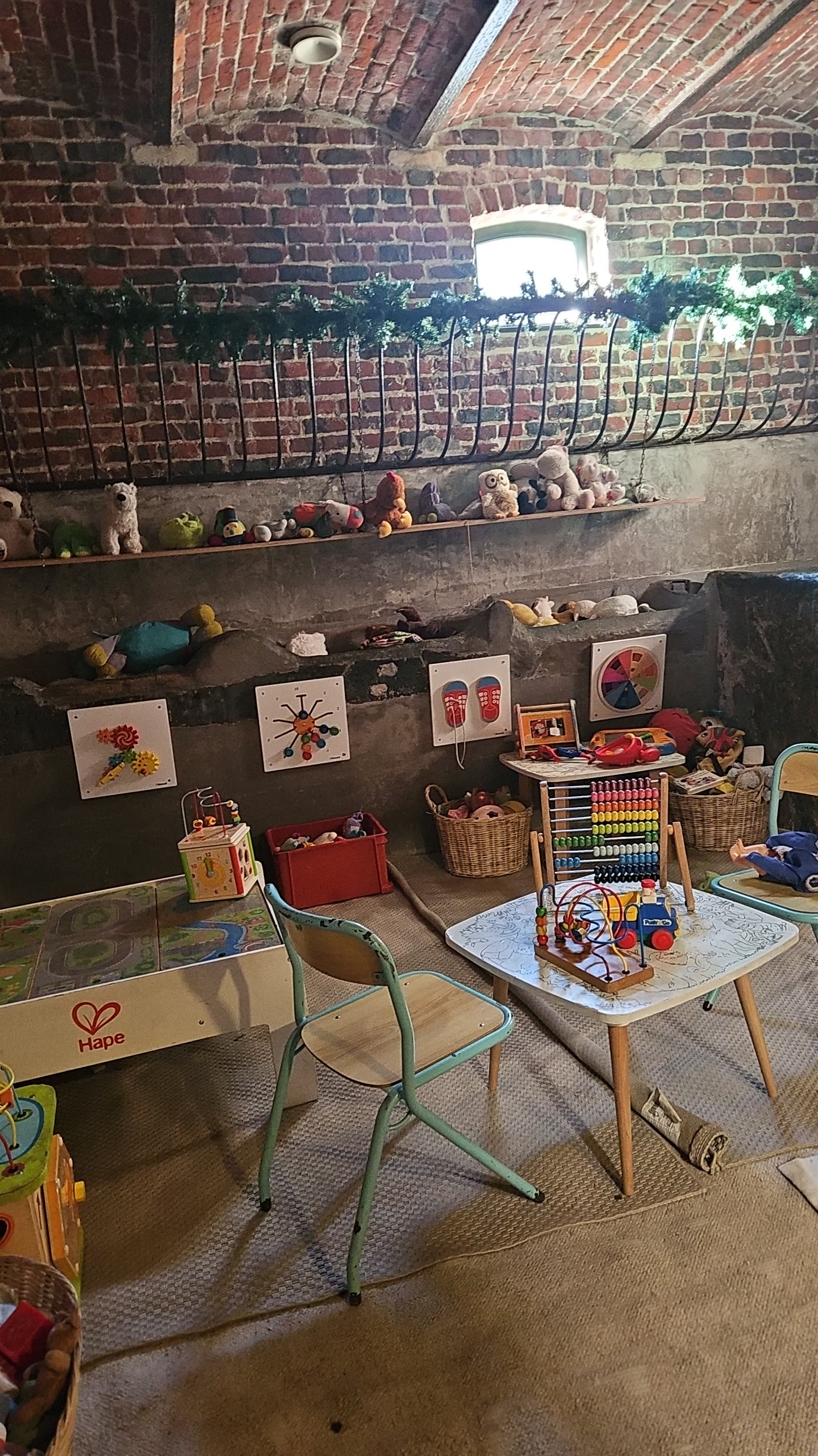 Le lieu est magnifique, il y a un baby foot et une salle pour les enfants avec jeux, des jeux de sociétés sont à disposition aussi. La carte est variée, un peu déçue de l’offre végétarienne ( pour info les végétariens ne mangent pas de poissons 😅) c’est dommage pour un estaminet de pas avoir un Welsh sans jambon. Après les plats sont très bons et le cadre mega kidfriendly, même si le plat enfant reste assez cher, c’est un super lieu ☺️