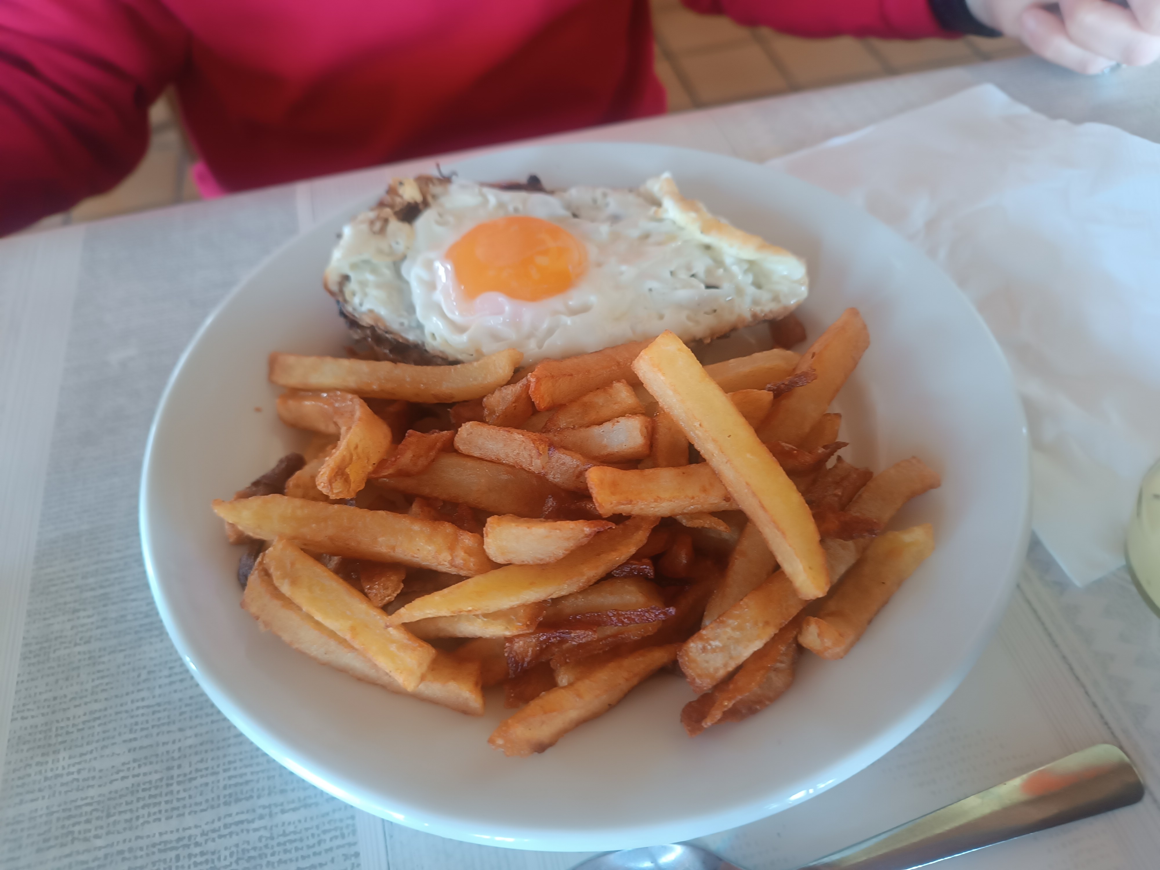 Assiette bien garniei servie chaude avec le sourire du jeune homme Dommage les frites n'étant pas maison Plateau de fromages mis sur table Dessert copieux coupes chantilly Menu 16€50 avec le vin La dame du bar pas souriante Grand parking goudronné