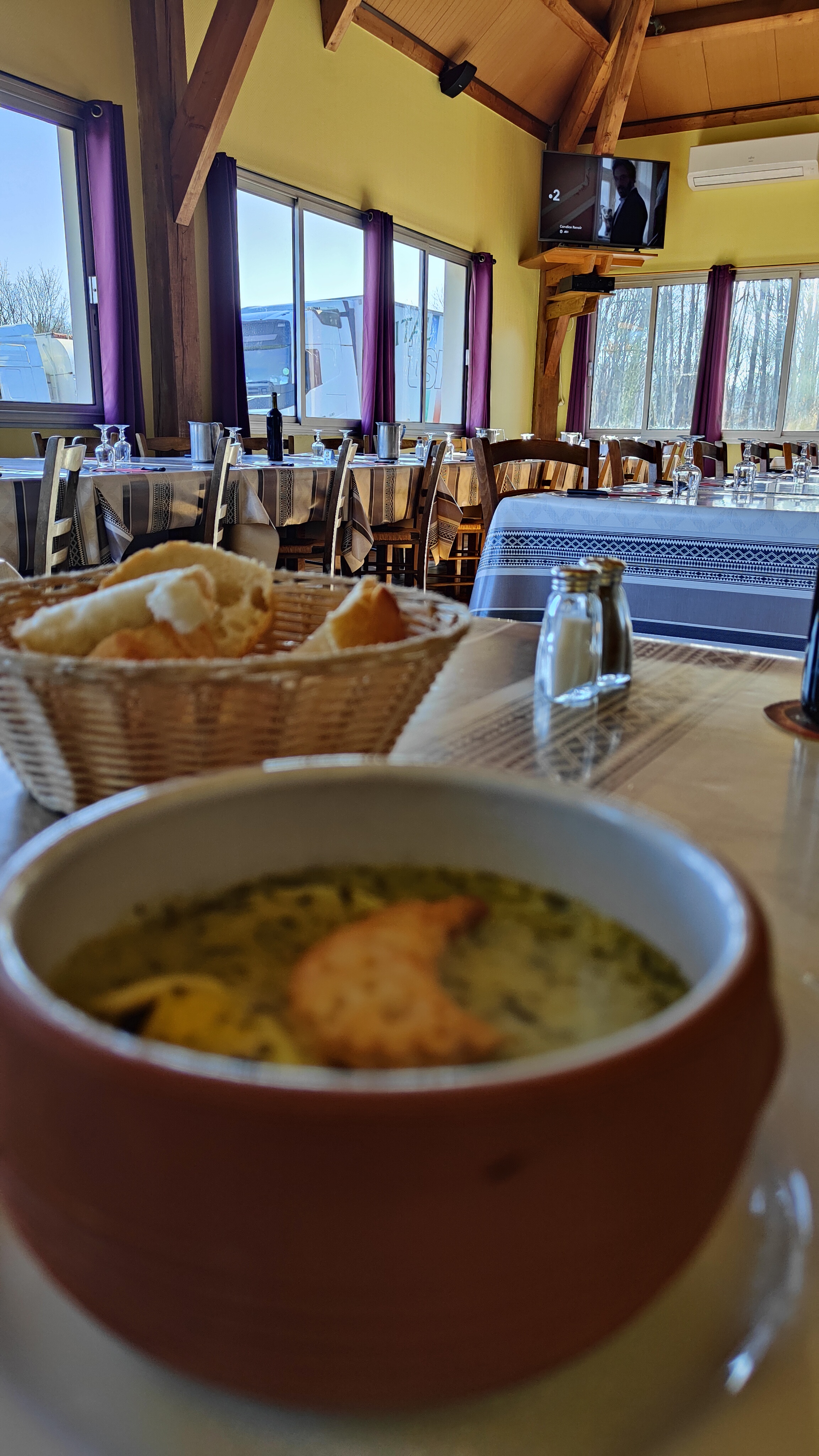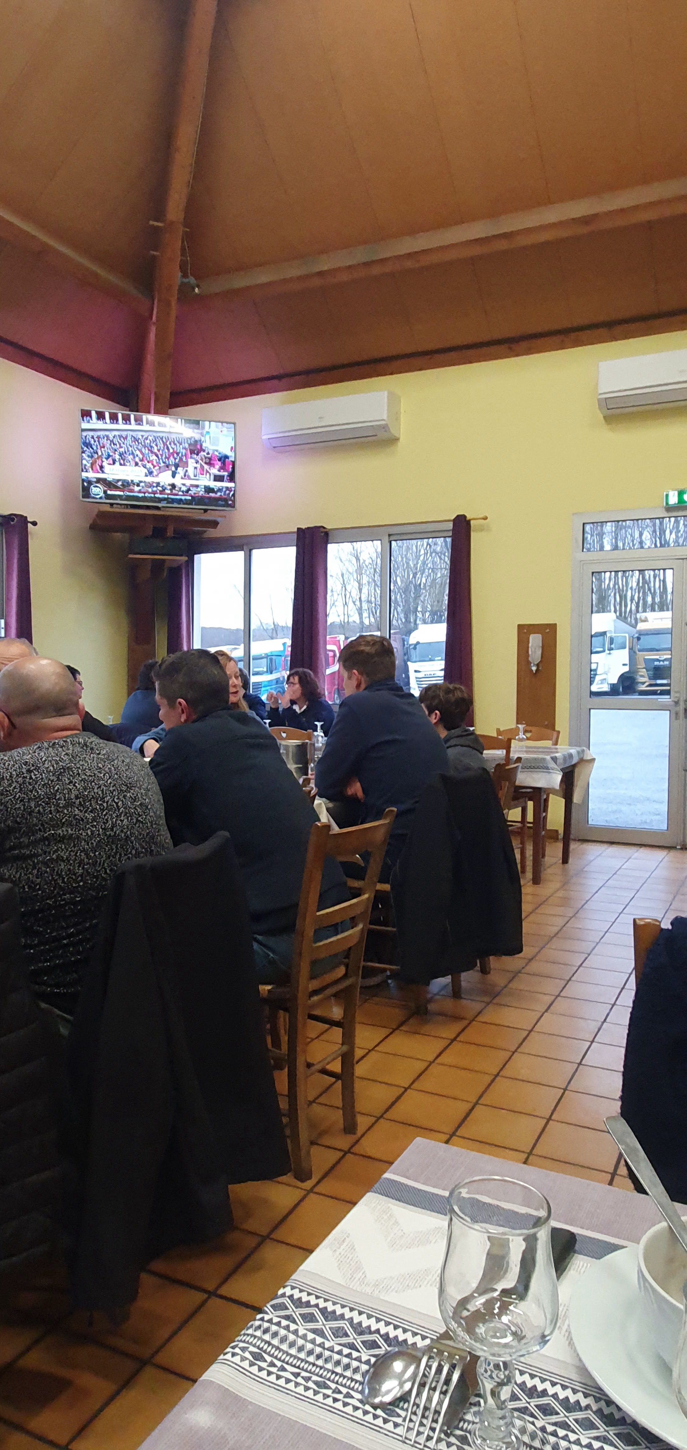 C'est une journée pluvieuse, très pluvieuse. On aperçoit en contrebas de la N145 un relais routier. Le parking immense est presque vide. Nous on rentre de vacances. On a faim, ben ça tombe bien, le repas est copieux, bien chaud. L ambiance : en rang d oignons on mange, tranquilles, c'est vraiment bon. Pour 14 euros un menu complet : entrée, plat, fromage, dessert, carafe et vin et café, c'est royal. Entre temps le restaurant s'est rempli, l ambiance est bon enfant, les serveurs courent dans tous les sens. Je recommande cette adresse. Merci aux patrons très gentils.