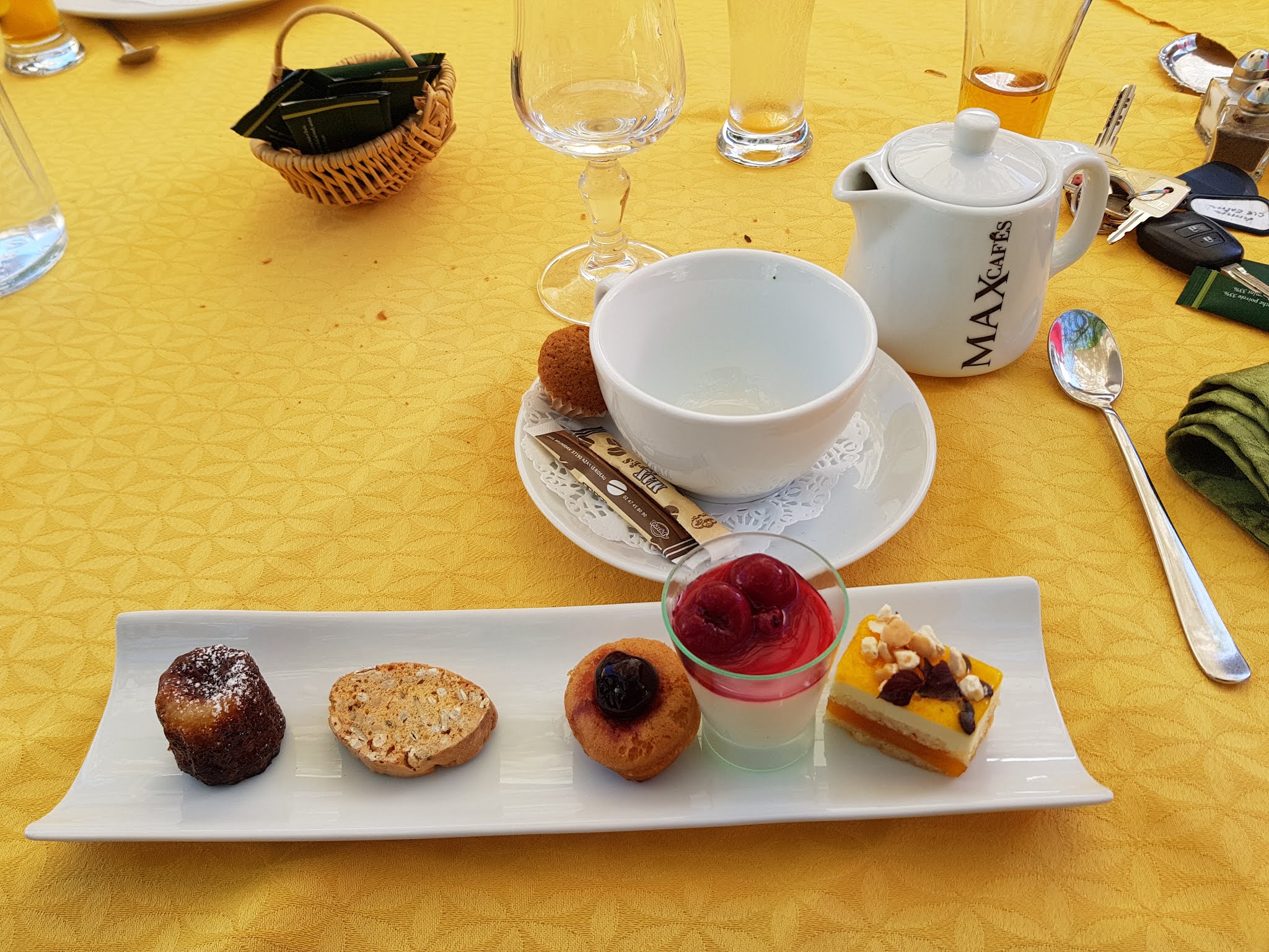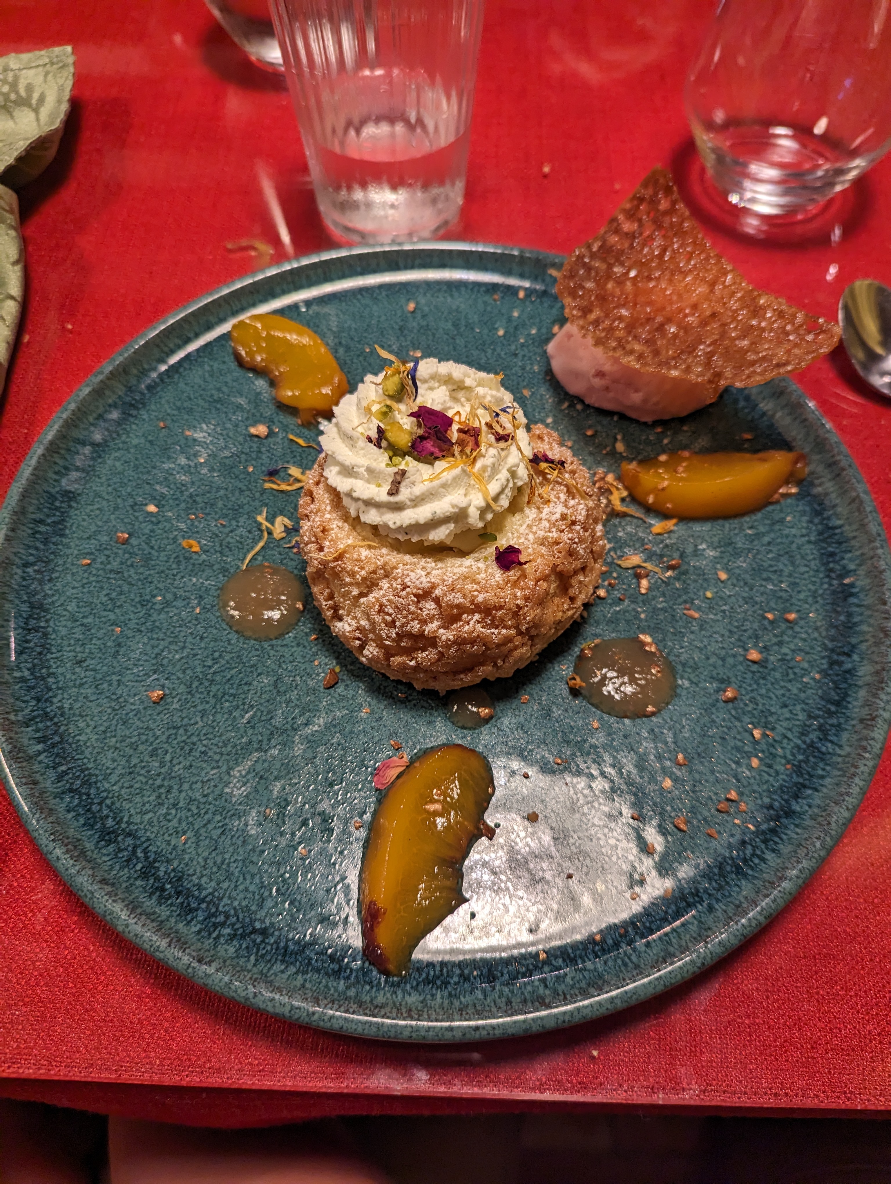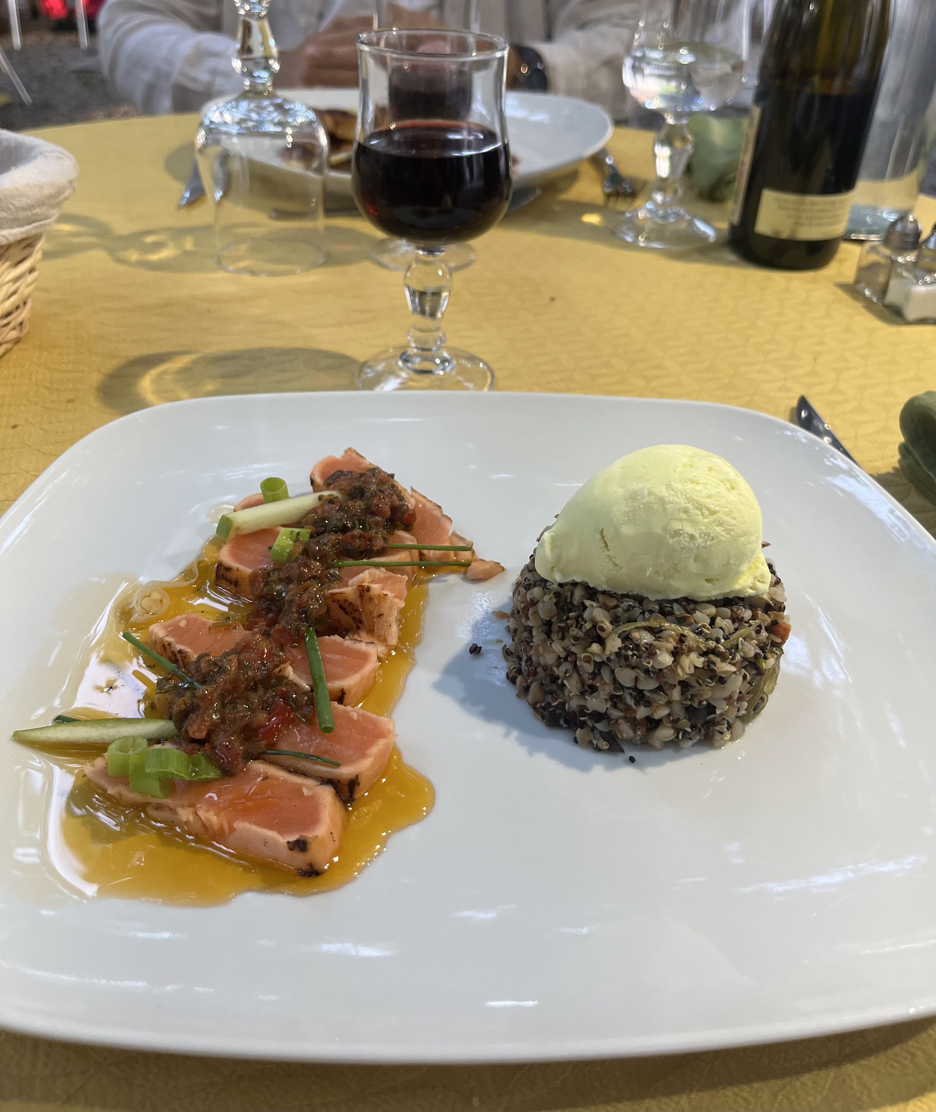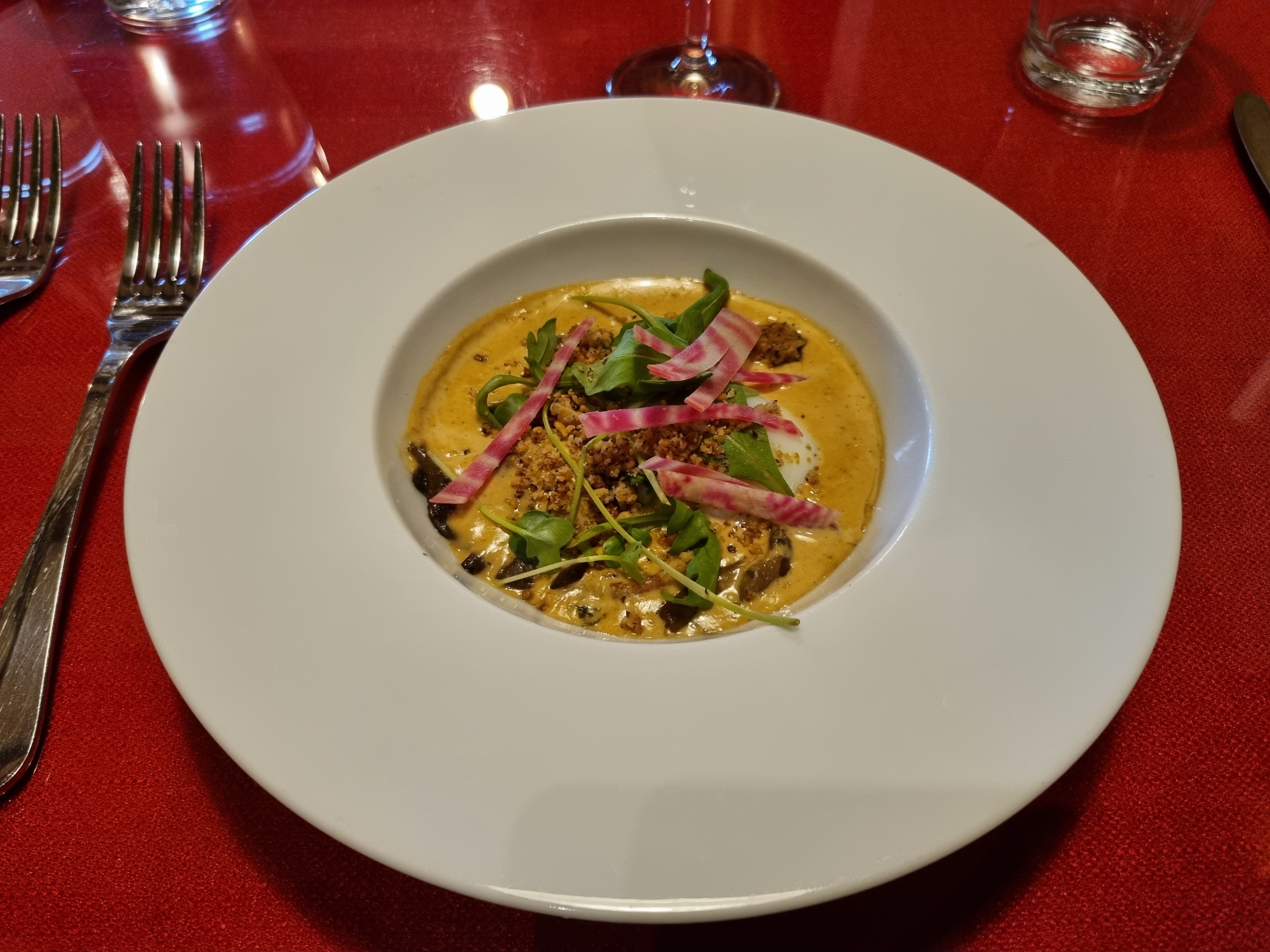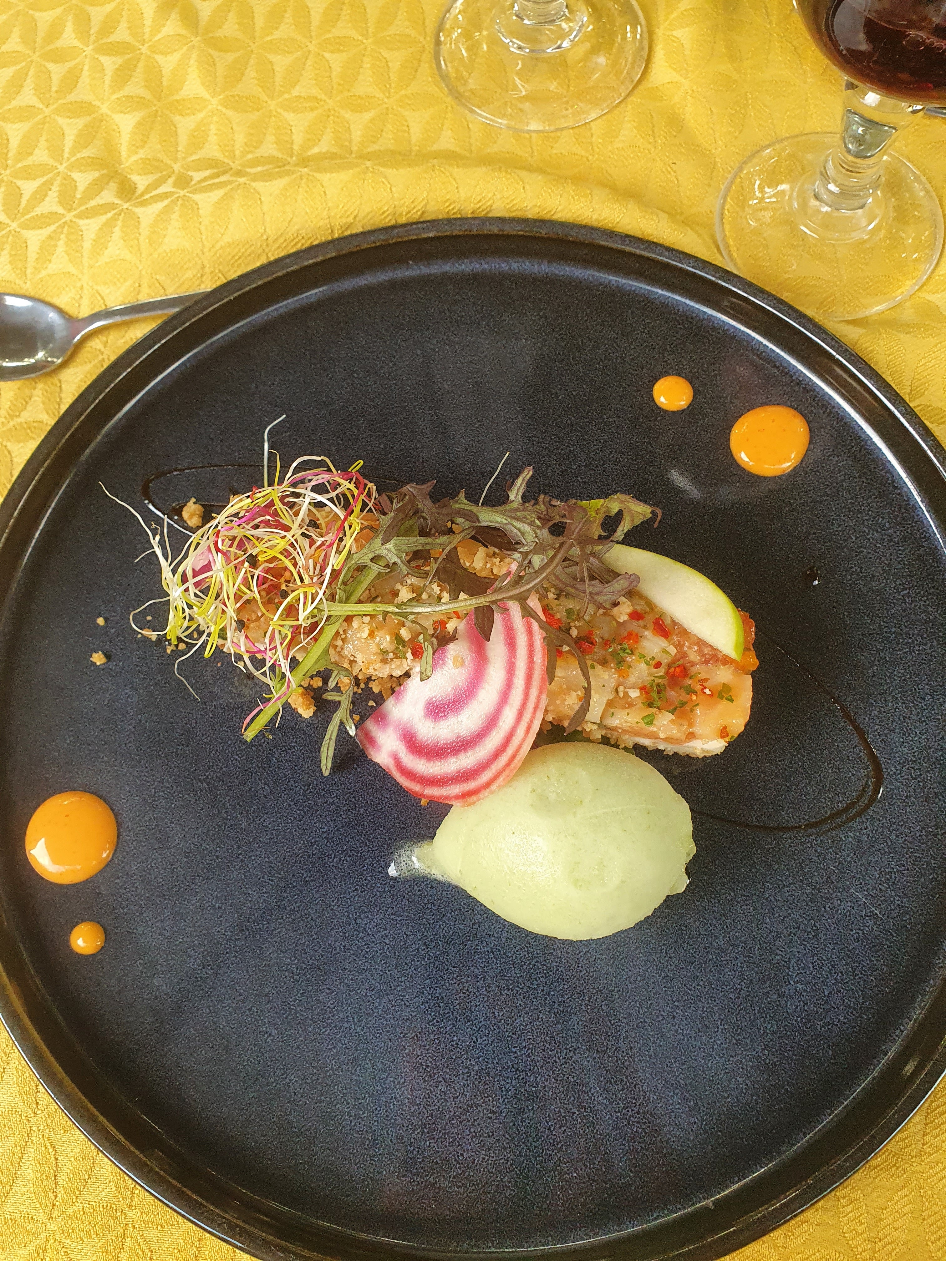 Un cadre champêtre avec des tables disposées de ci delà afin que chaque groupe puisse rester dans sa «bulle», un personnel très impliqué, souriant, accueillant, rapide. Le plat du jour pour 19€ (saint Jacques avec du riz noir bourré de petit pois). C’est bon mais pas exceptionnel, la quantité me manquait un petit peu mais ça permet de finir le dessert qui est goûteux. On peut remonter sur le vélo sans être «repu».