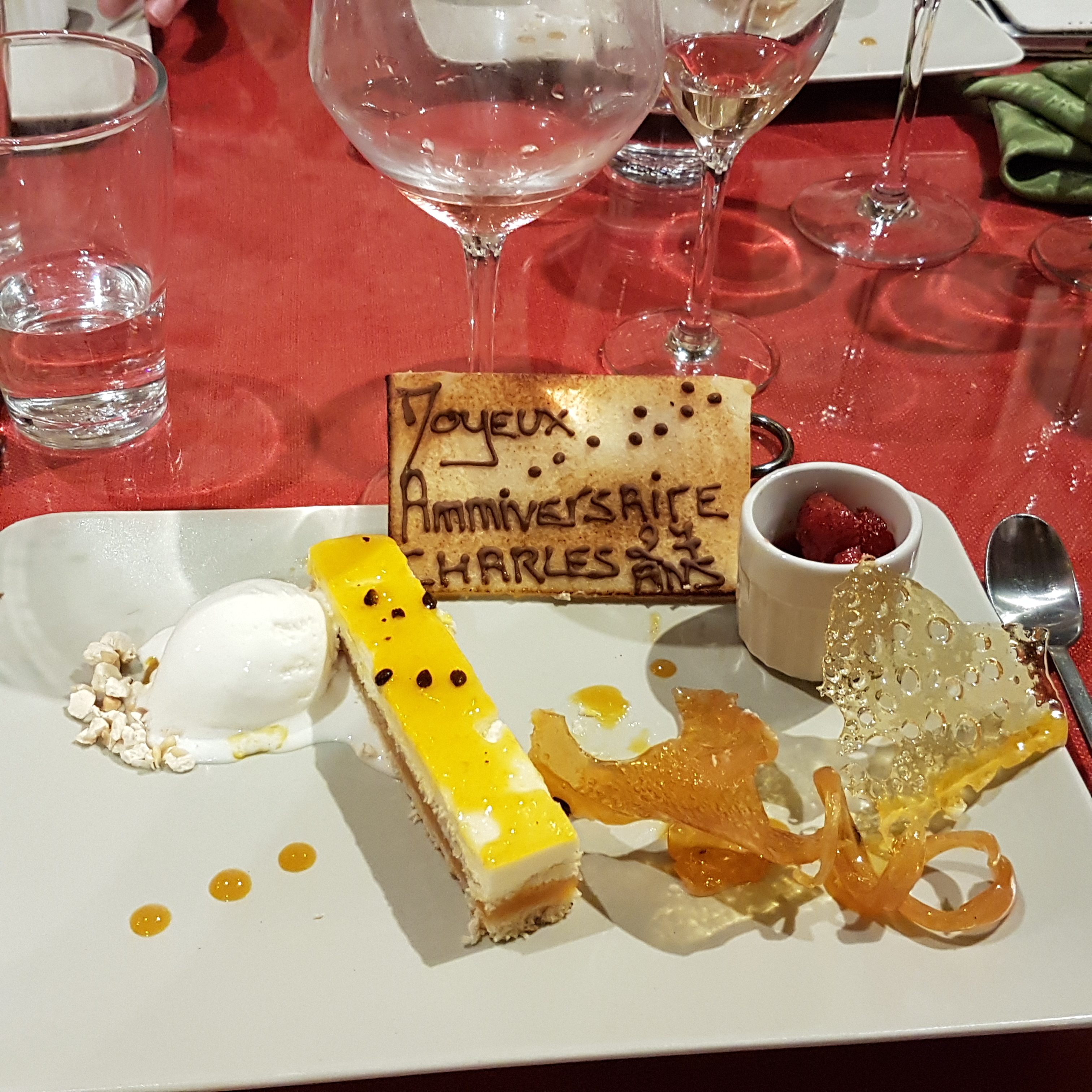 Mille mercis pour cet agréable moment passé à l'ombre des mûriers ce dimanche 24 juillet pour ce repas d'anniversaire. Belle attention avec le message sur la table... Fort chaleureux accueil (et ce n'était pas que grâce à la température de l'air !), bienveillant service et délicieux plats. Tous les ingrédients furent réunis, comme toujours, pour qu'au menu de cette pause gustative, dans ce havre de paix, le plaisir des papilles soit au rendez-vous ! Merci pétillante Laurence et merci passionnée Alex !