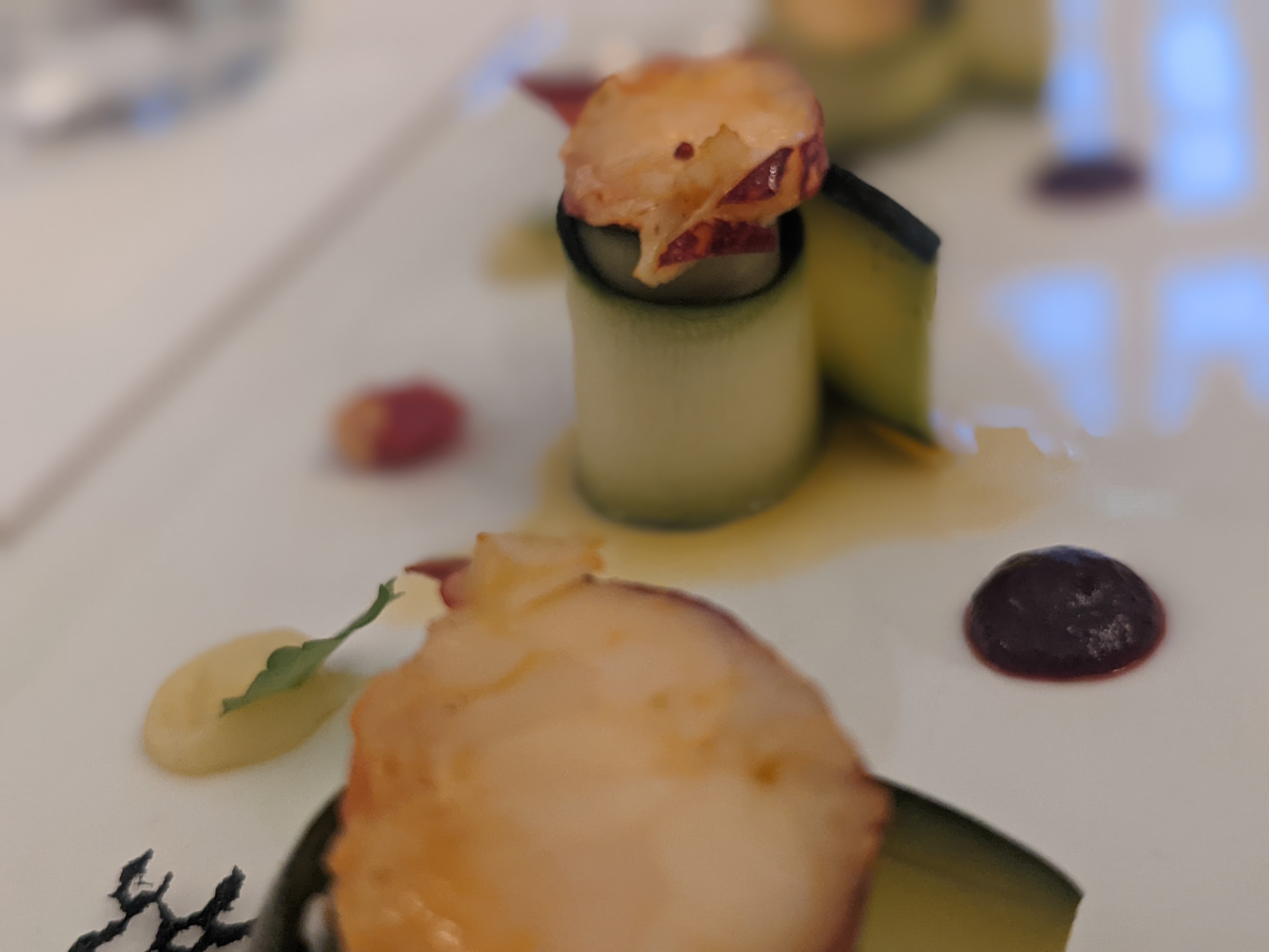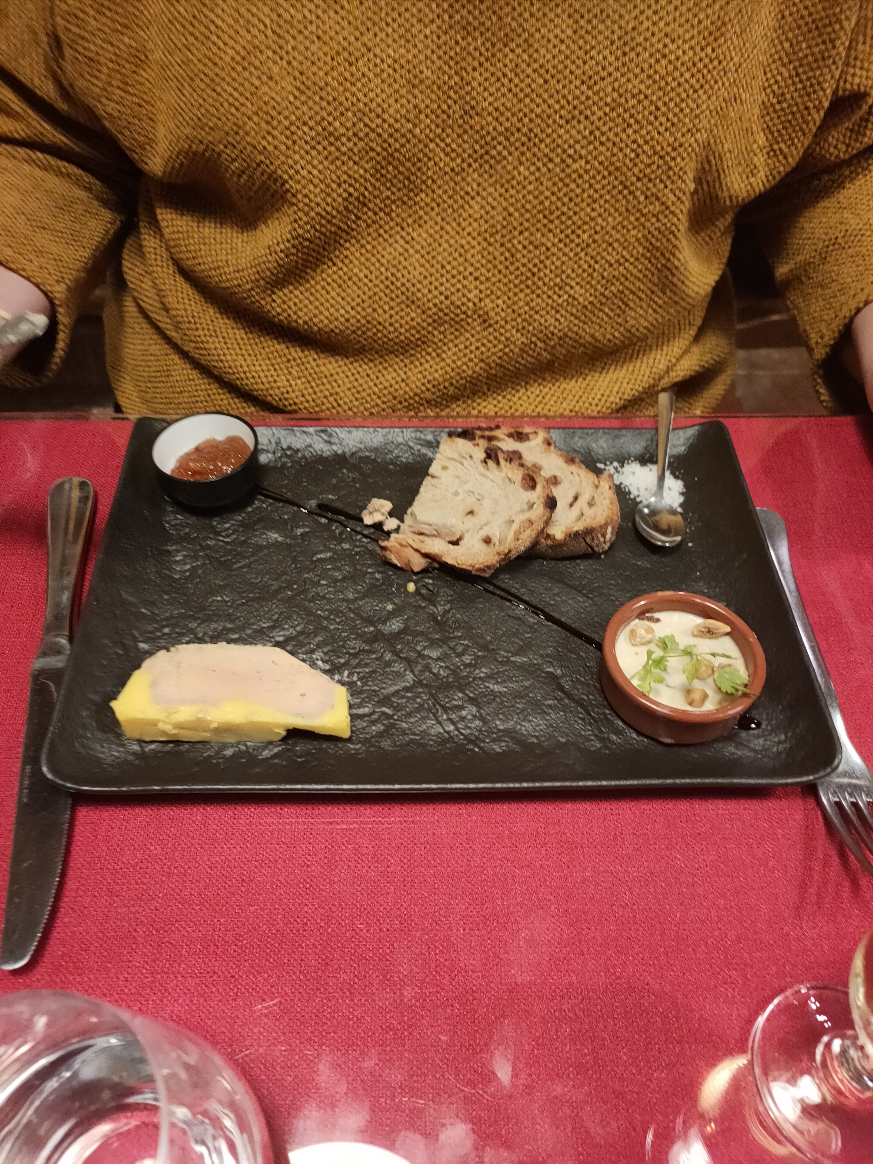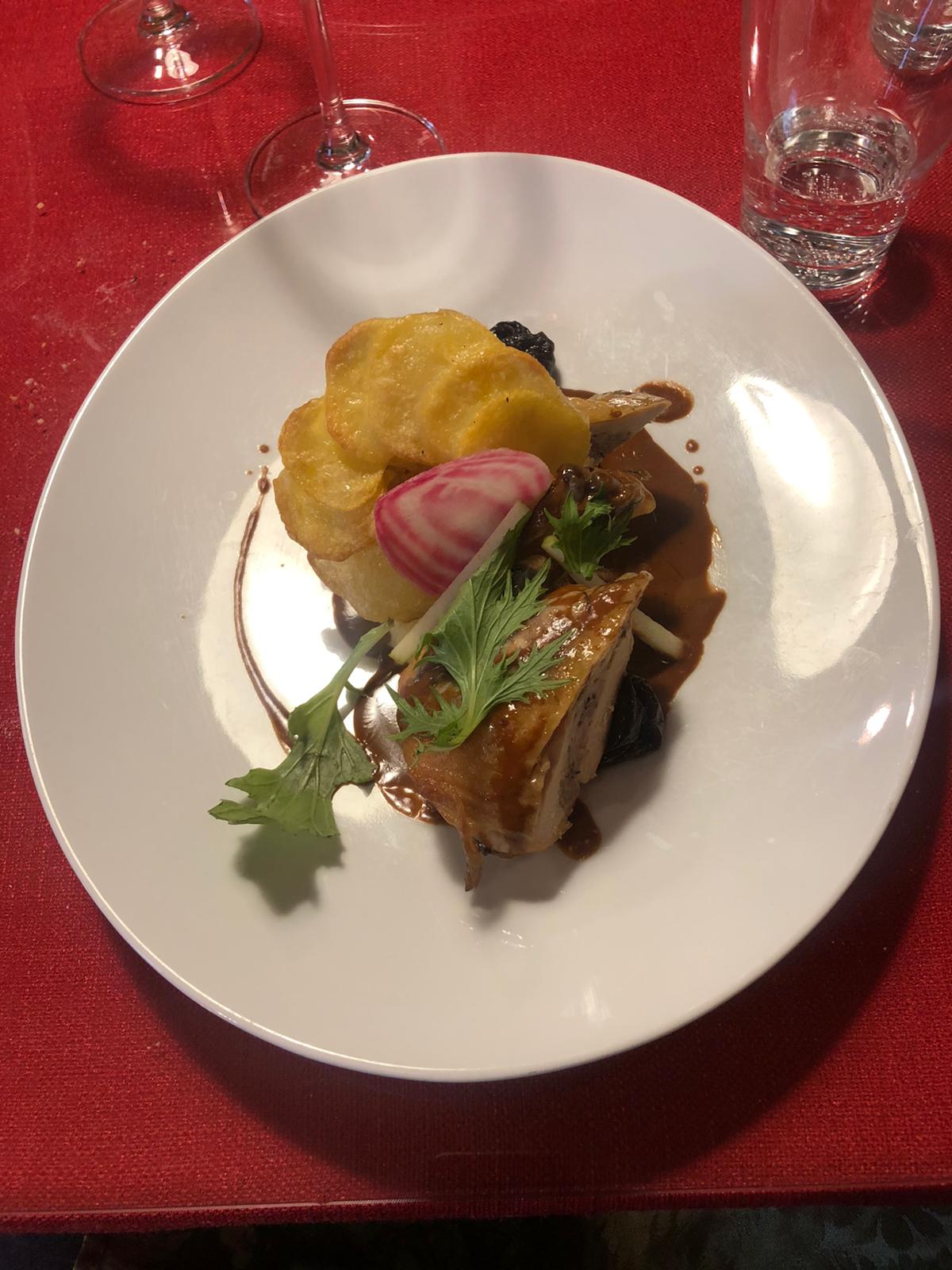L.intérieur du restaurant est agréable par contre très petite proportion caille au foie gras jamais vu ni senti le foie gras servi avec purée j’ai juste eu une trace de purée sous ma minuscule cuise de caille sans foie gras Dessert banal Dés que l’assiette est fini ont nous saute dessus pour servir la suite avec entrée plat dessert en 1 h c’etait expédié plus jamais dans ce restaurant trop cher par rapport à ce que nous avons dans l’assiette