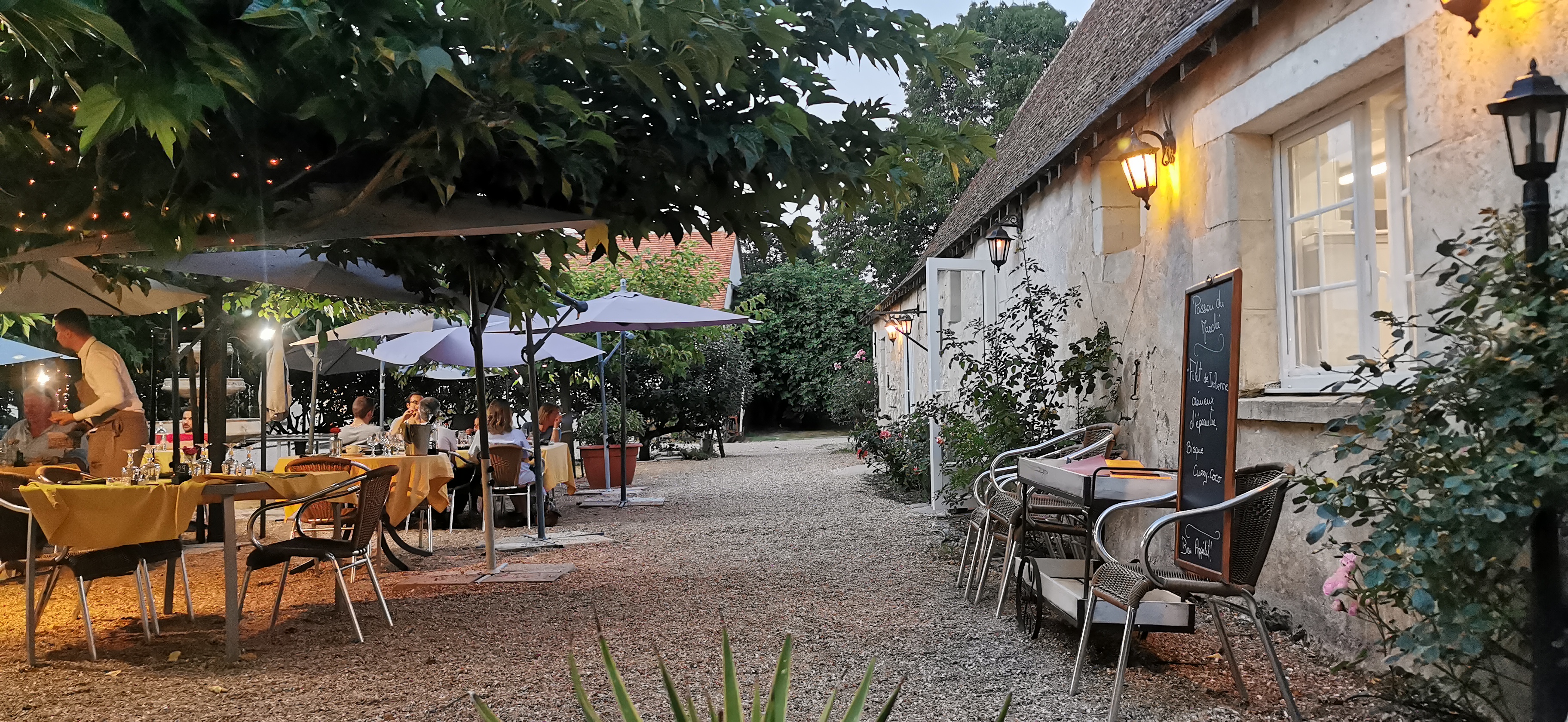 Après la visite du matin au château de Villandry nous avons découvert ce restaurant à 10mn à peine de voiture par rapport au château. Situé dans un petit coin de campagne bien que très proche du centre-ville, l'endroit est charmant sous ombrages et parasols avec le bruit d'une petite fontaine qui ajoute une paisibilité supplémentaire en ces lieux. L'ardoise y est gourmande et abordable avec un service à l'écoute. Je recommande.